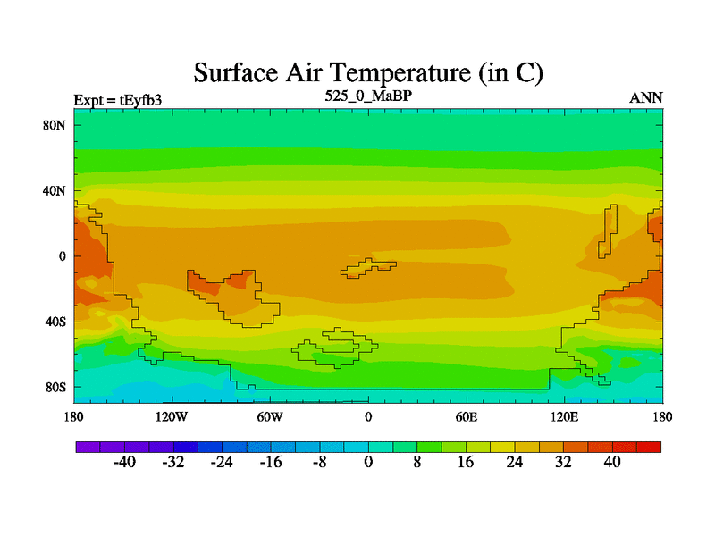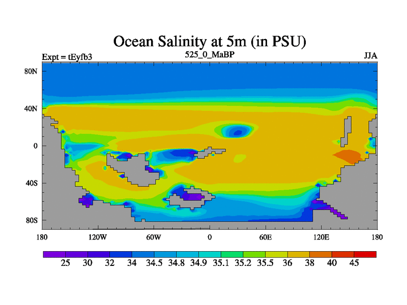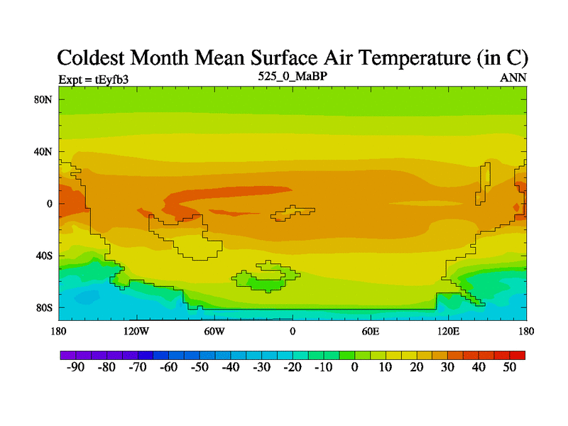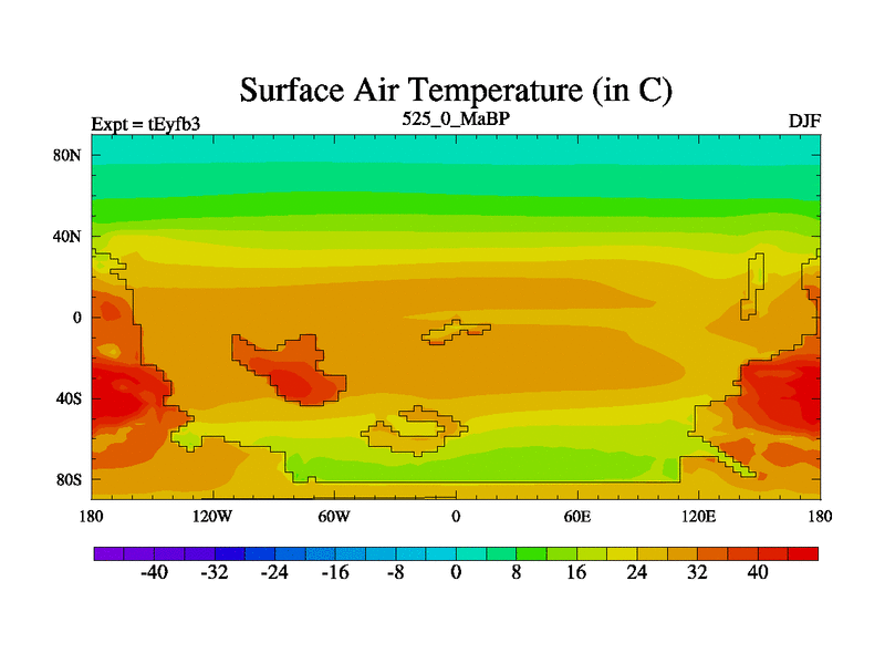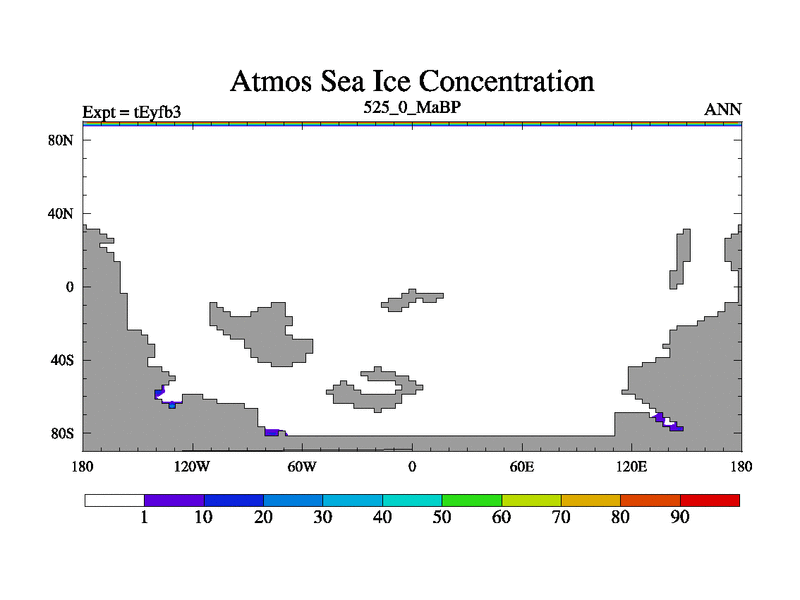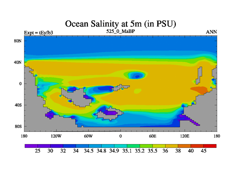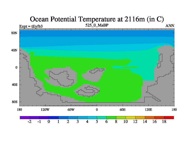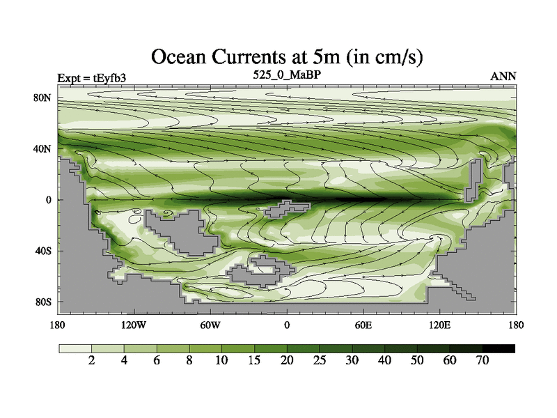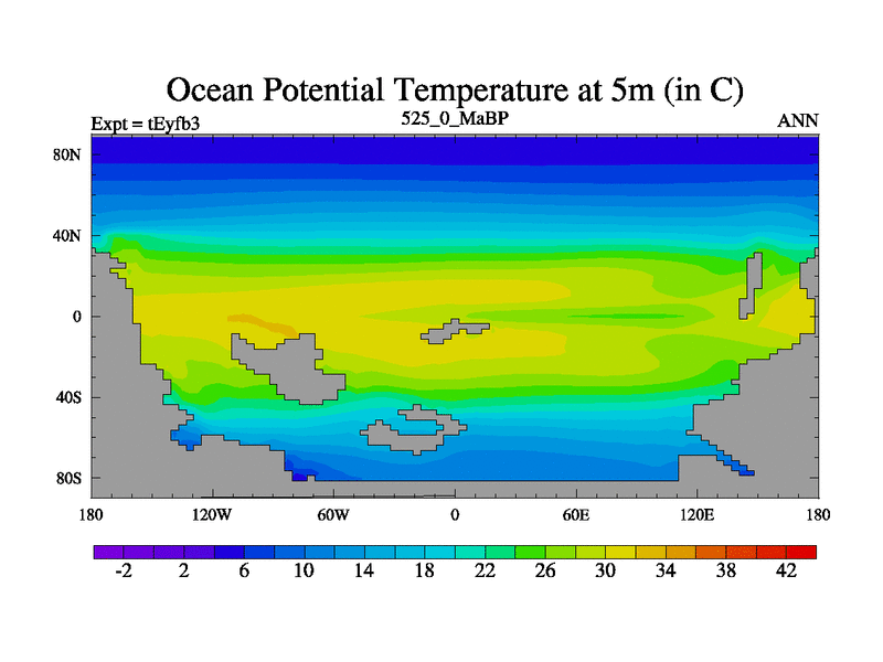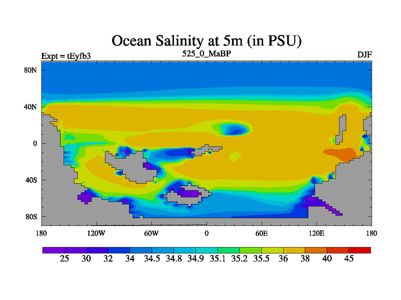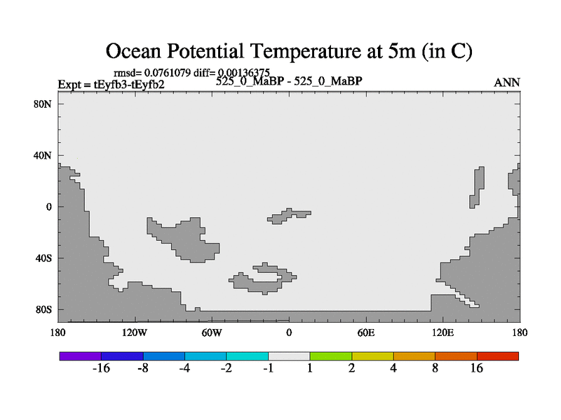 This is the 525.0 Ma simulation using the Scotese palaeogeographies and revised CCN etc. Updated HadCM3L ocean parameters and soil parameters. Also made sure orography gravity wave drag was consistent.