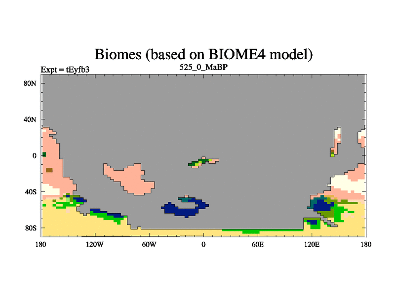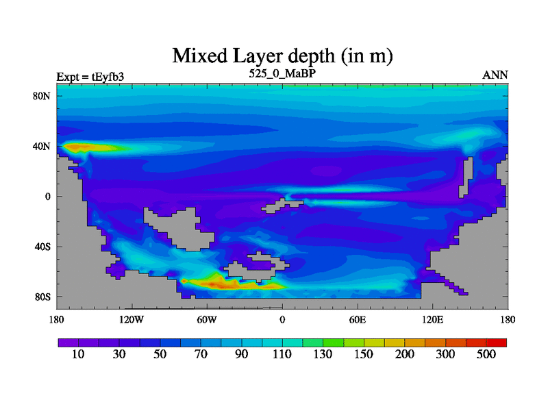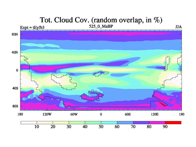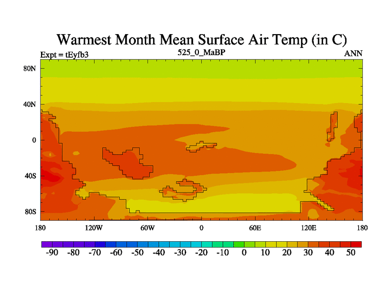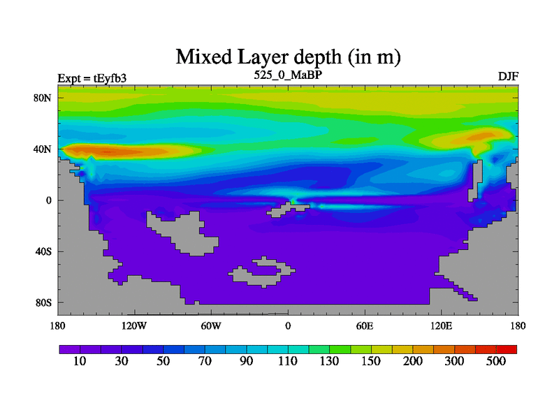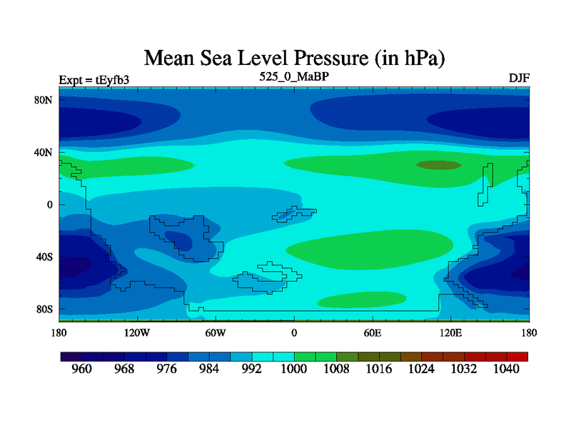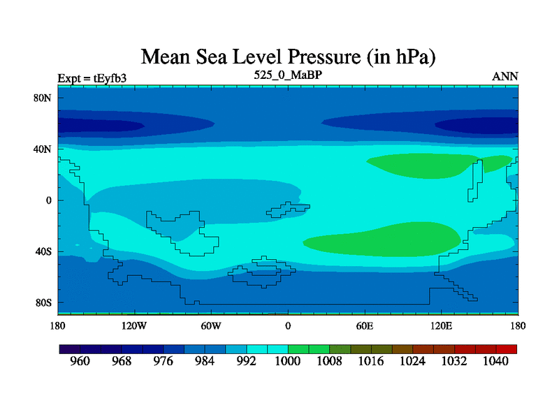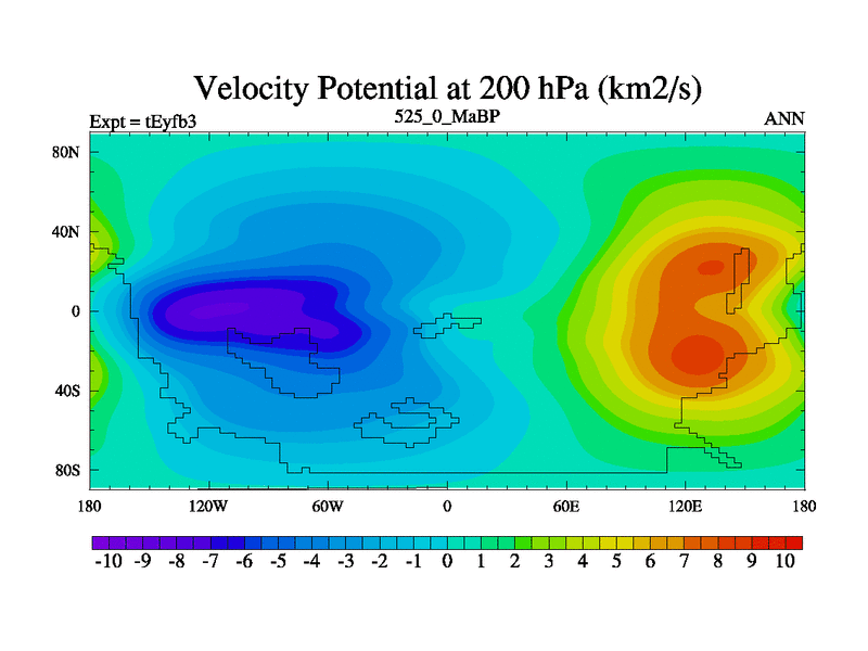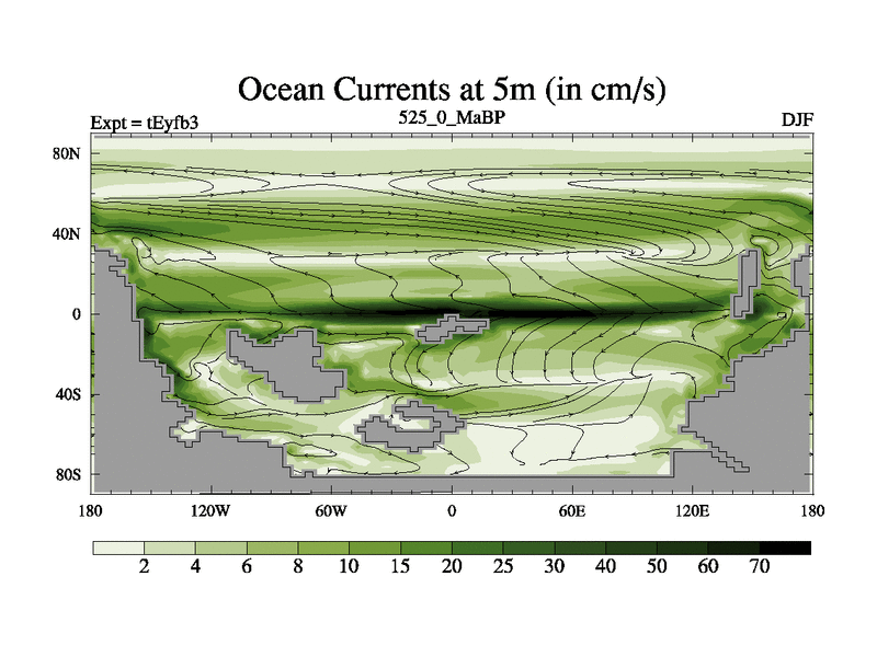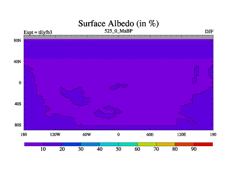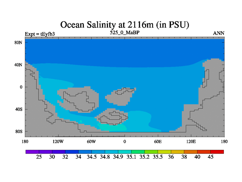 This is the 525.0 Ma simulation using the Scotese palaeogeographies and revised CCN etc. Updated HadCM3L ocean parameters and soil parameters. Also made sure orography gravity wave drag was consistent.