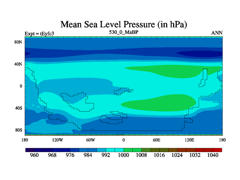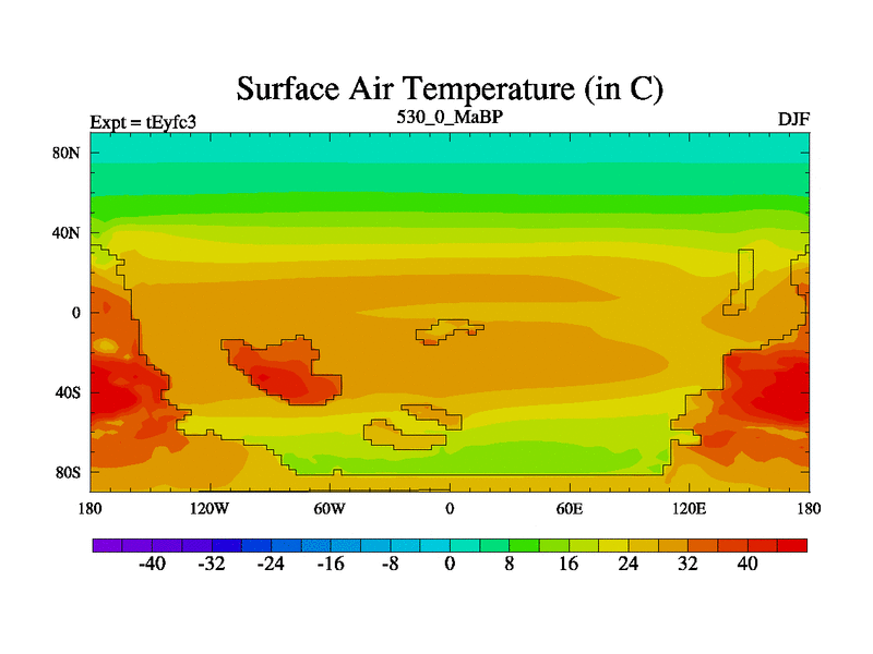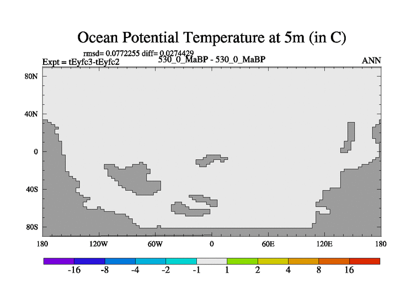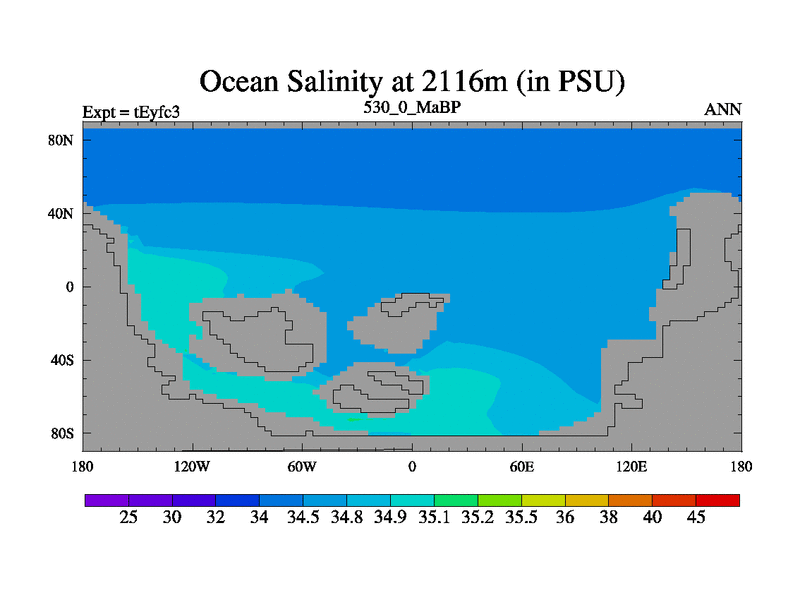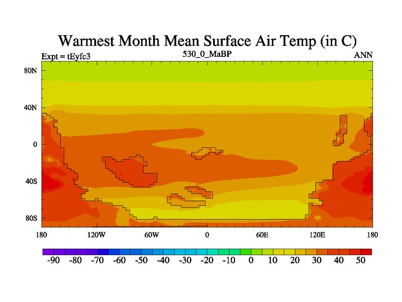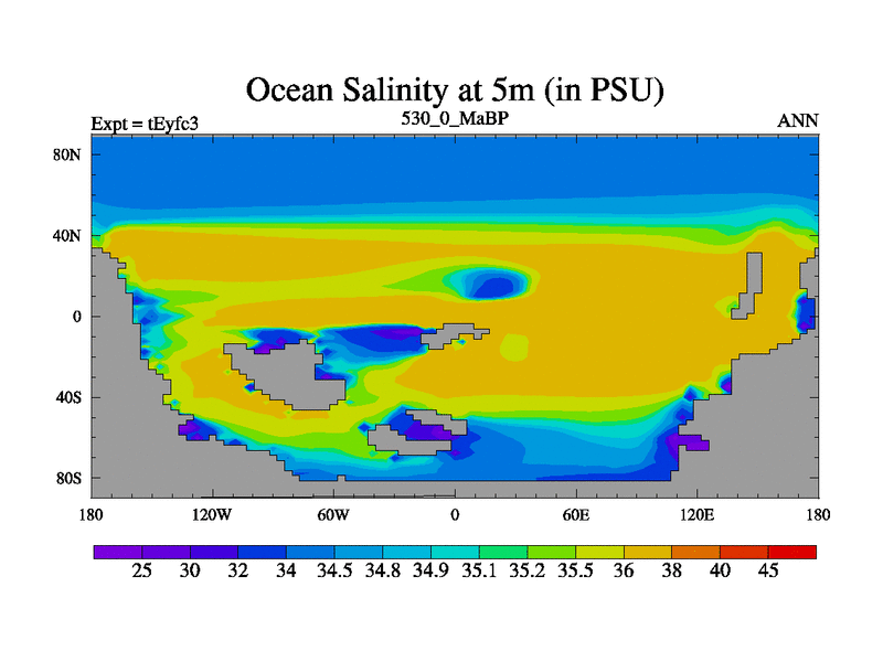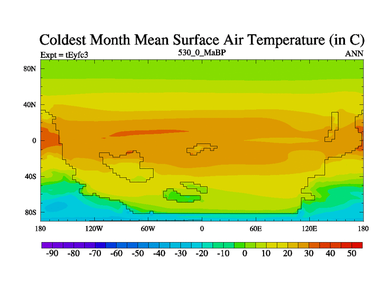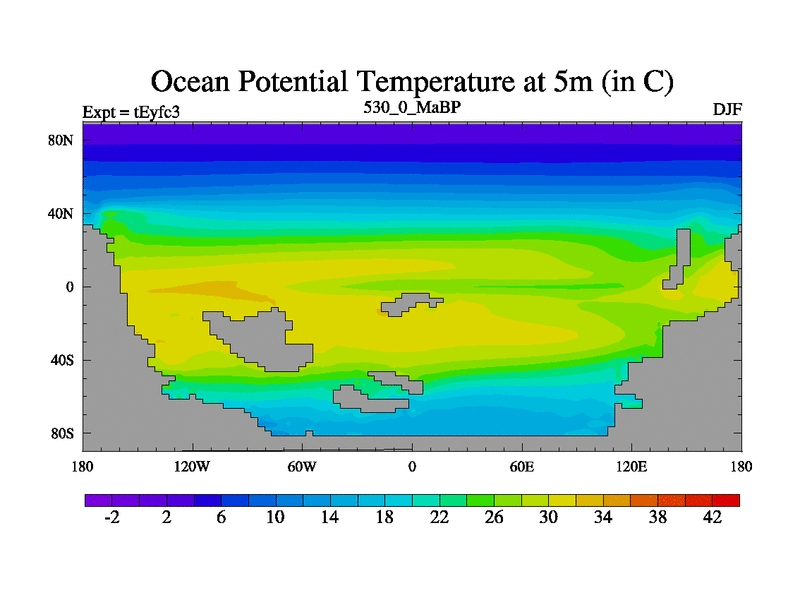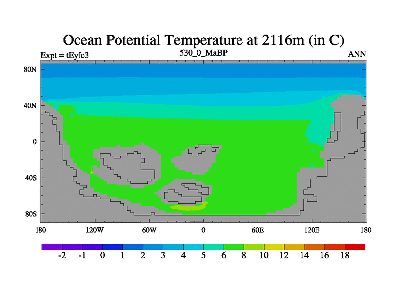 This is the 530.0 Ma simulation using the Scotese palaeogeographies and revised CCN etc. Updated HadCM3L ocean parameters and soil parameters. Also made sure orography gravity wave drag was consistent.