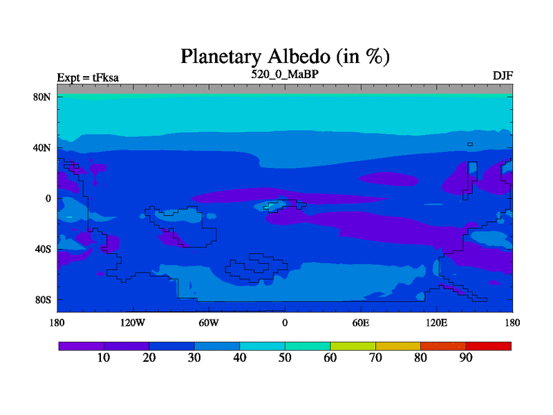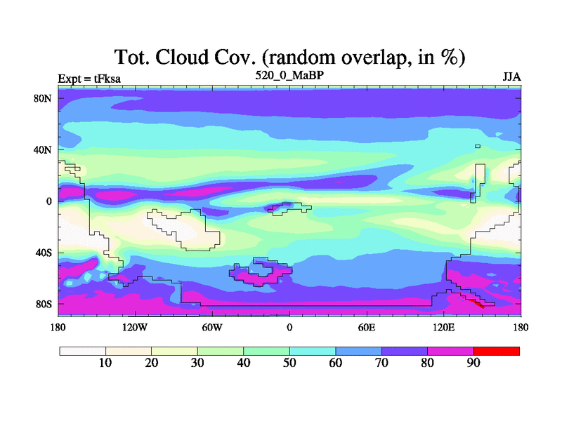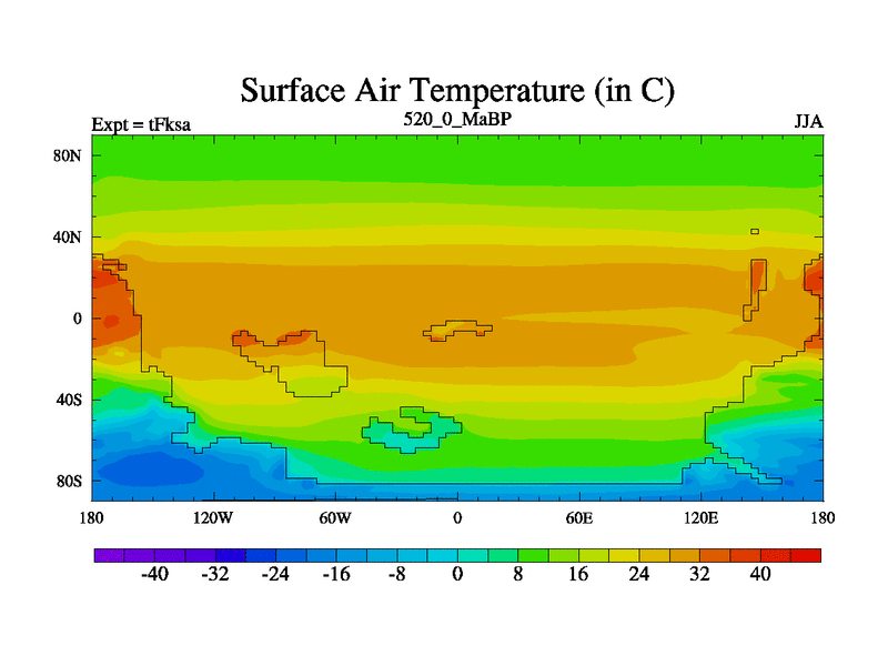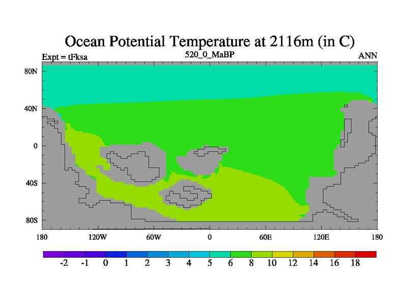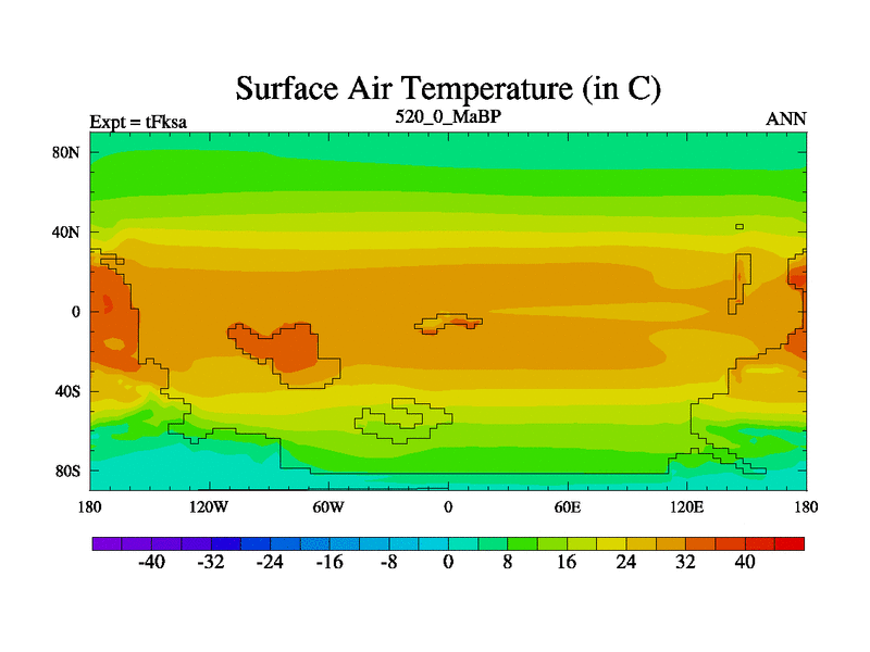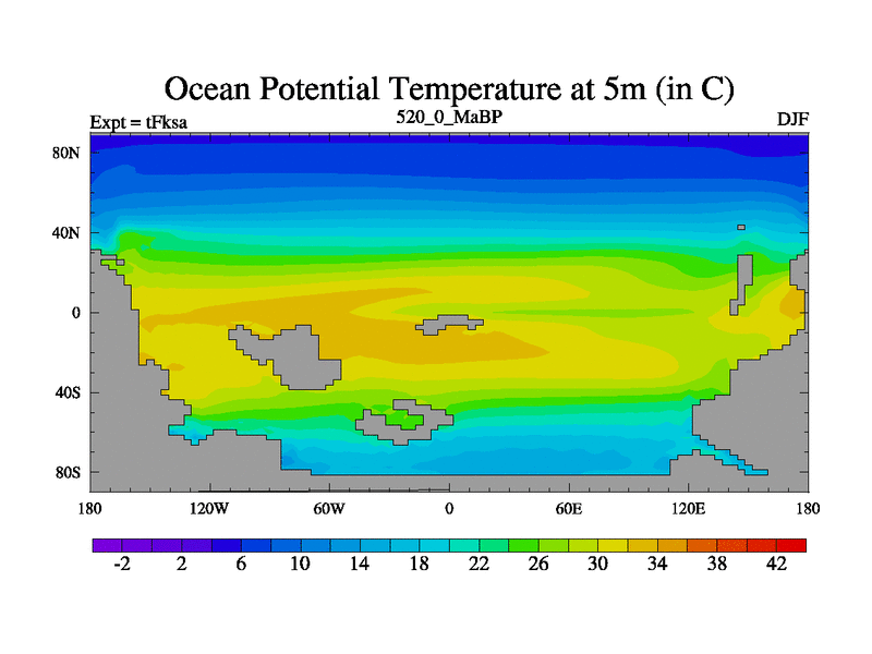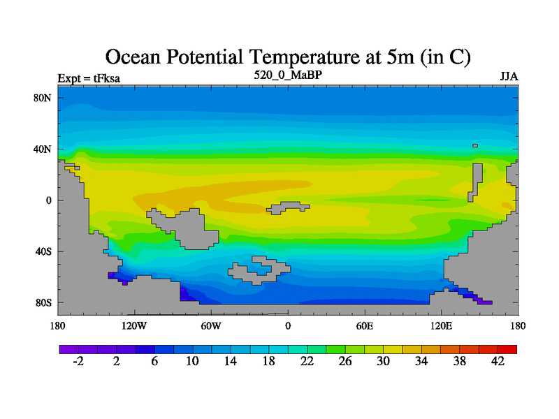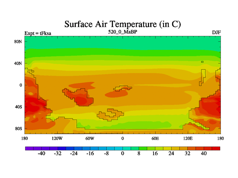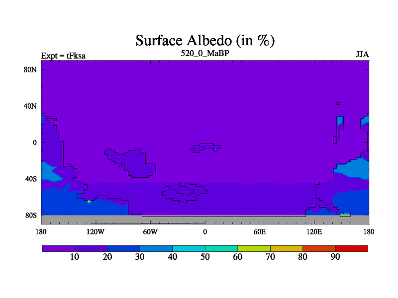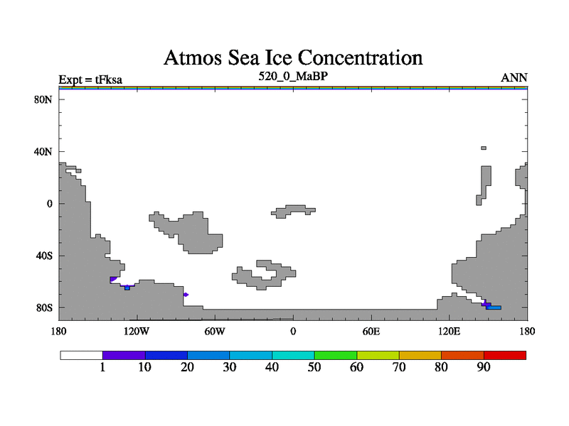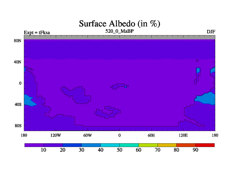 This is the 520.0 Ma simulation using the Scotese palaeogeographies and revised CCN etc. This version has islands and smoothing and desert albedo included. Tuned CO2 to give Scotese temperatures. Started from end of tFkea.
