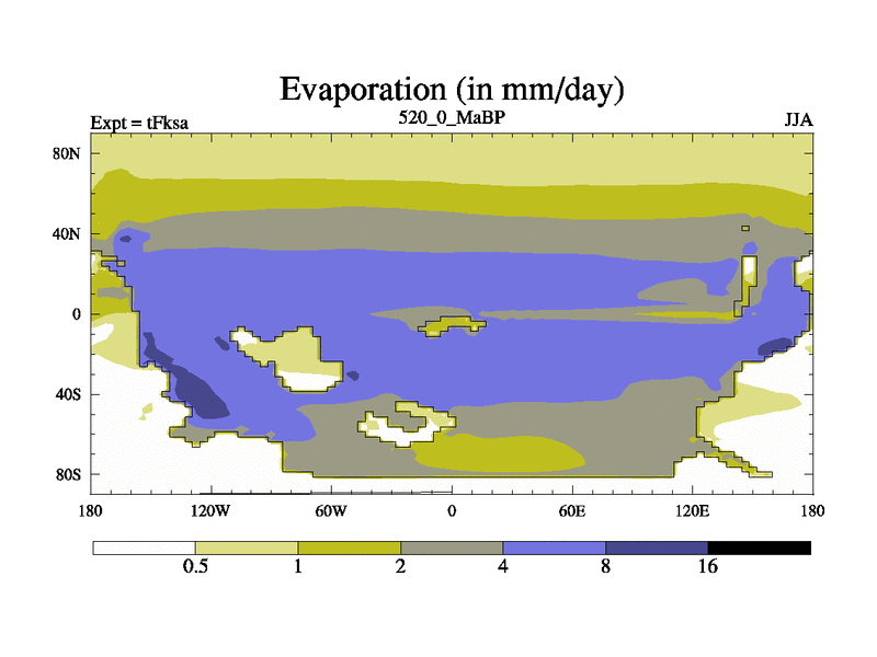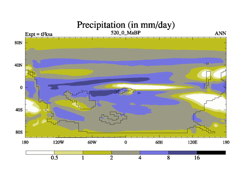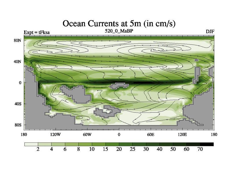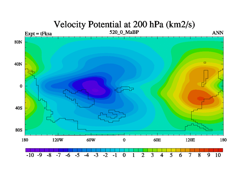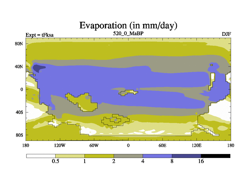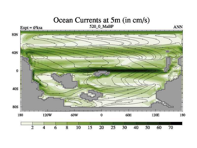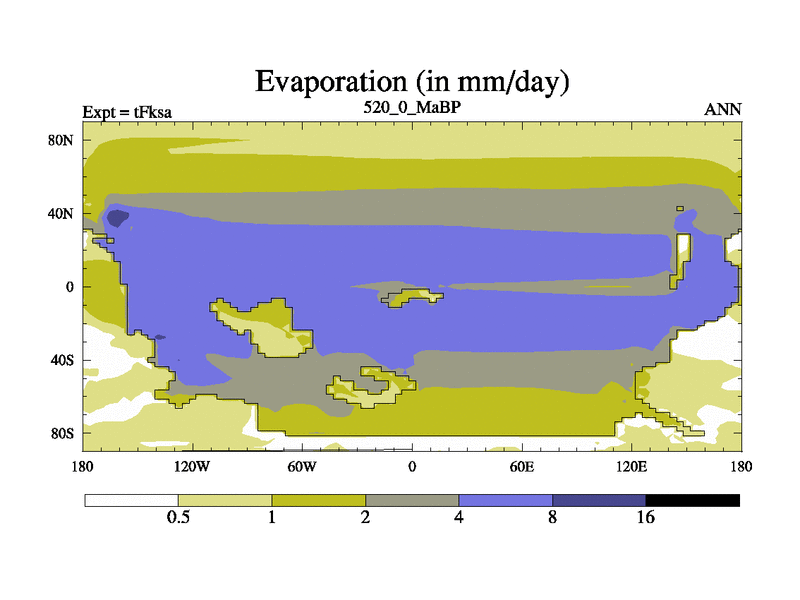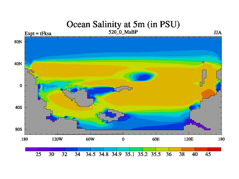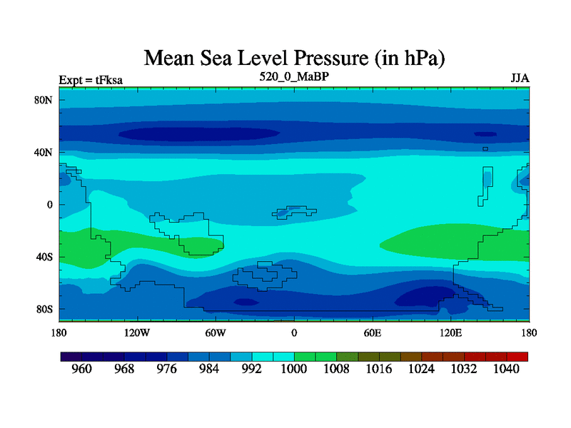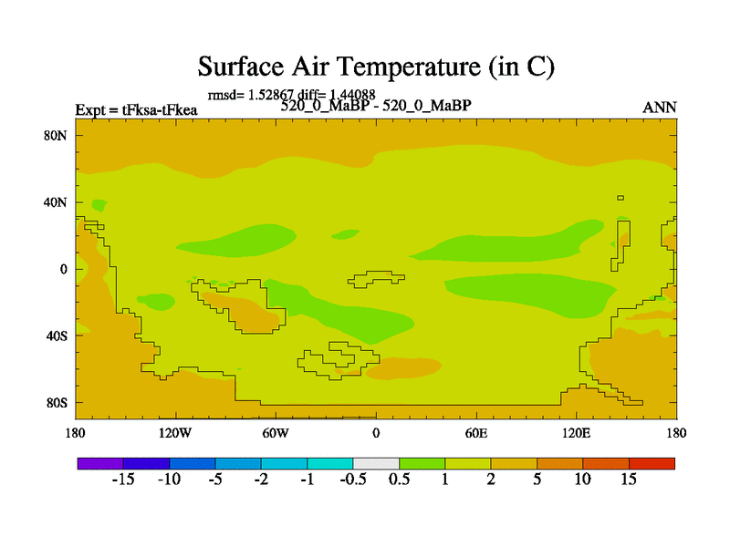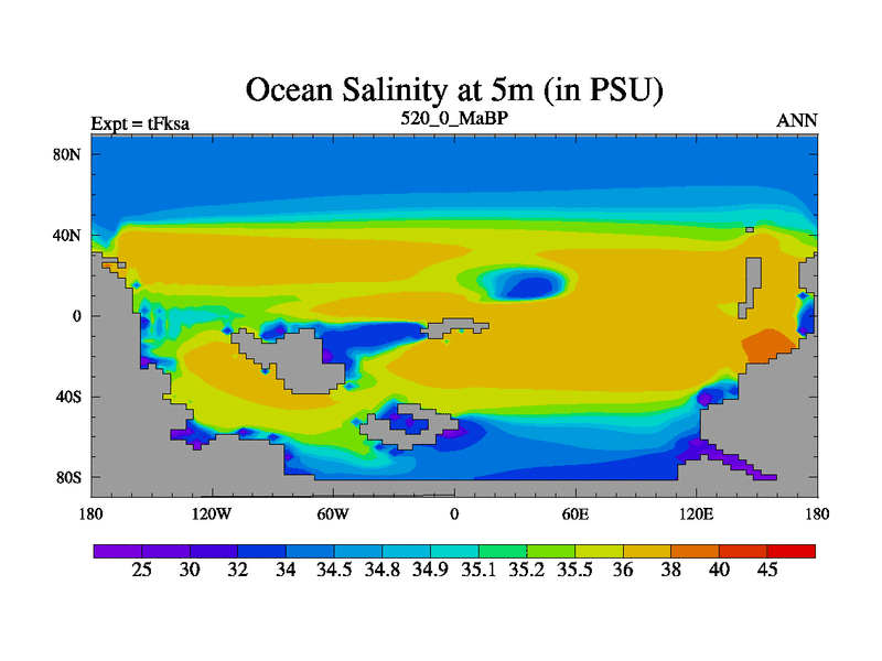 This is the 520.0 Ma simulation using the Scotese palaeogeographies and revised CCN etc. This version has islands and smoothing and desert albedo included. Tuned CO2 to give Scotese temperatures. Started from end of tFkea.