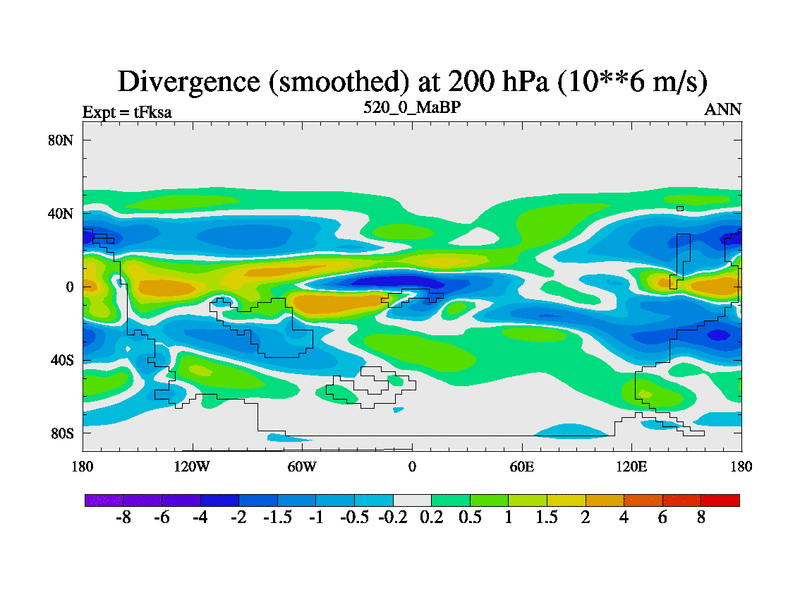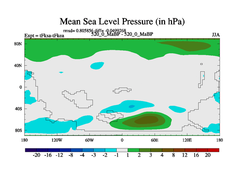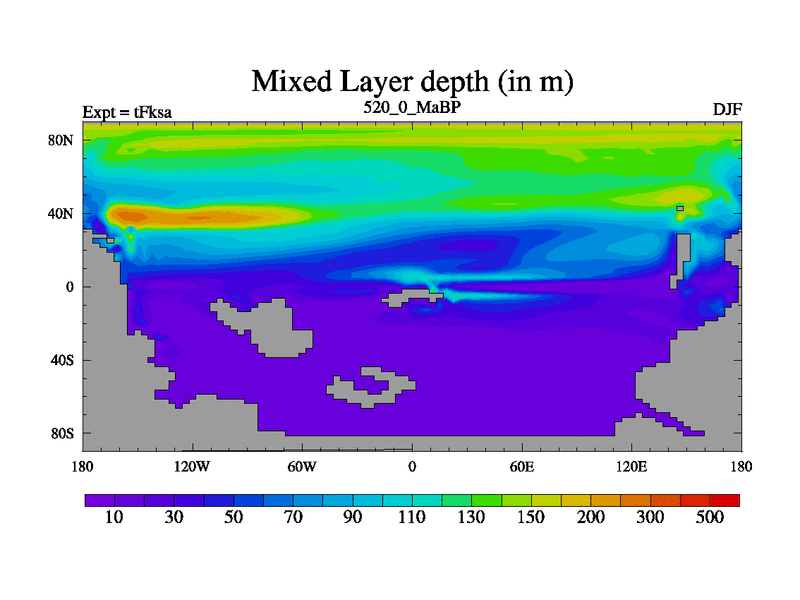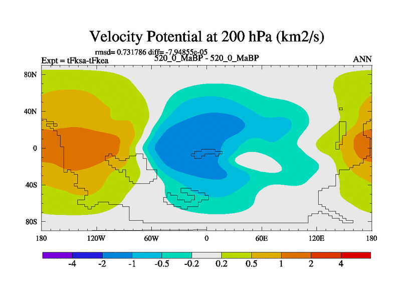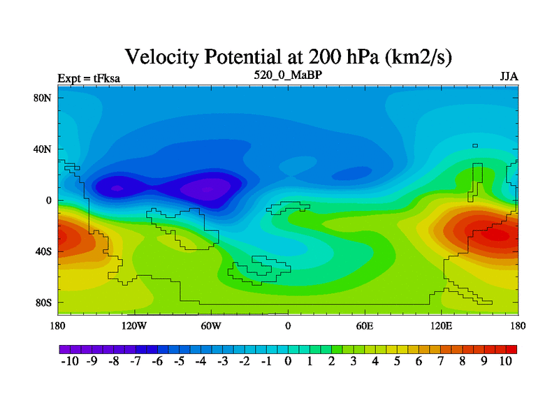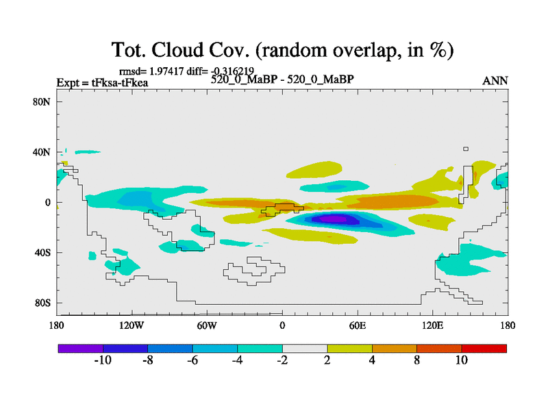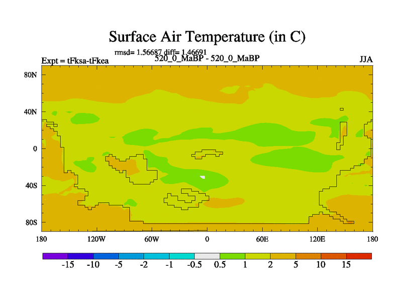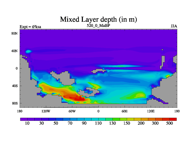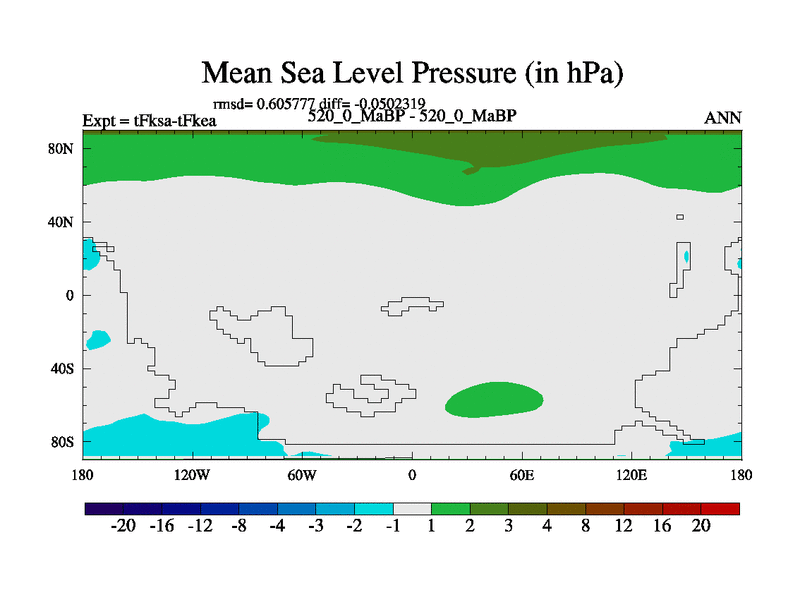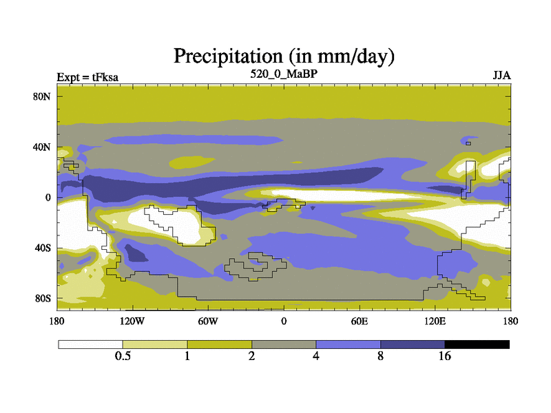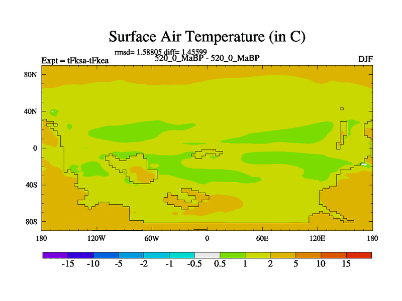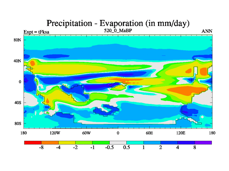 This is the 520.0 Ma simulation using the Scotese palaeogeographies and revised CCN etc. This version has islands and smoothing and desert albedo included. Tuned CO2 to give Scotese temperatures. Started from end of tFkea.