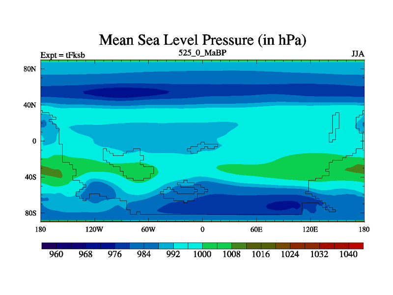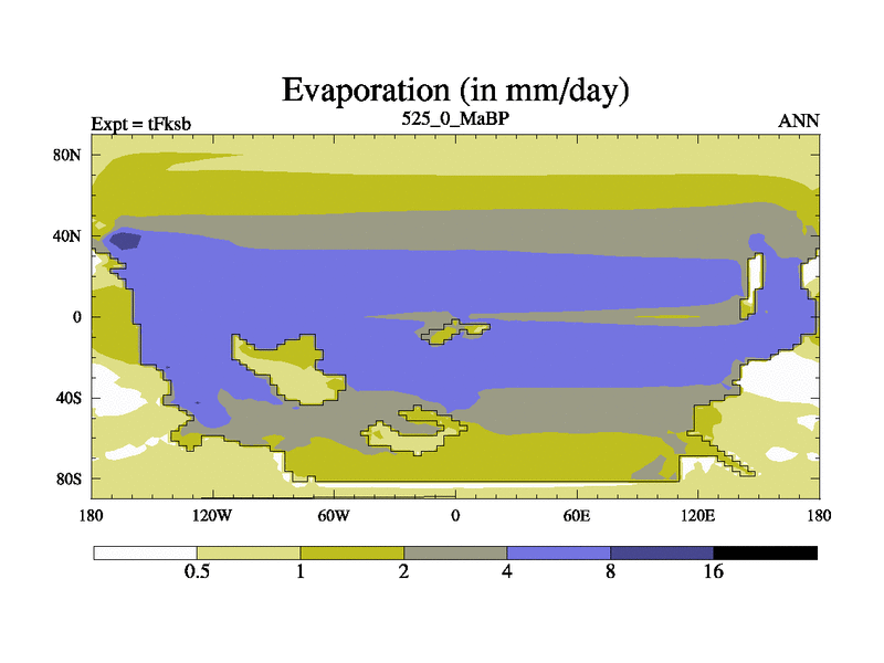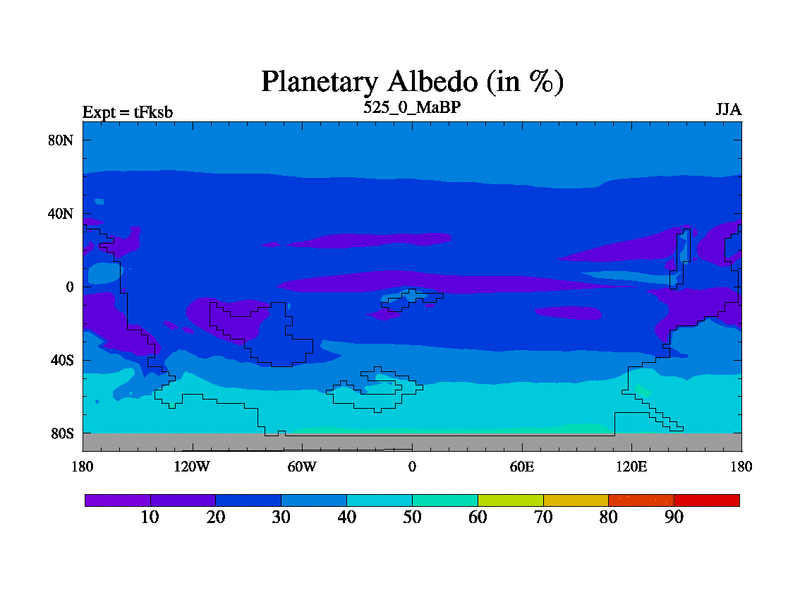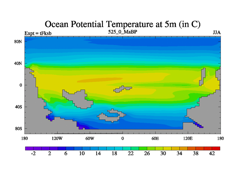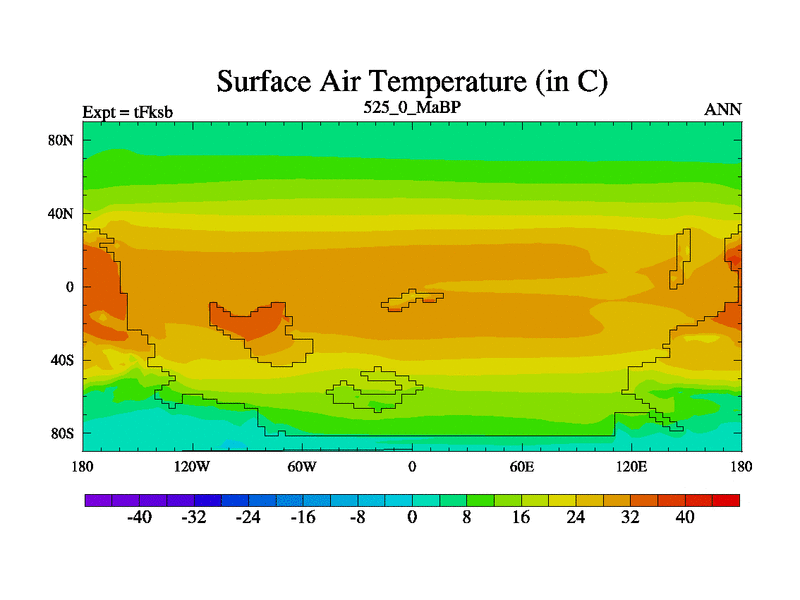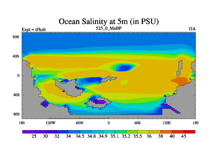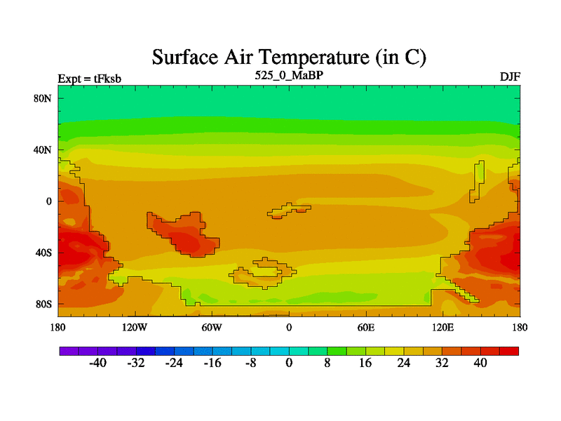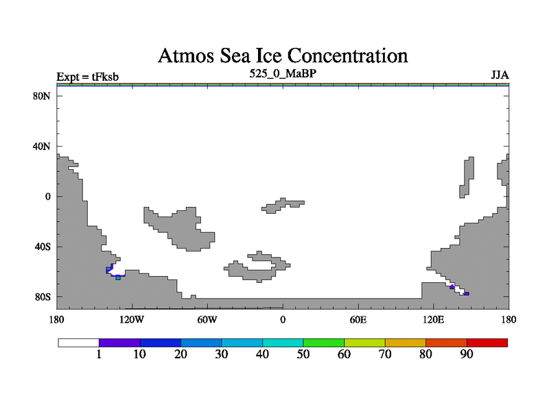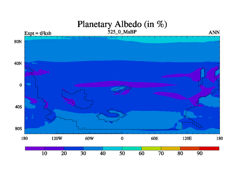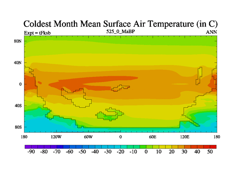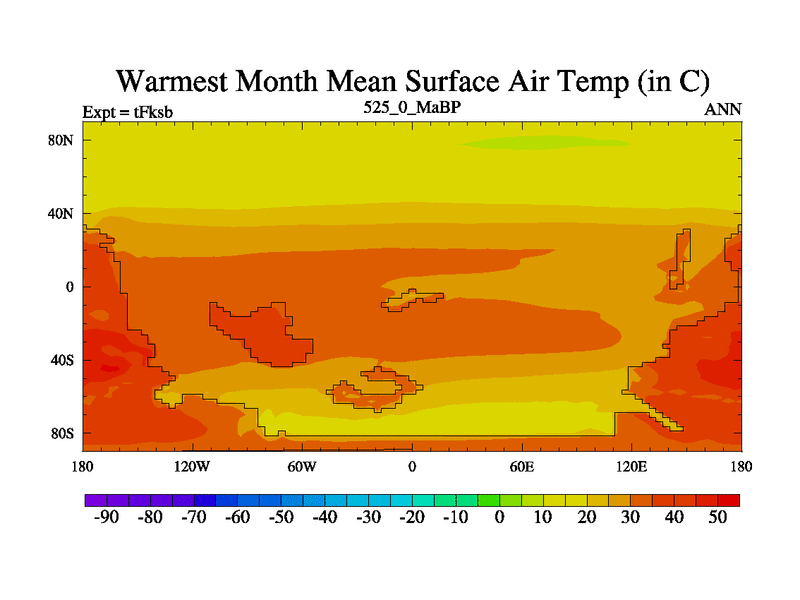 This is the 525.0 Ma simulation using the Scotese palaeogeographies and revised CCN etc. This version has islands and smoothing and desert albedo included. Tuned CO2 to give Scotese temperatures. Started from end of tFkeb.