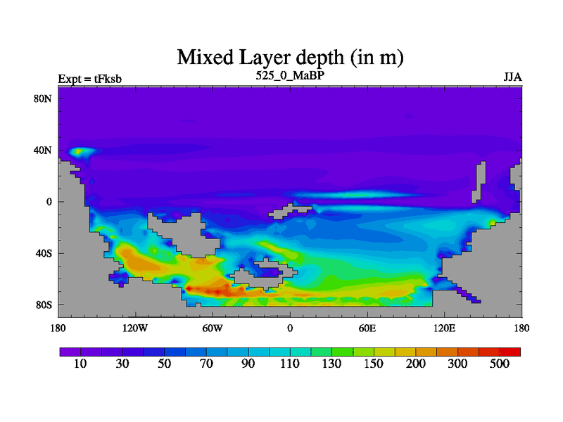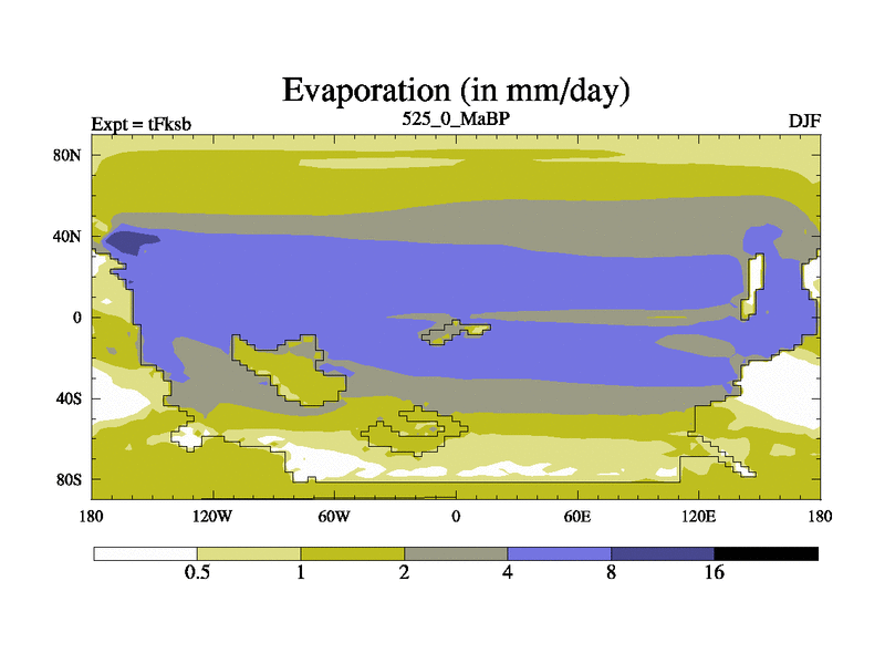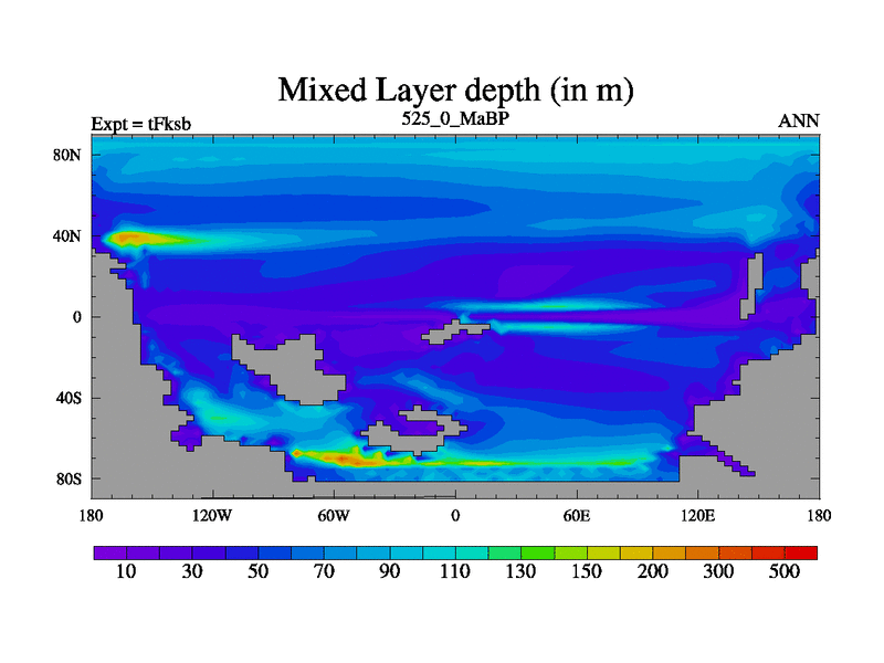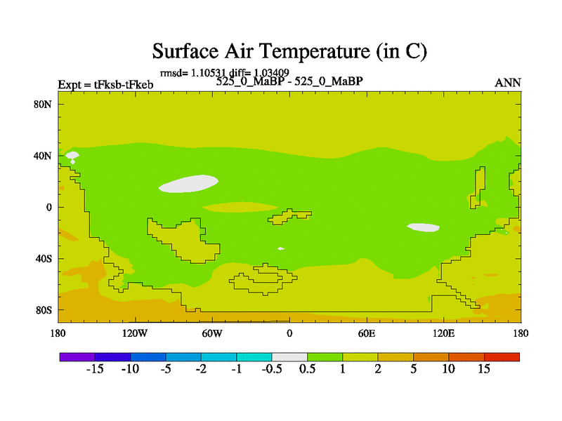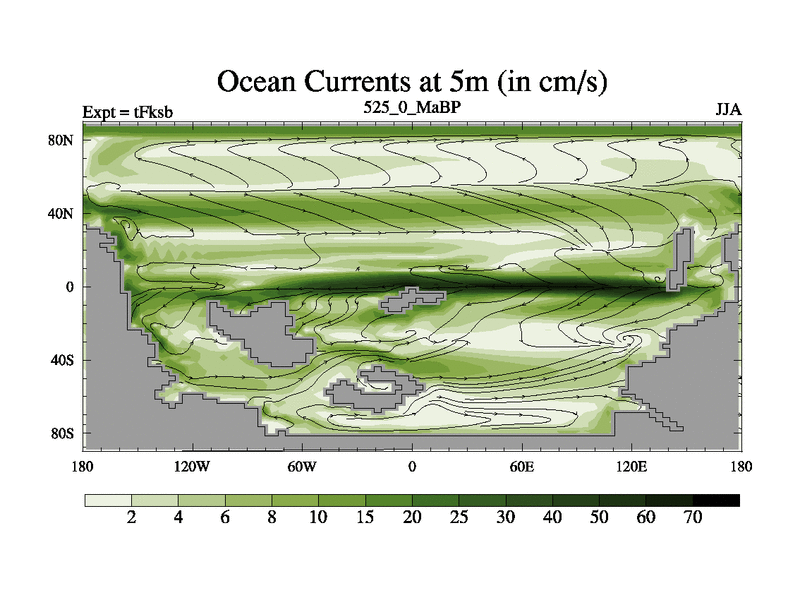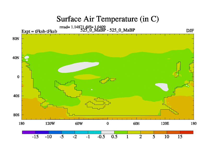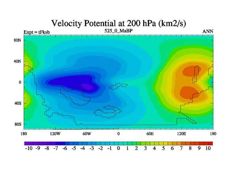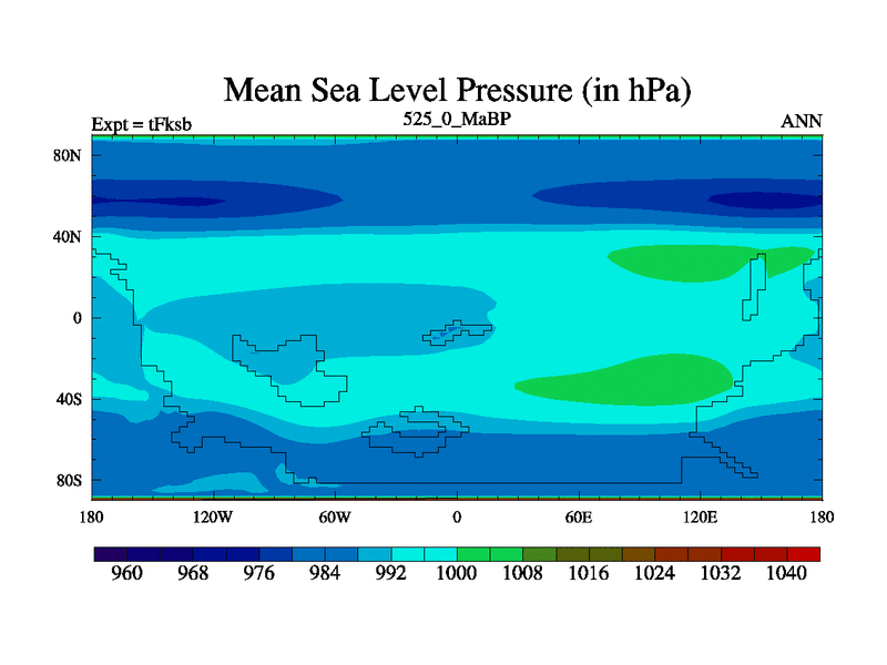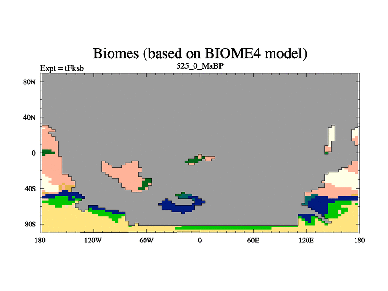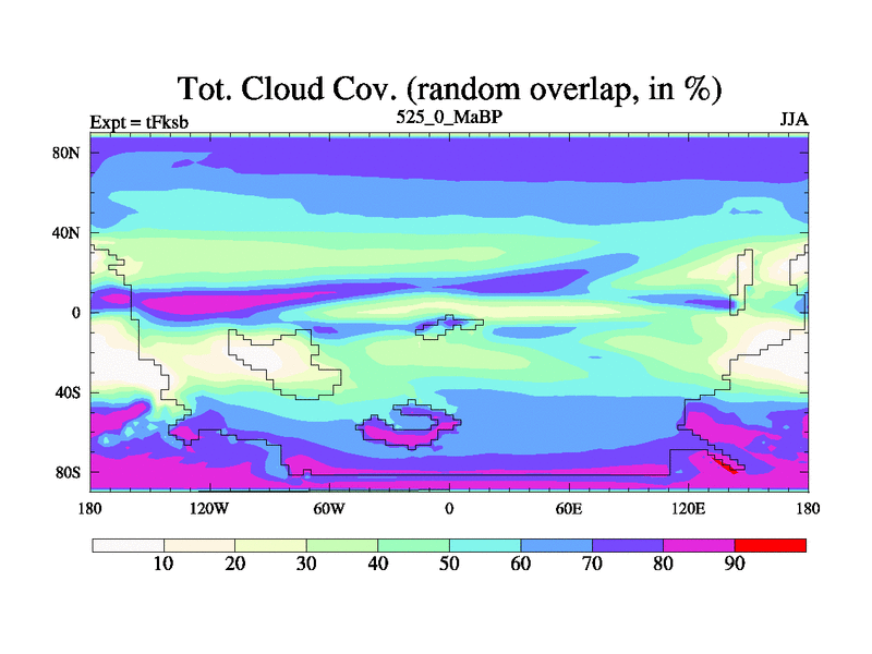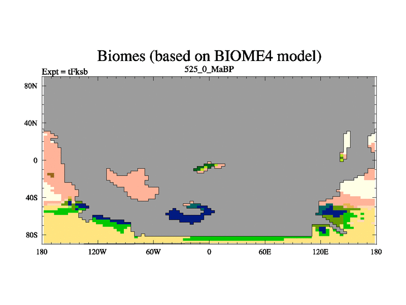 This is the 525.0 Ma simulation using the Scotese palaeogeographies and revised CCN etc. This version has islands and smoothing and desert albedo included. Tuned CO2 to give Scotese temperatures. Started from end of tFkeb.