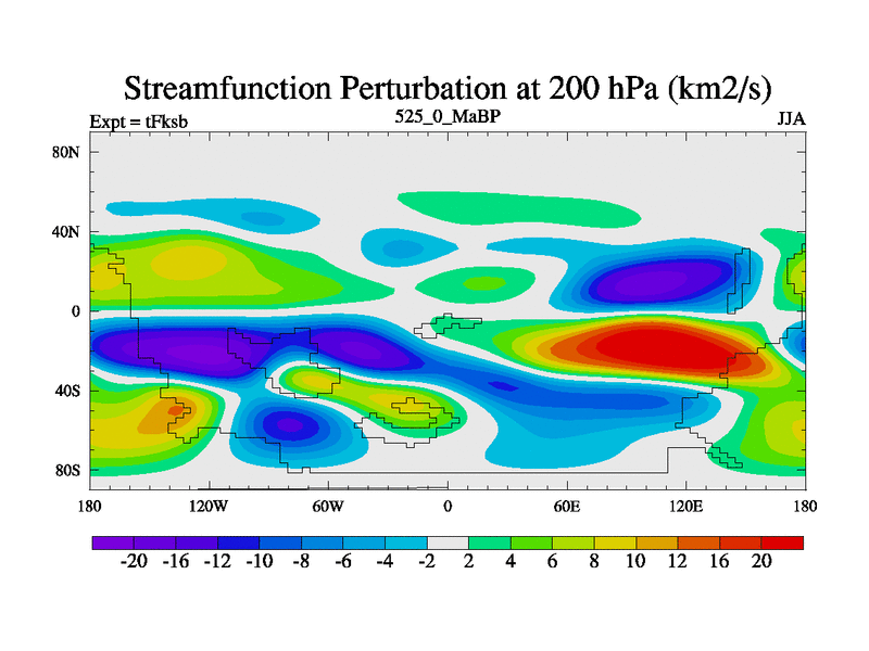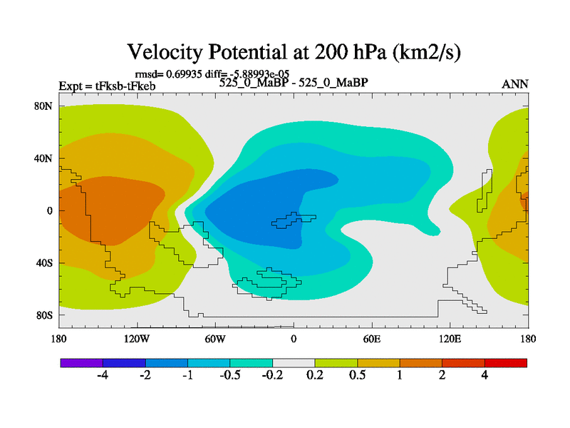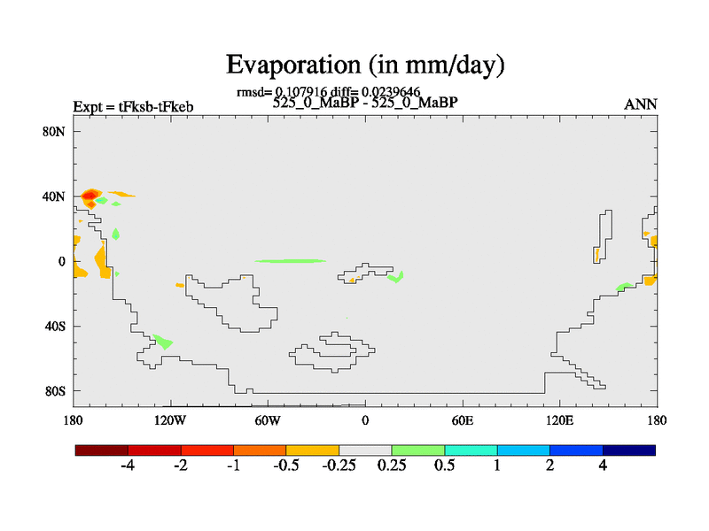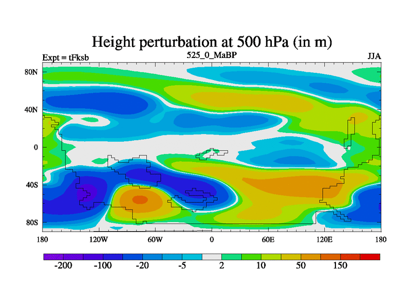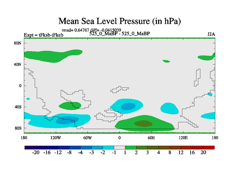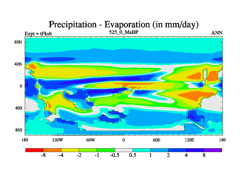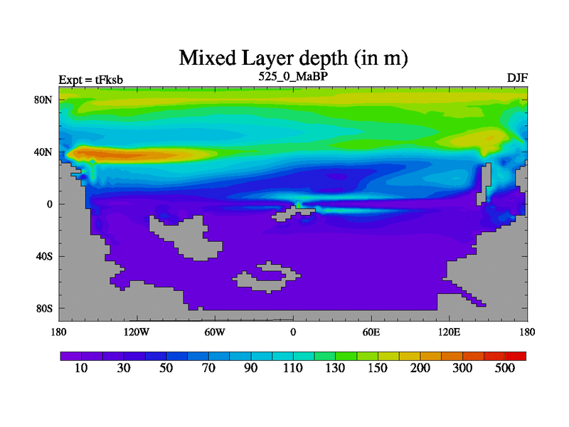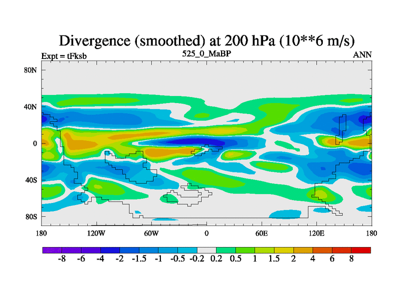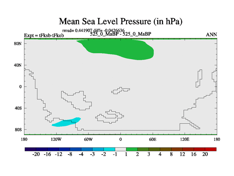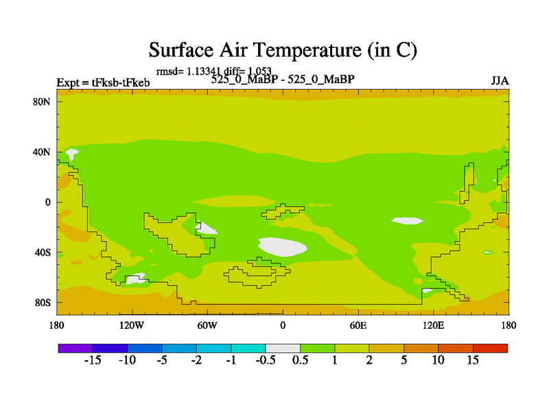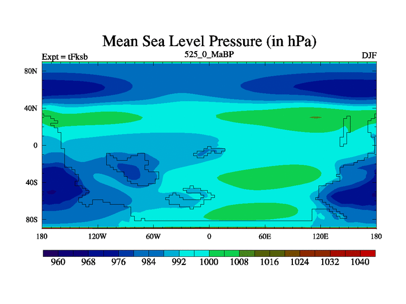 This is the 525.0 Ma simulation using the Scotese palaeogeographies and revised CCN etc. This version has islands and smoothing and desert albedo included. Tuned CO2 to give Scotese temperatures. Started from end of tFkeb.