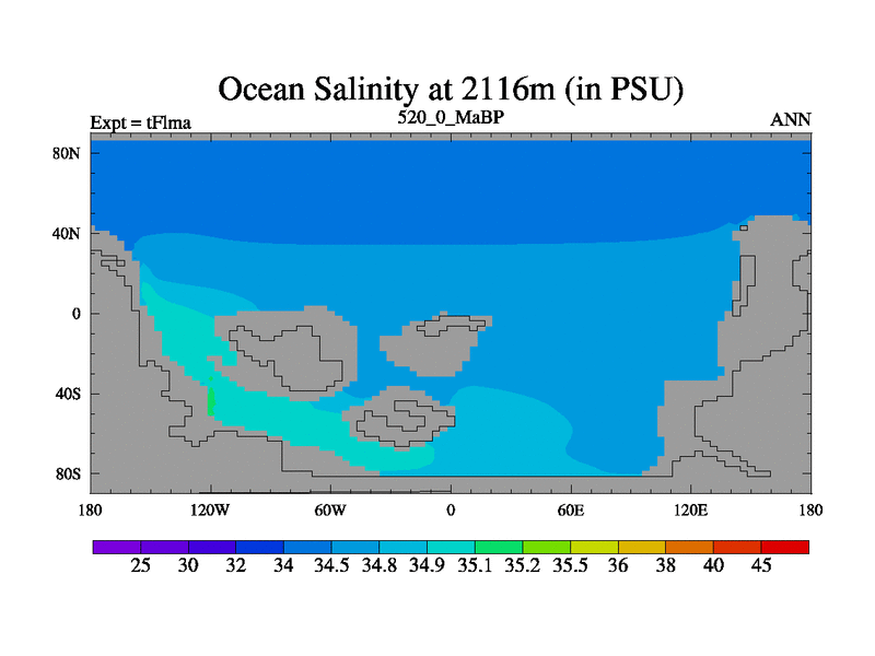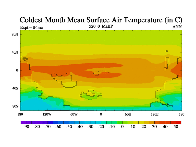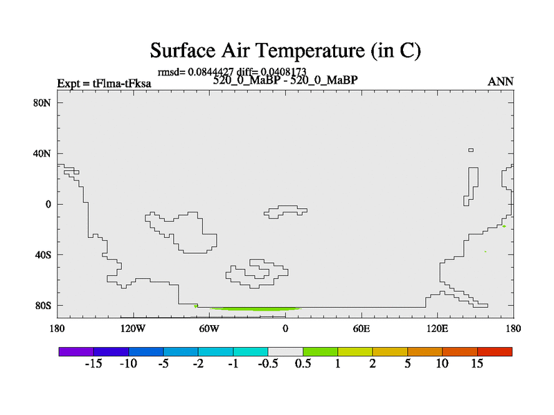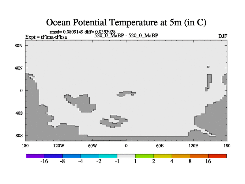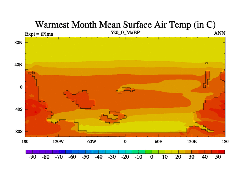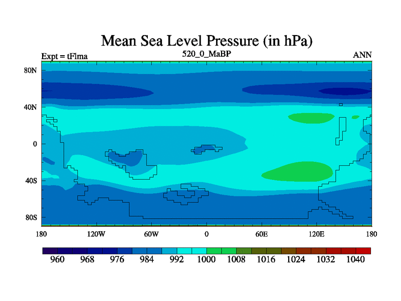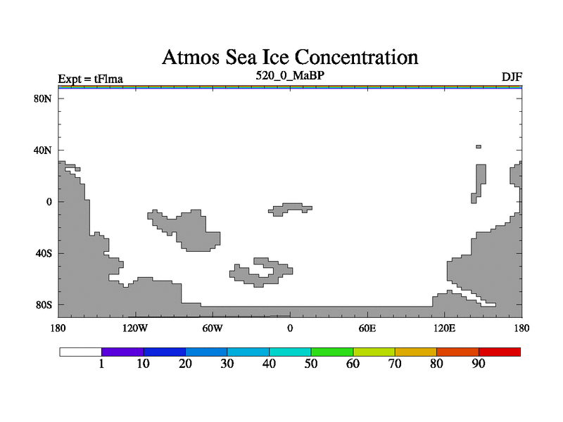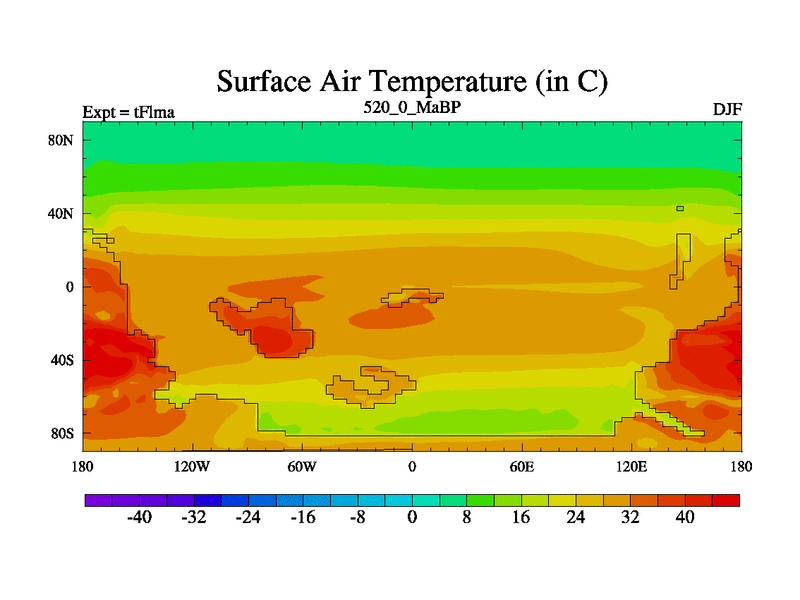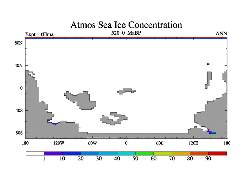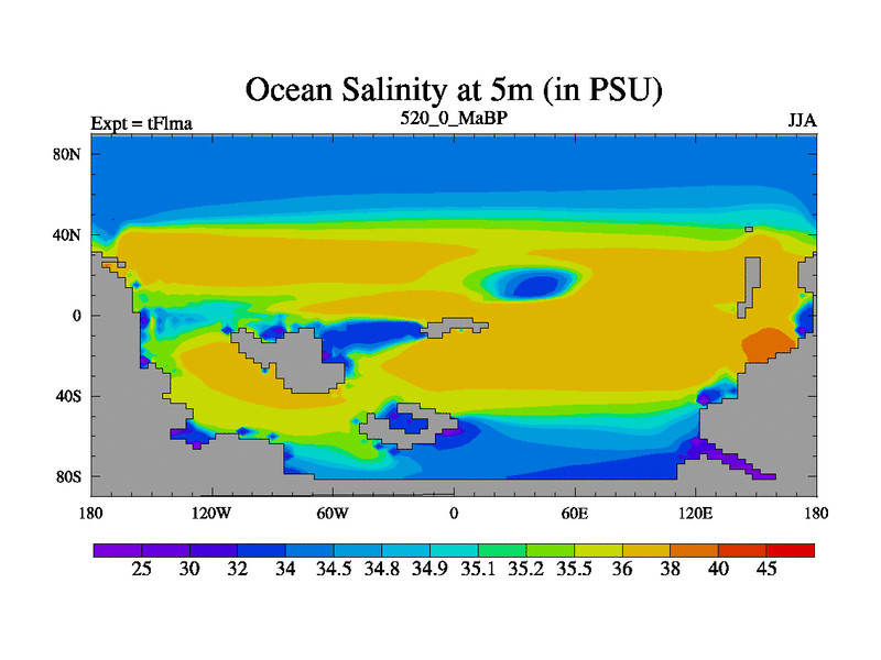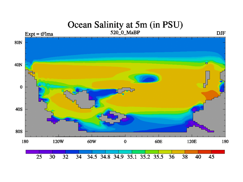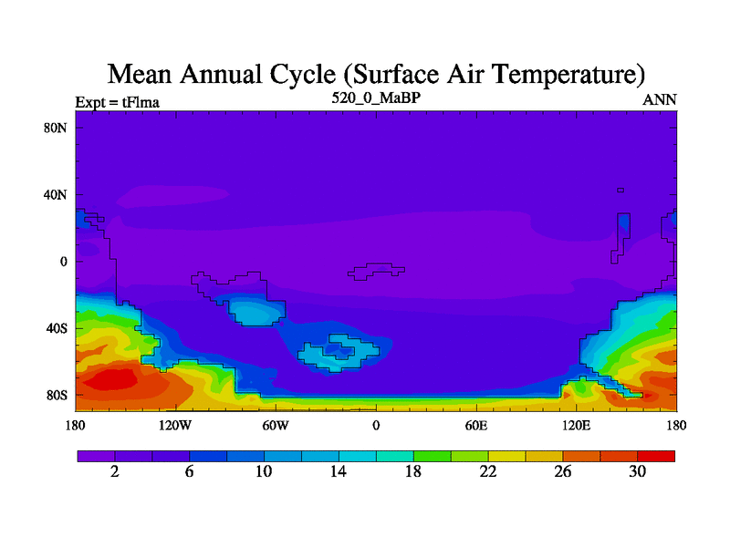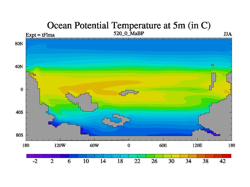 This is the 520.0 Ma simulation using the Scotese palaeogeographies and revised CCN etc. This version has islands and smoothing and desert albedo included. Tuned CO2 to give Scotese temperatures. Started from end of tFksa. With JEDI output.