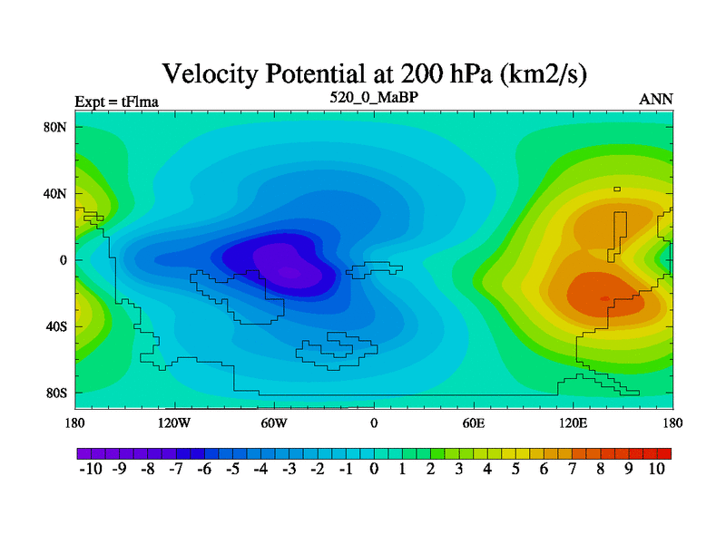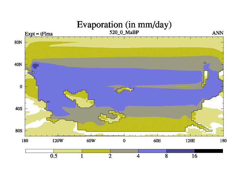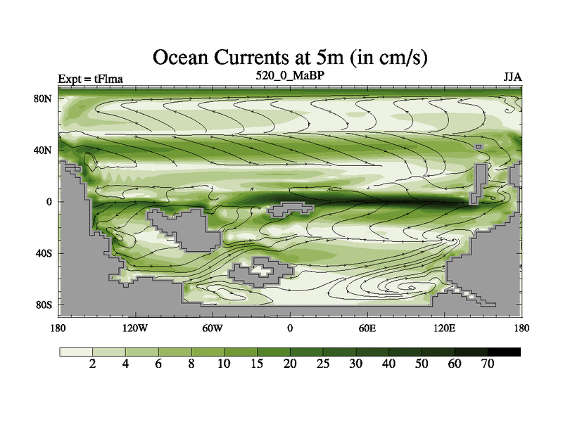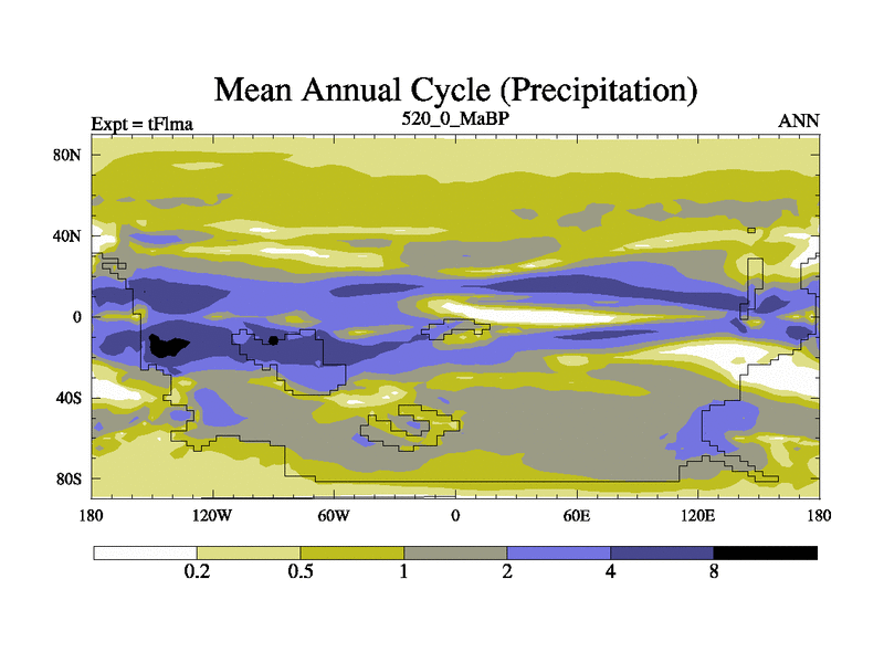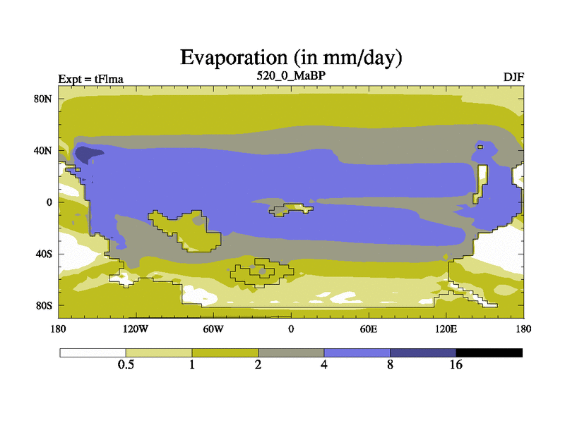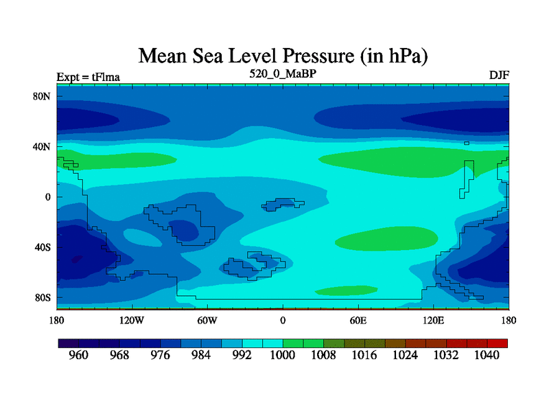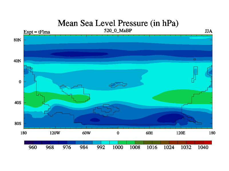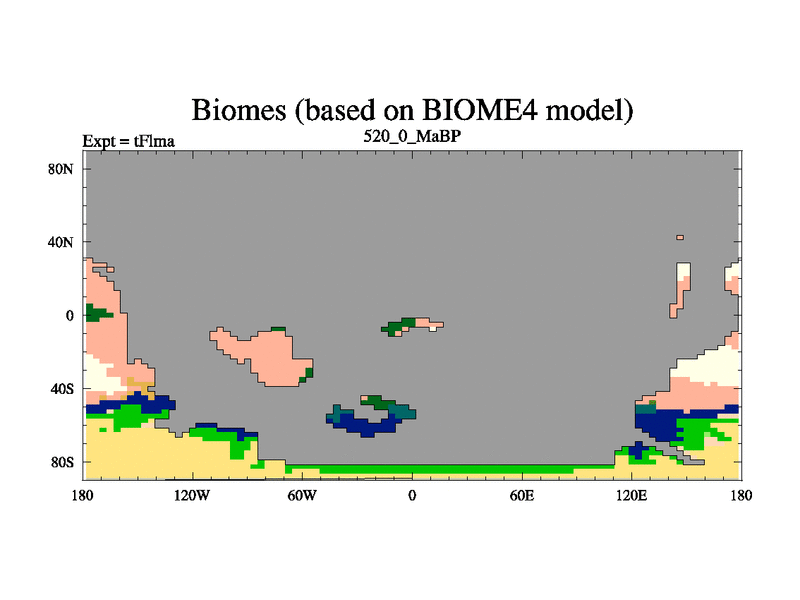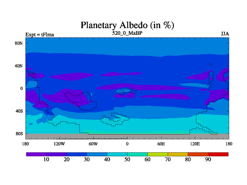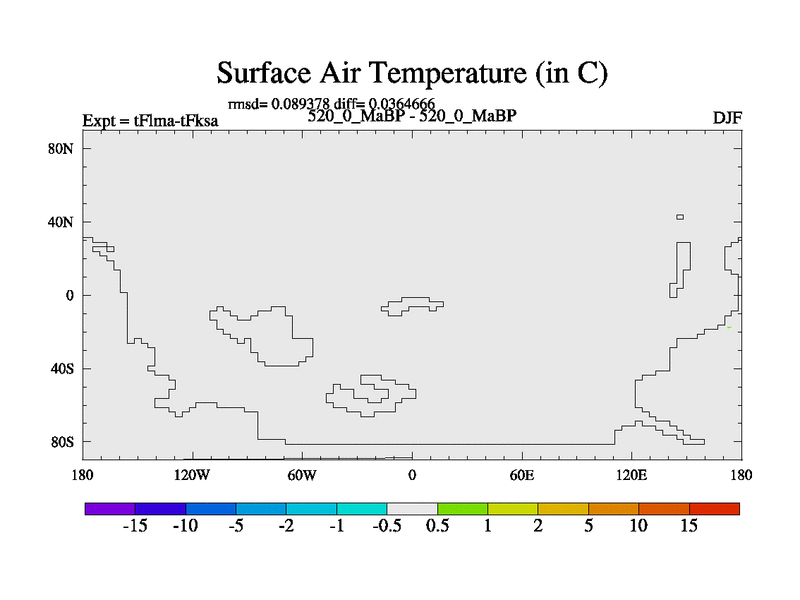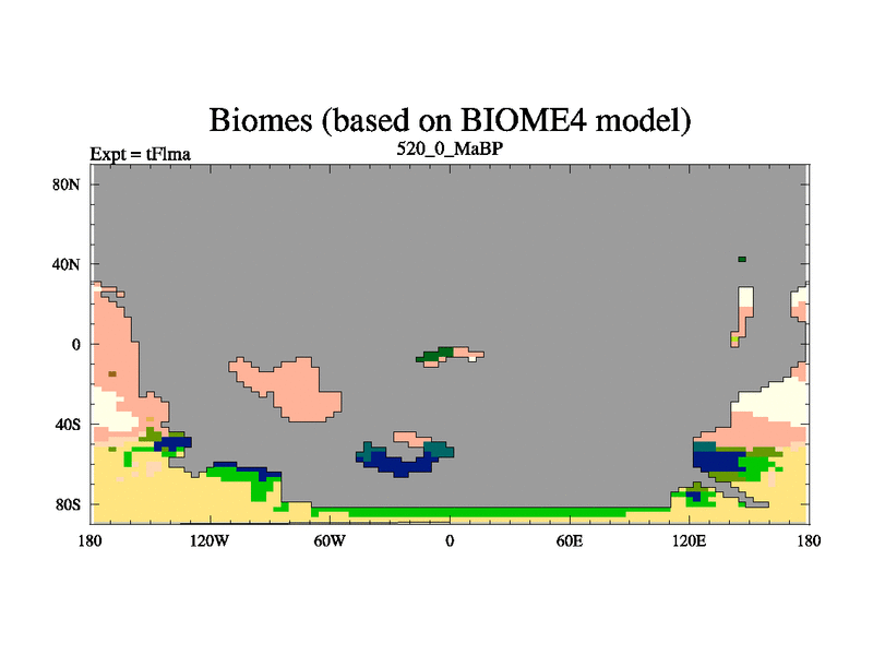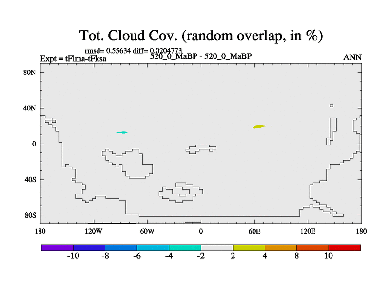 This is the 520.0 Ma simulation using the Scotese palaeogeographies and revised CCN etc. This version has islands and smoothing and desert albedo included. Tuned CO2 to give Scotese temperatures. Started from end of tFksa. With JEDI output.