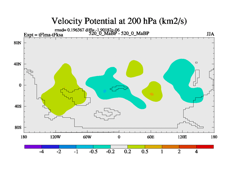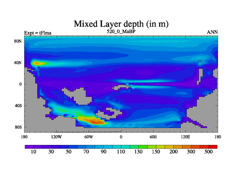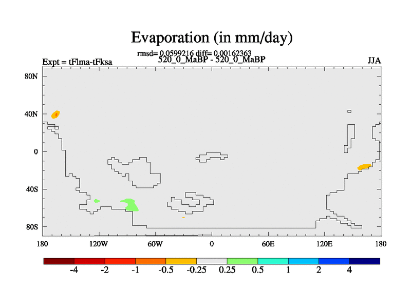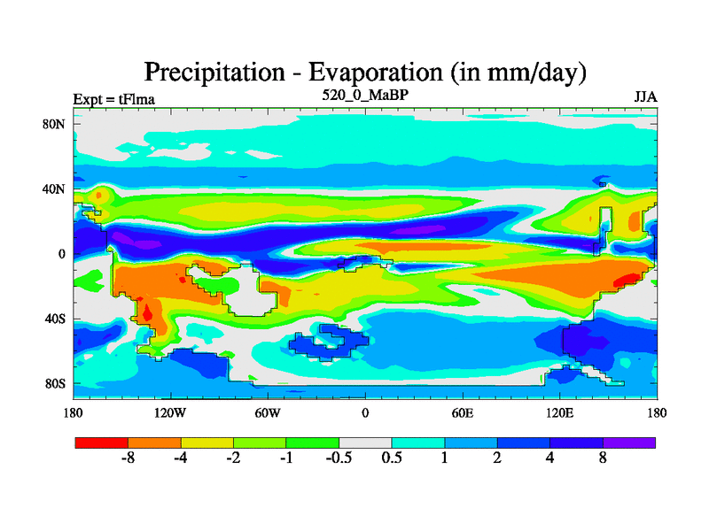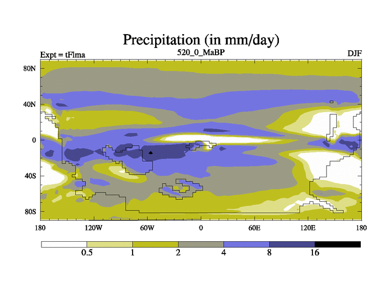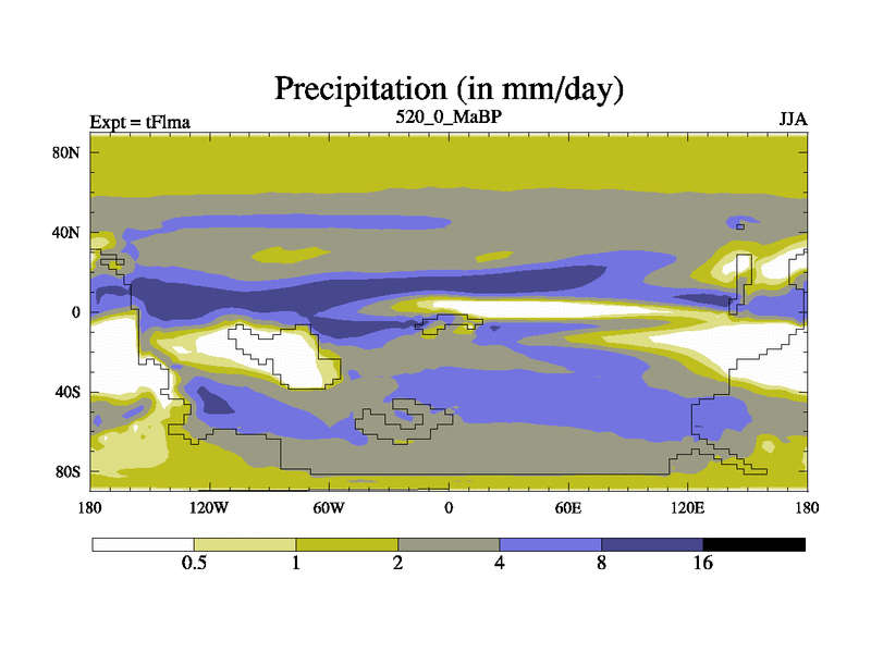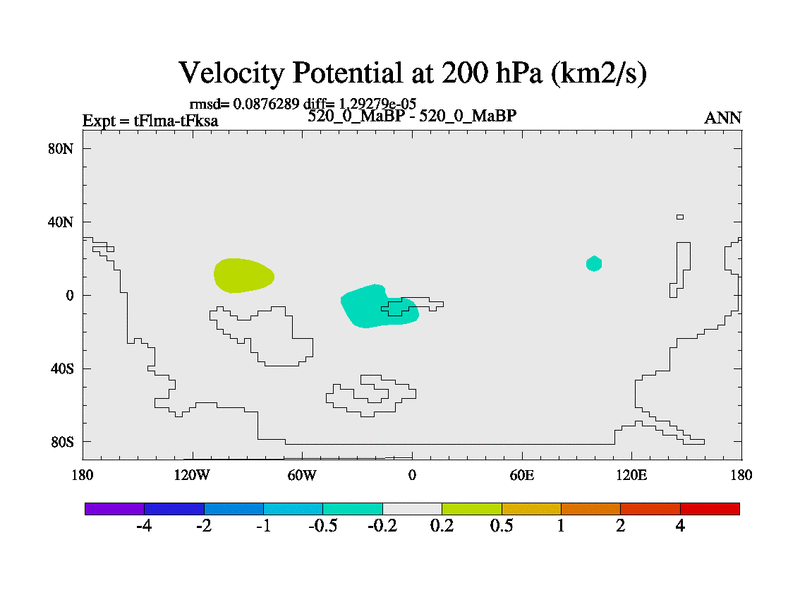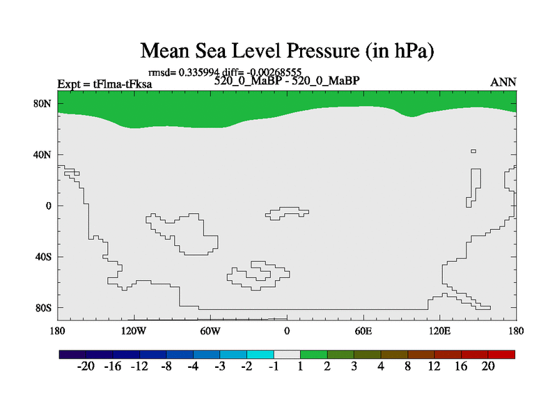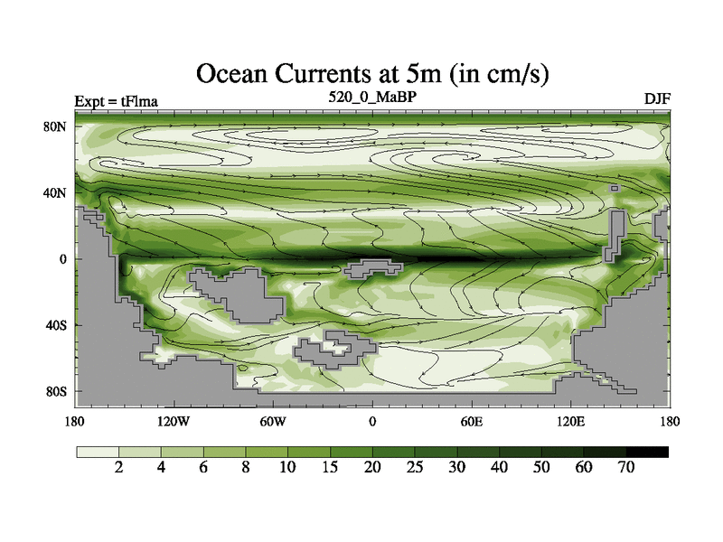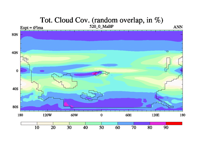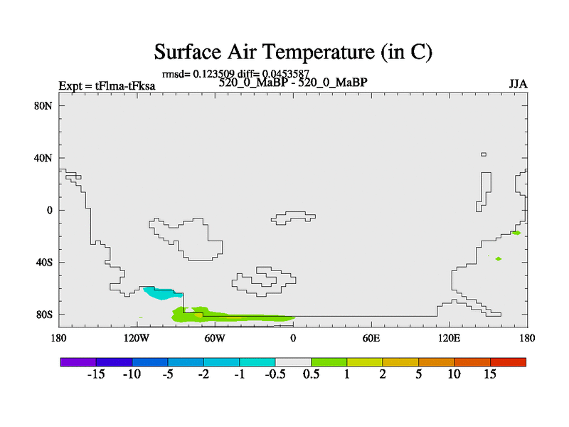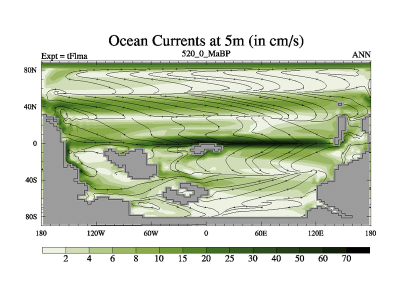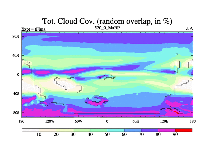 This is the 520.0 Ma simulation using the Scotese palaeogeographies and revised CCN etc. This version has islands and smoothing and desert albedo included. Tuned CO2 to give Scotese temperatures. Started from end of tFksa. With JEDI output.