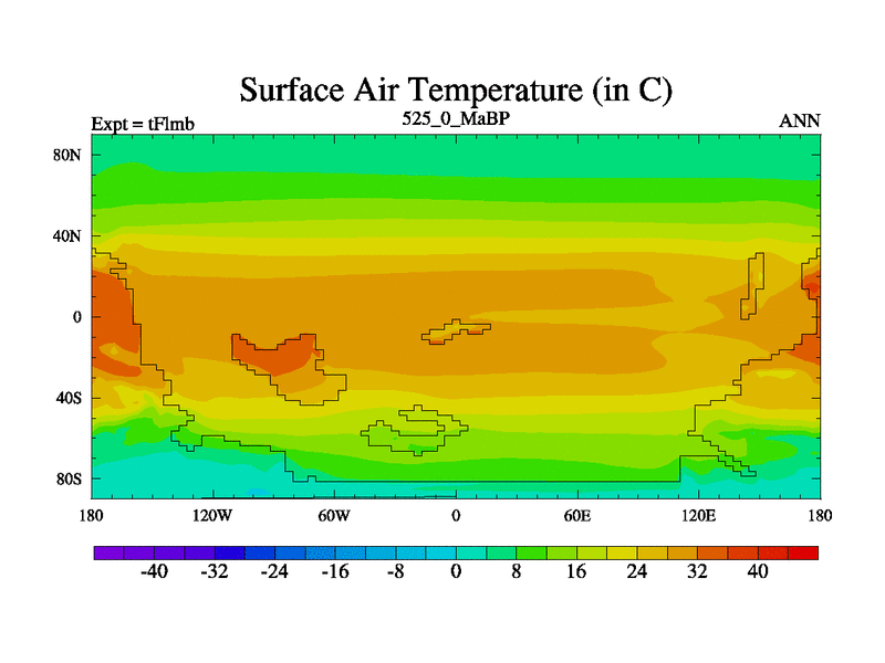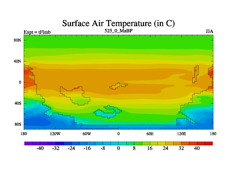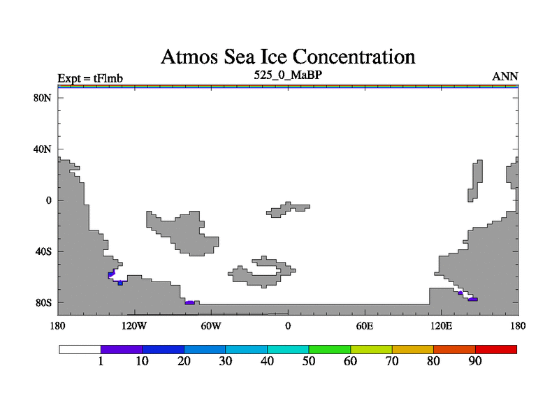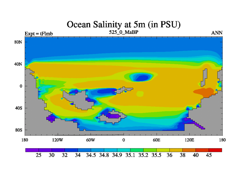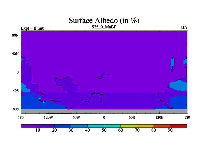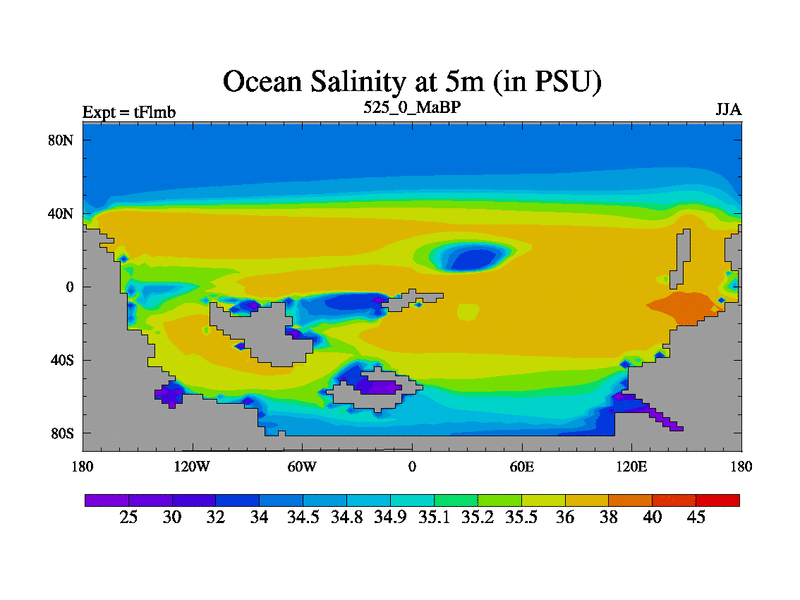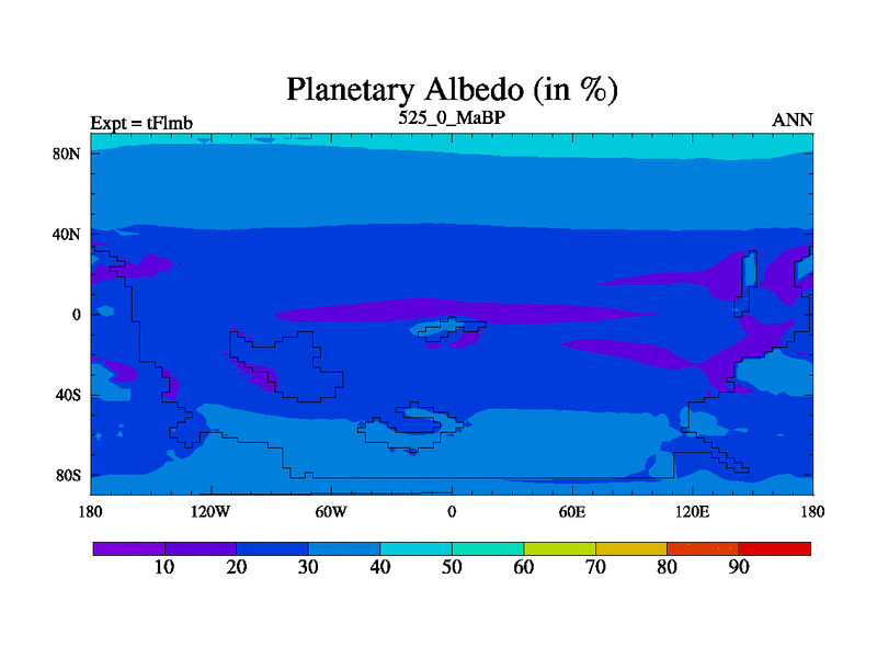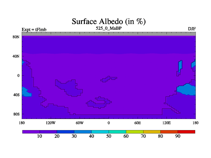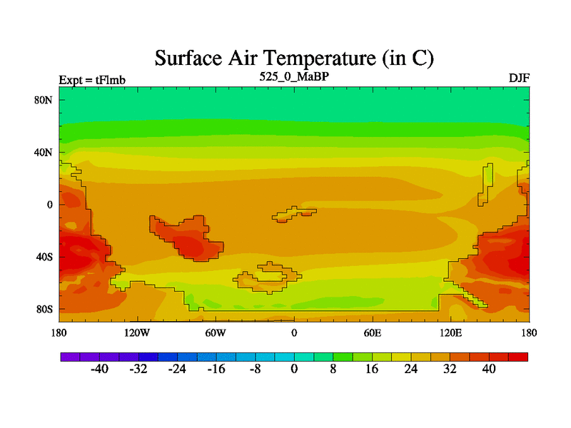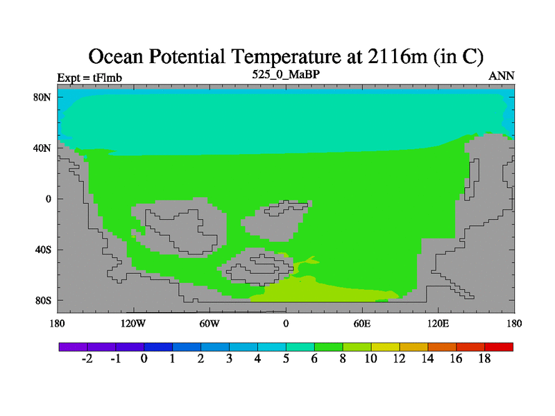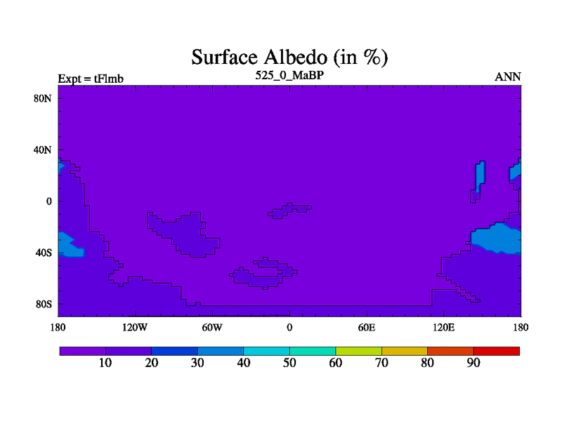 This is the 525.0 Ma simulation using the Scotese palaeogeographies and revised CCN etc. This version has islands and smoothing and desert albedo included. Tuned CO2 to give Scotese temperatures. Started from end of tFksb. With JEDI output.
