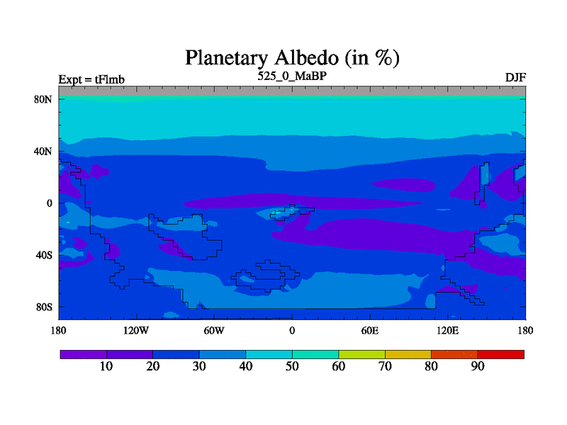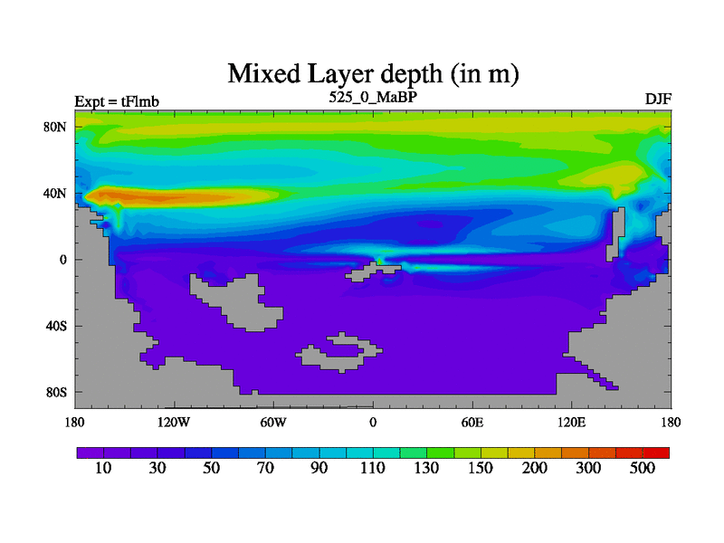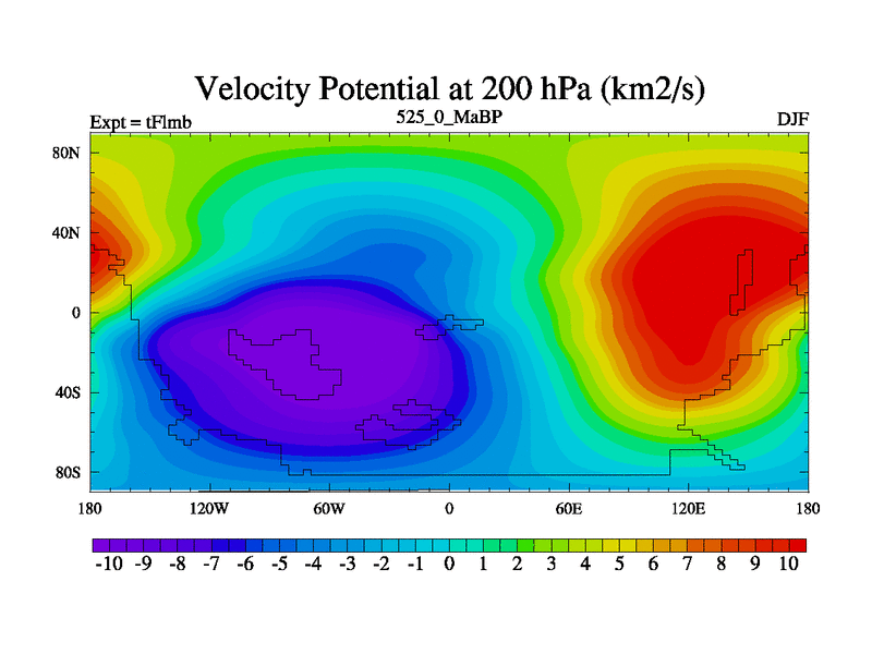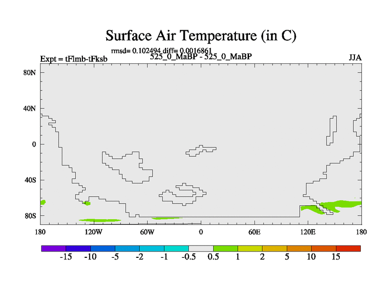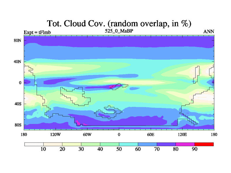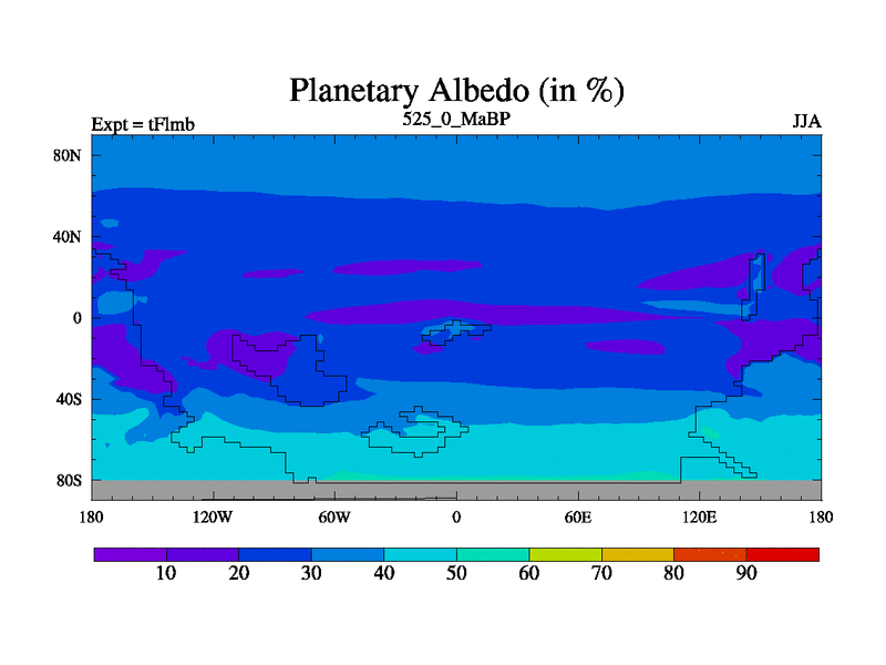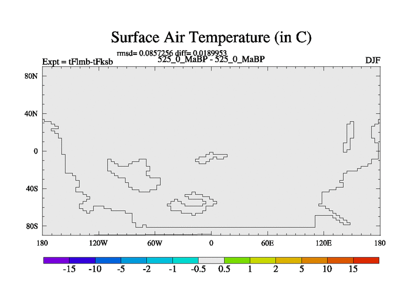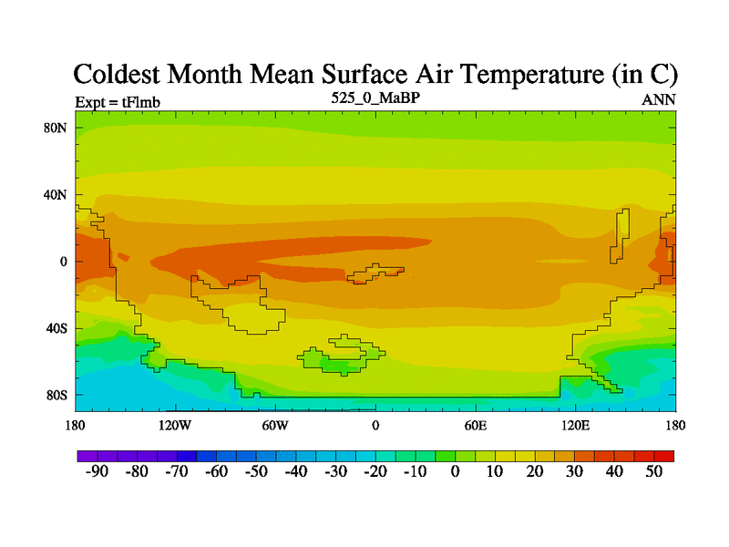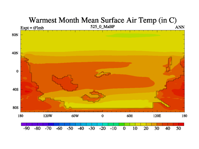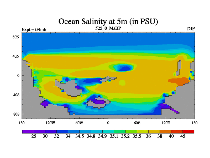 This is the 525.0 Ma simulation using the Scotese palaeogeographies and revised CCN etc. This version has islands and smoothing and desert albedo included. Tuned CO2 to give Scotese temperatures. Started from end of tFksb. With JEDI output.