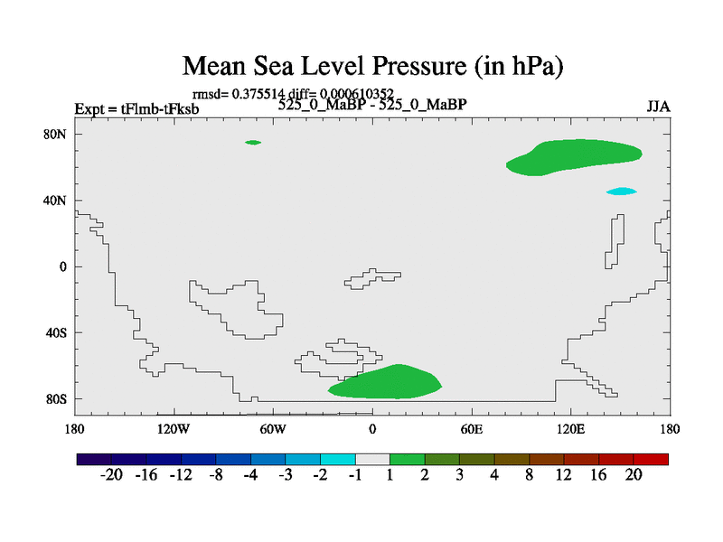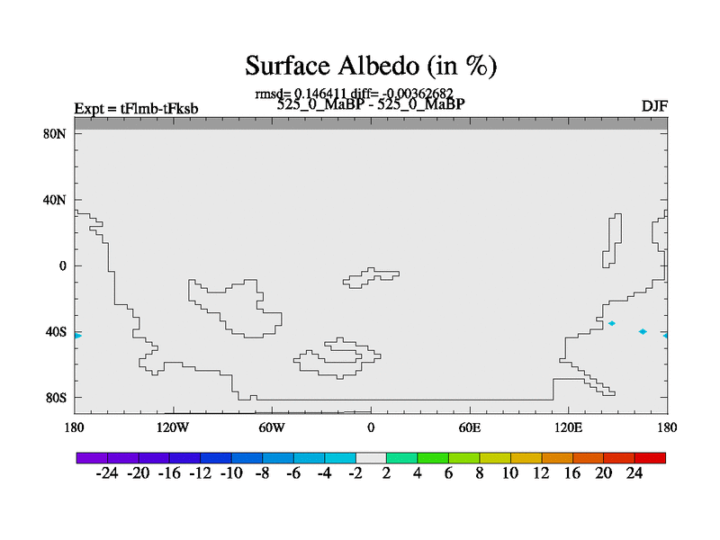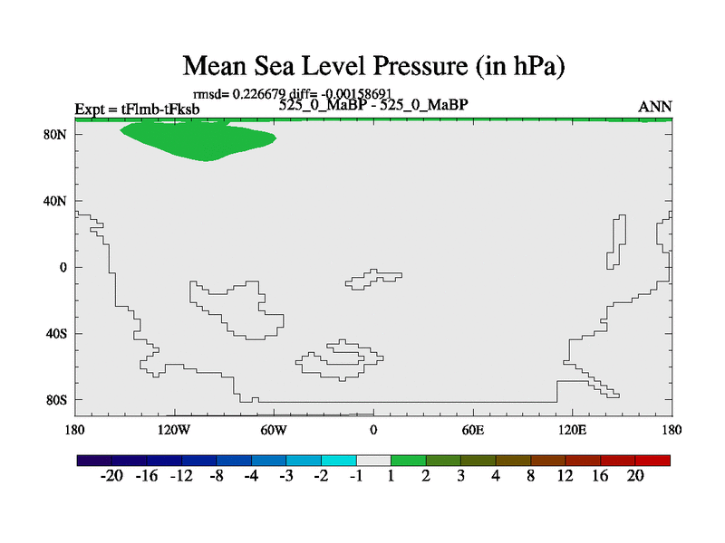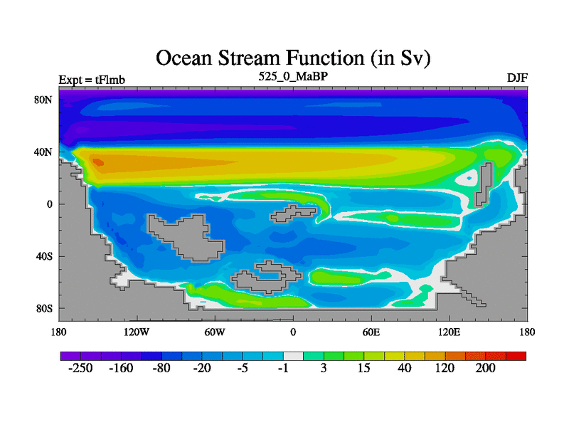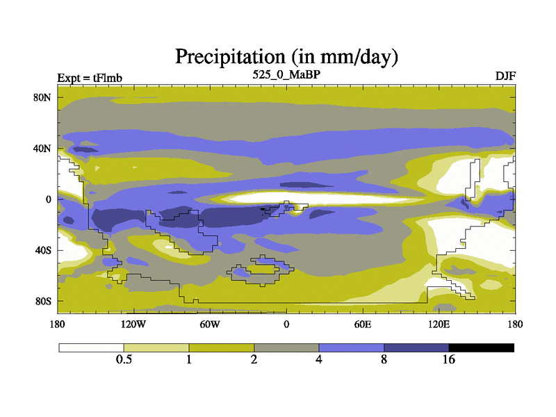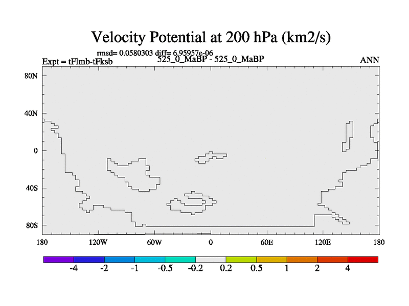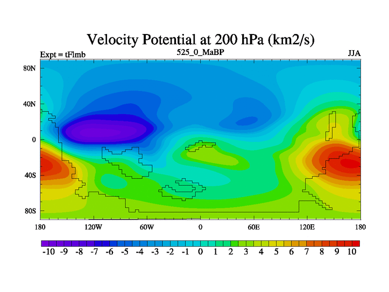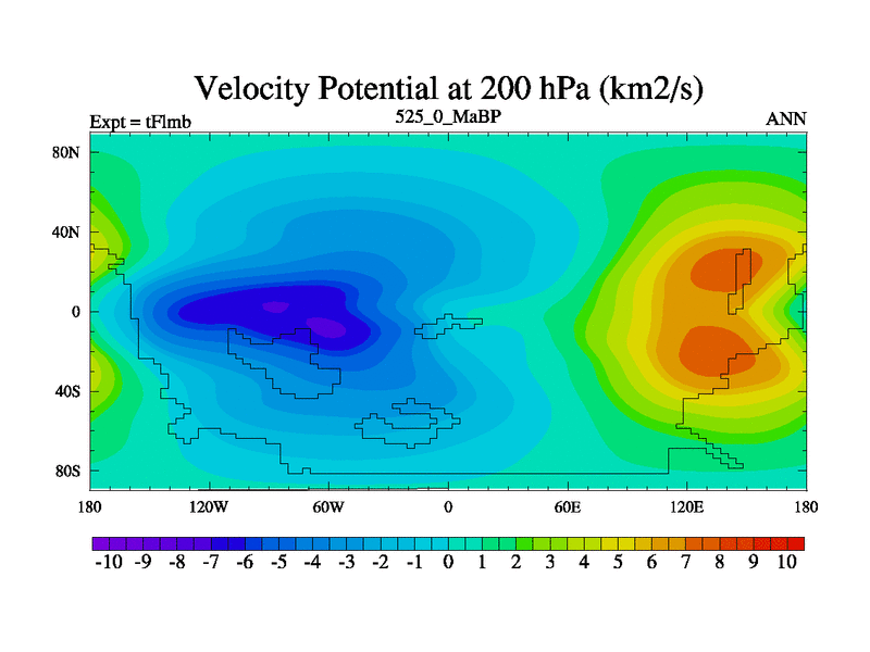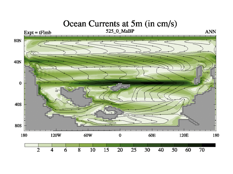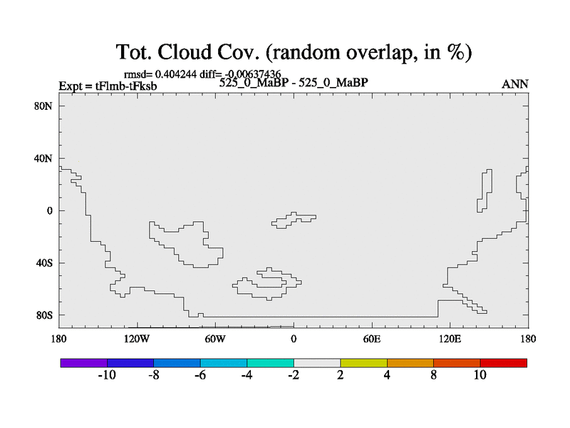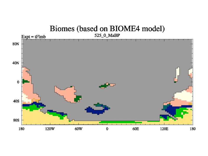 This is the 525.0 Ma simulation using the Scotese palaeogeographies and revised CCN etc. This version has islands and smoothing and desert albedo included. Tuned CO2 to give Scotese temperatures. Started from end of tFksb. With JEDI output.