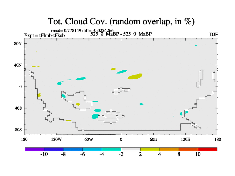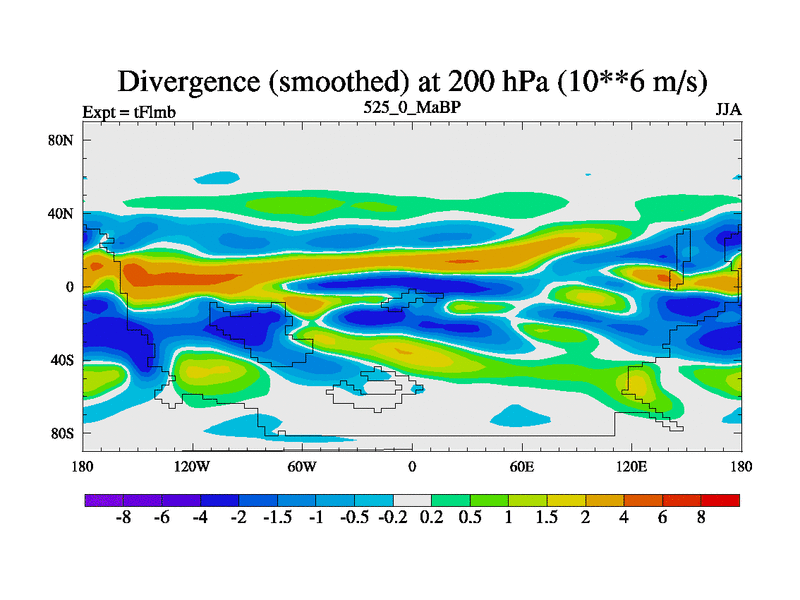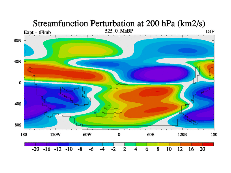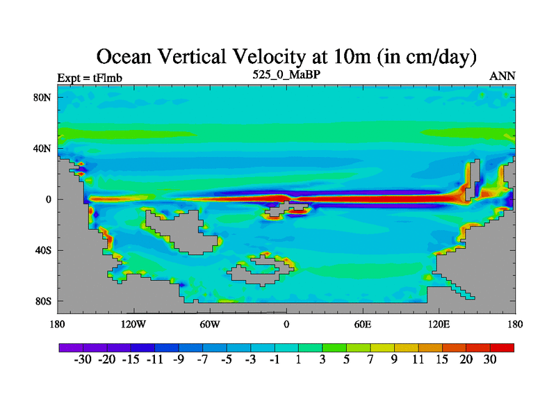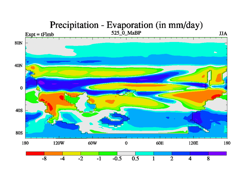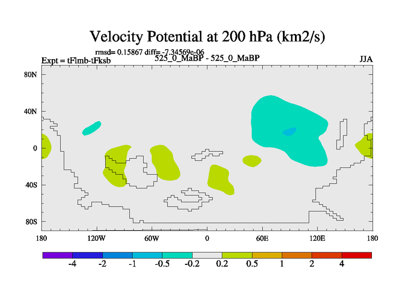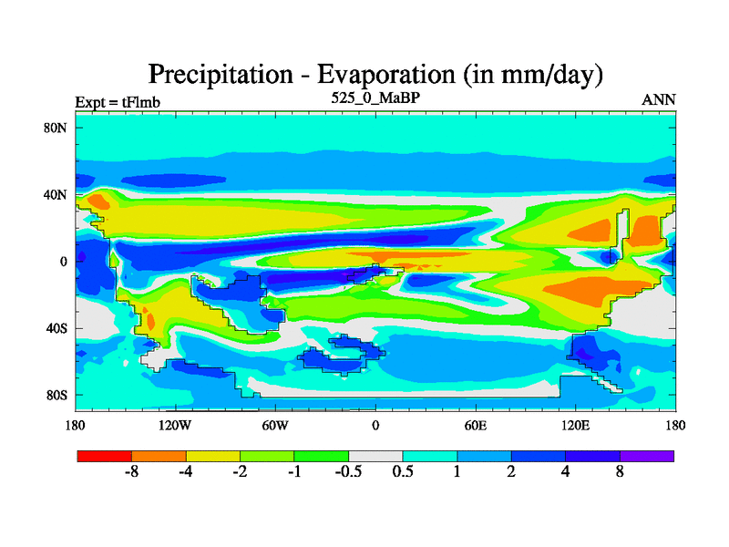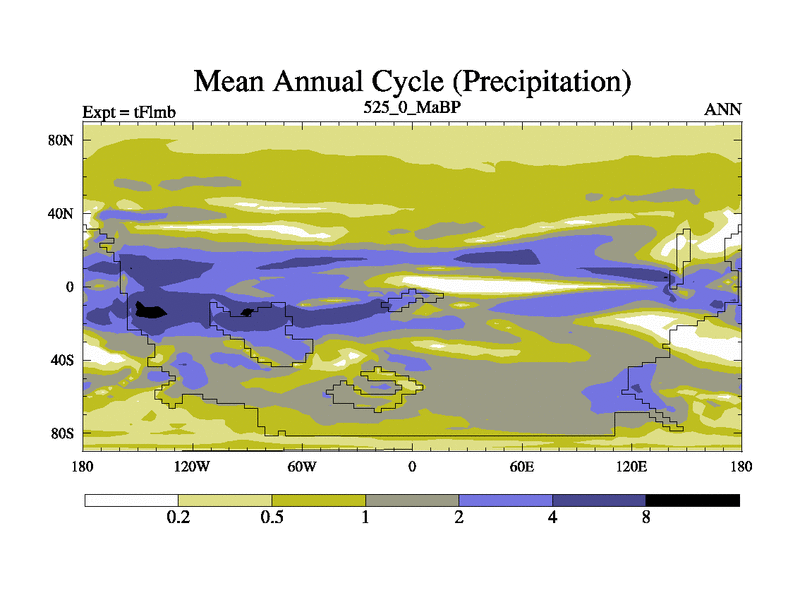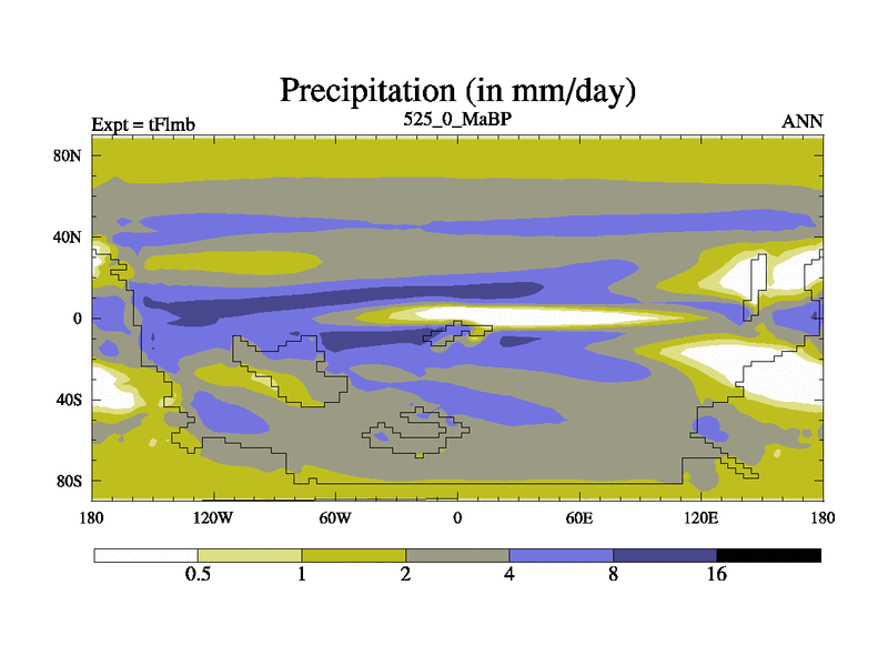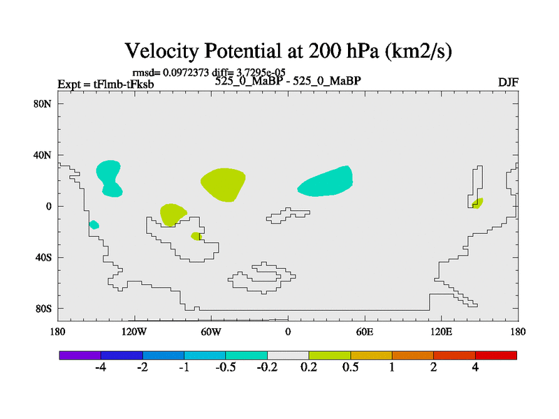 This is the 525.0 Ma simulation using the Scotese palaeogeographies and revised CCN etc. This version has islands and smoothing and desert albedo included. Tuned CO2 to give Scotese temperatures. Started from end of tFksb. With JEDI output.