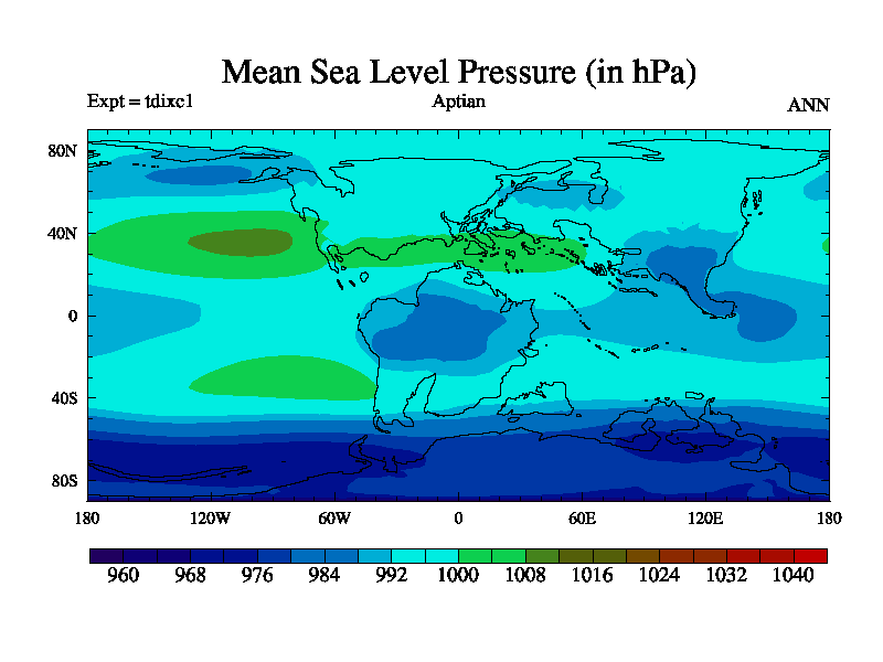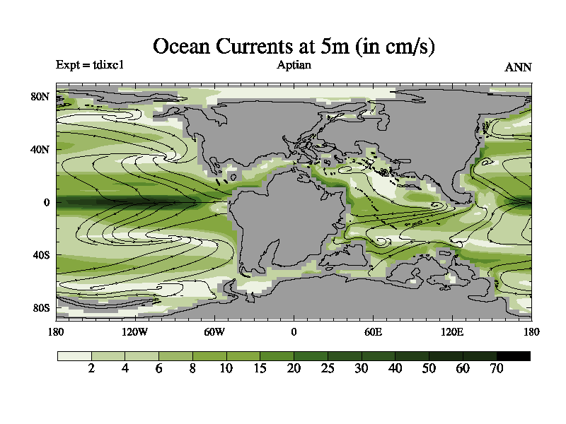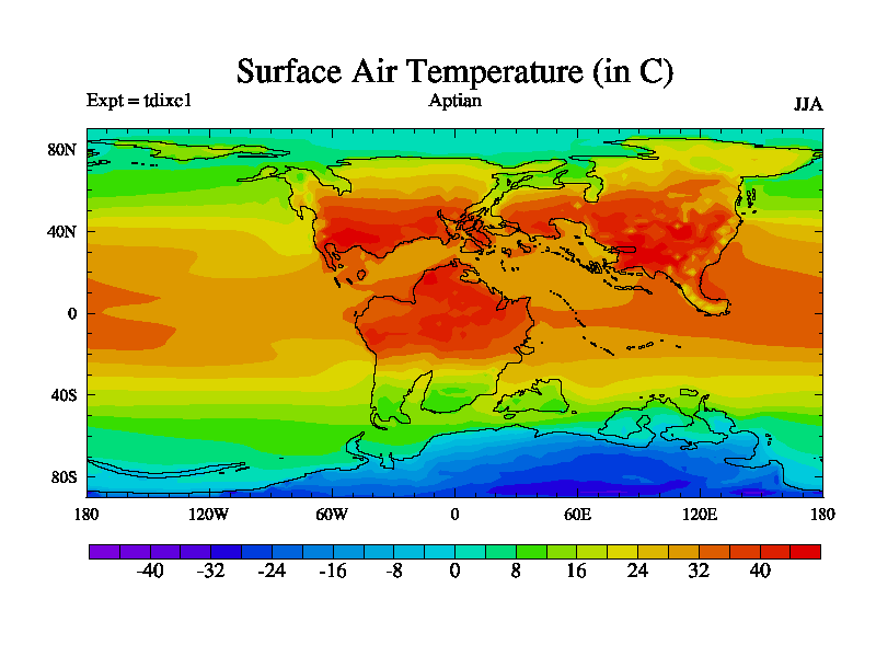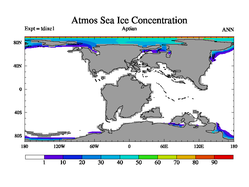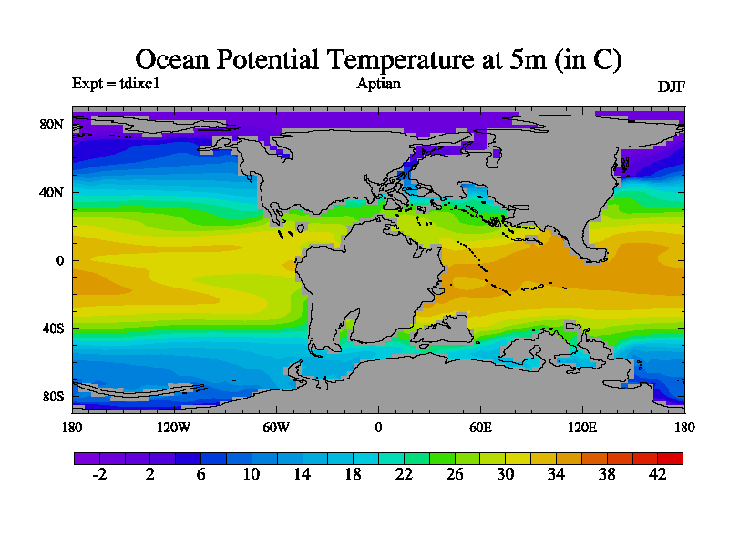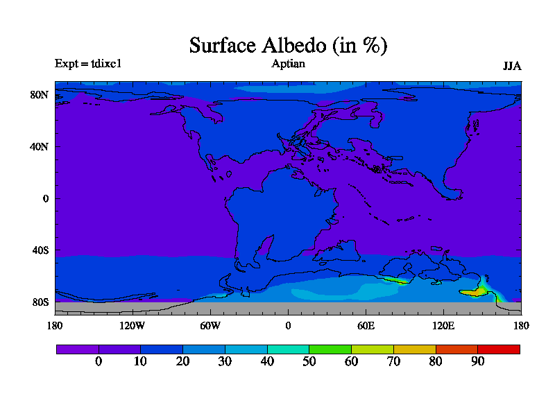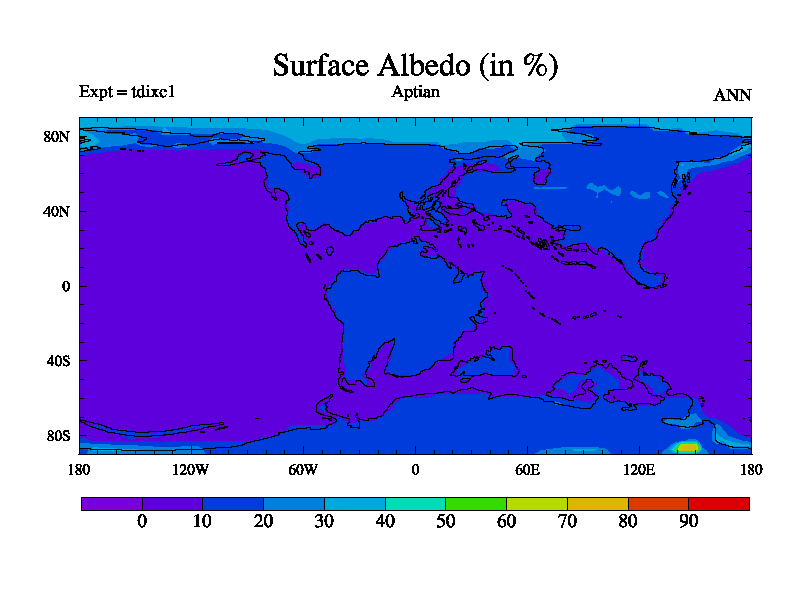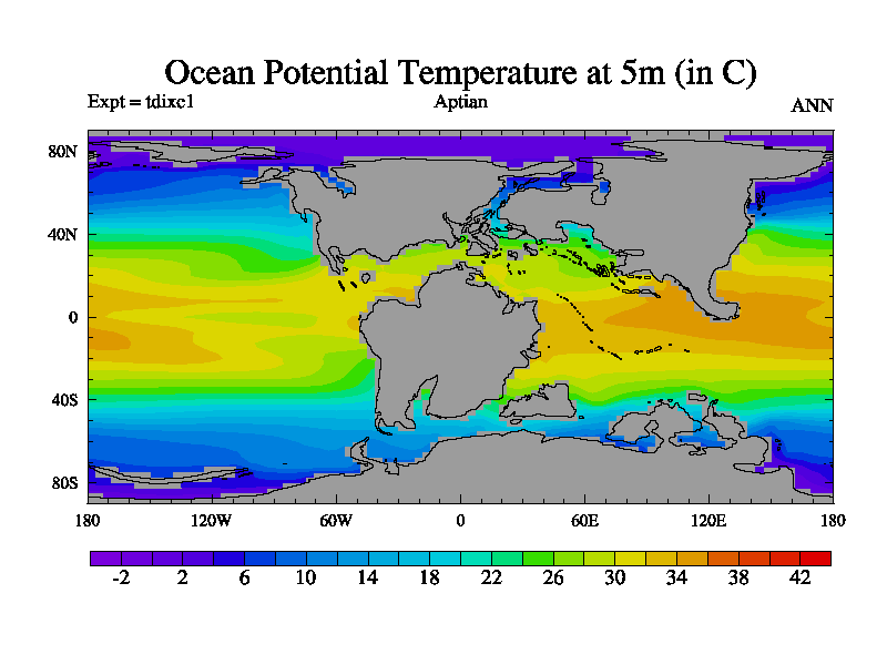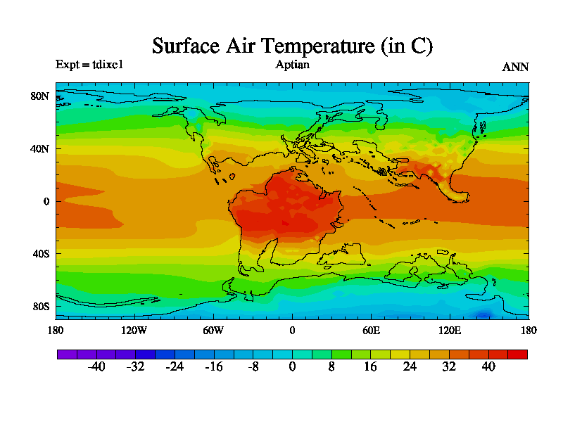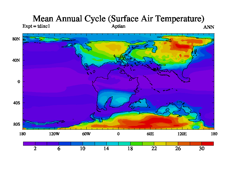 This is a Aptian simulation with new control palaeogeog, 4xCO2, and with appropriate reduction in solar constant. It is also using the newer ozone mod which better represents the effects of stratospheric ozone. It does include the ocean stream function.