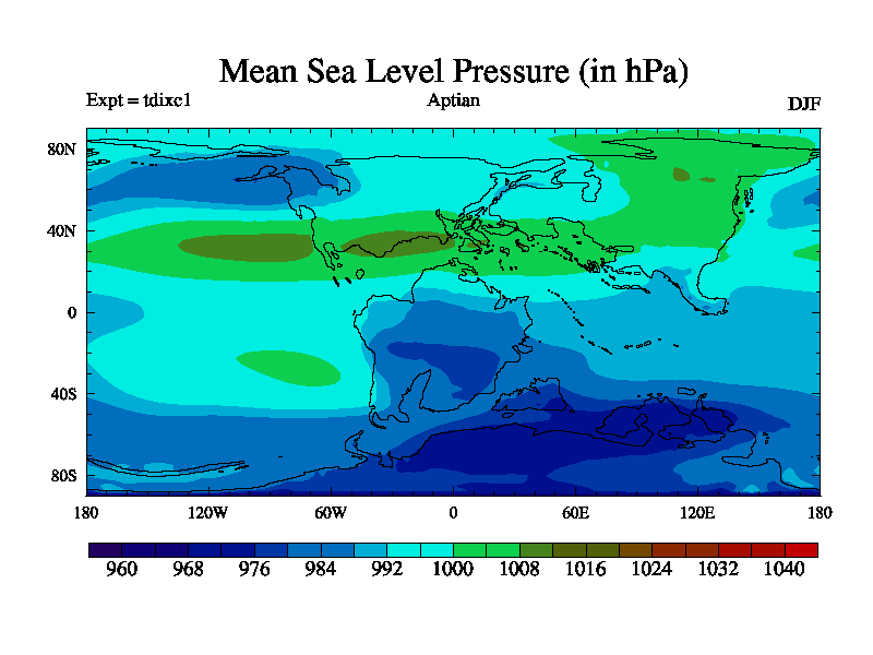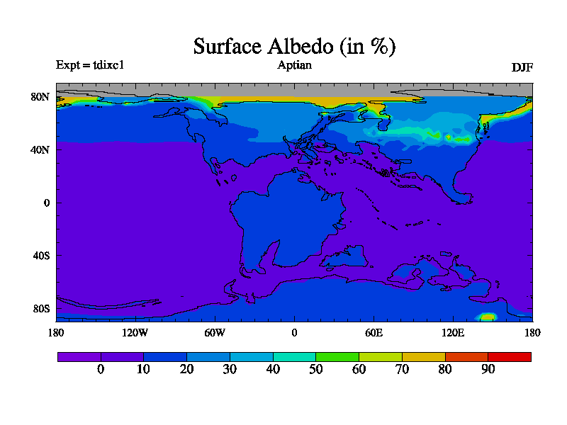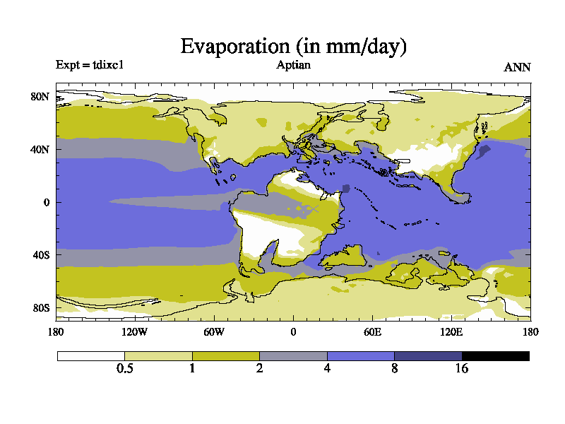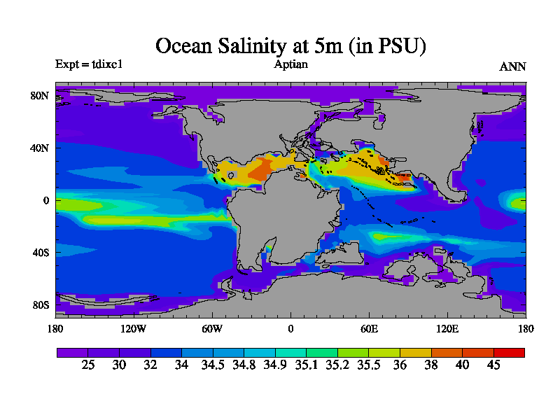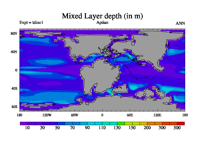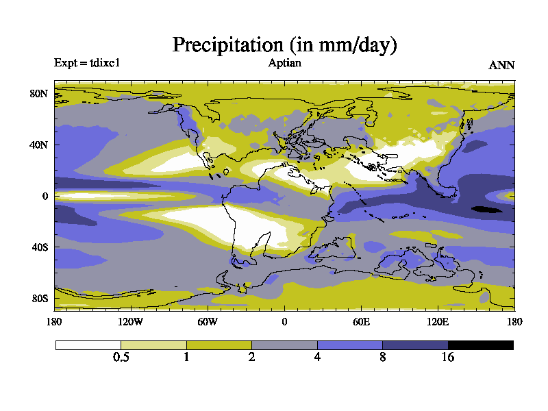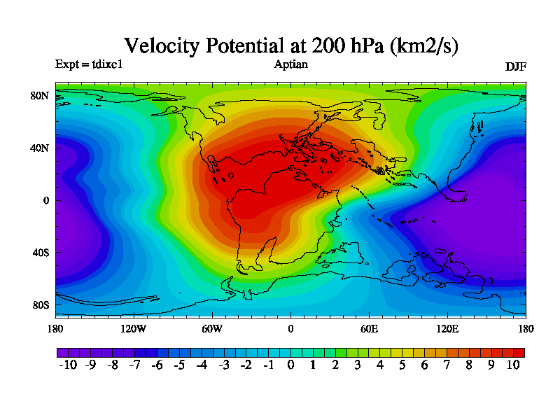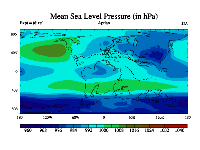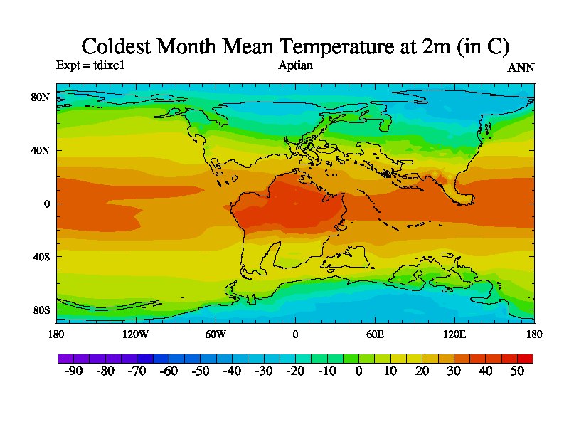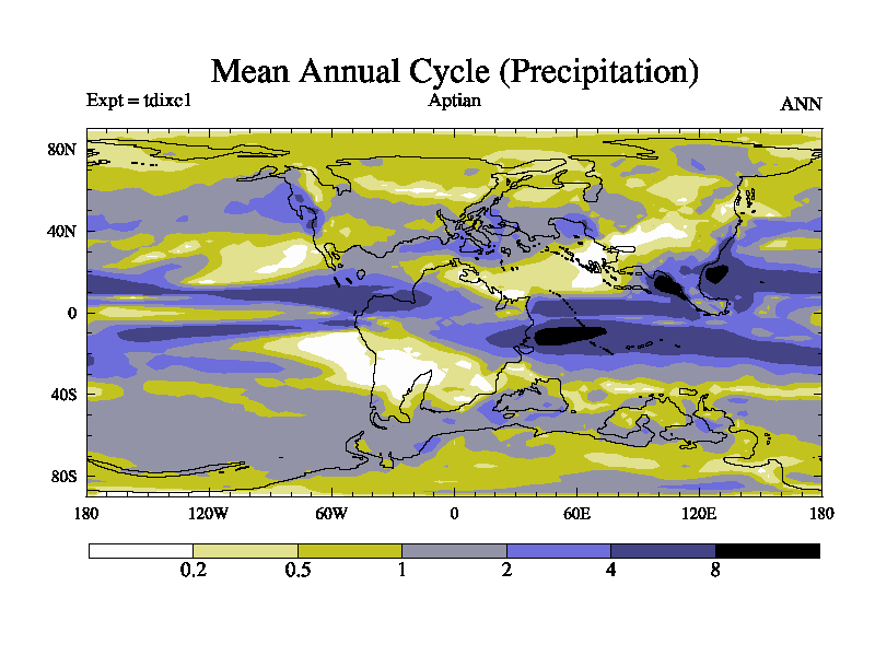 This is a Aptian simulation with new control palaeogeog, 4xCO2, and with appropriate reduction in solar constant. It is also using the newer ozone mod which better represents the effects of stratospheric ozone. It does include the ocean stream function.