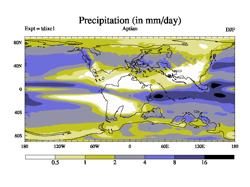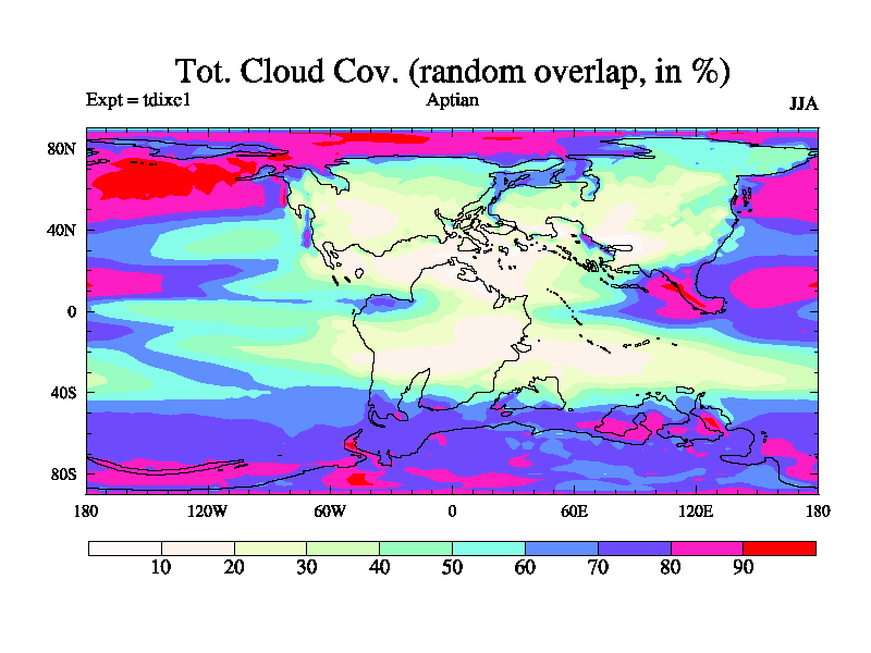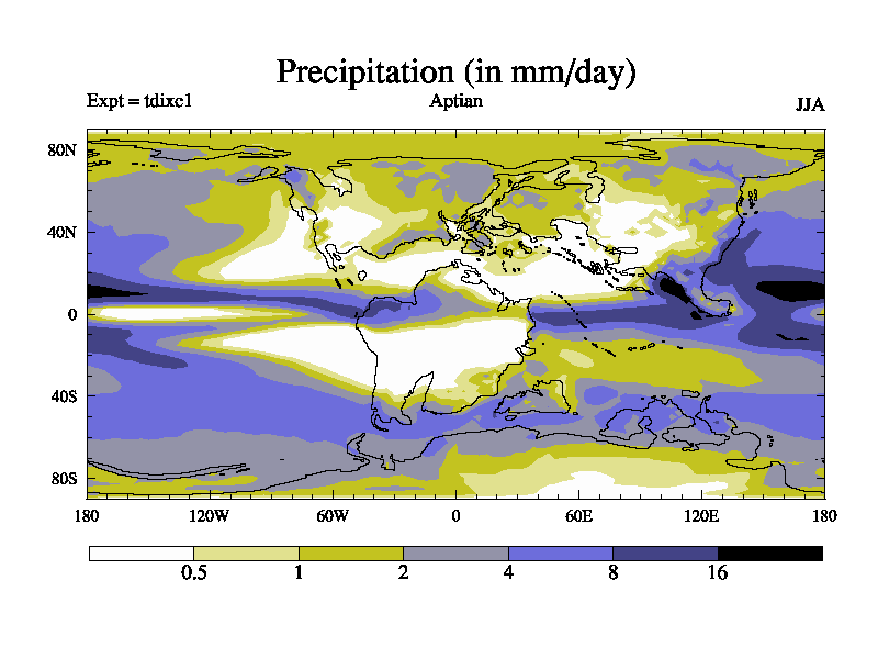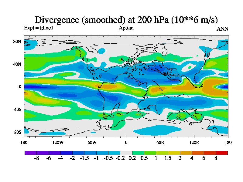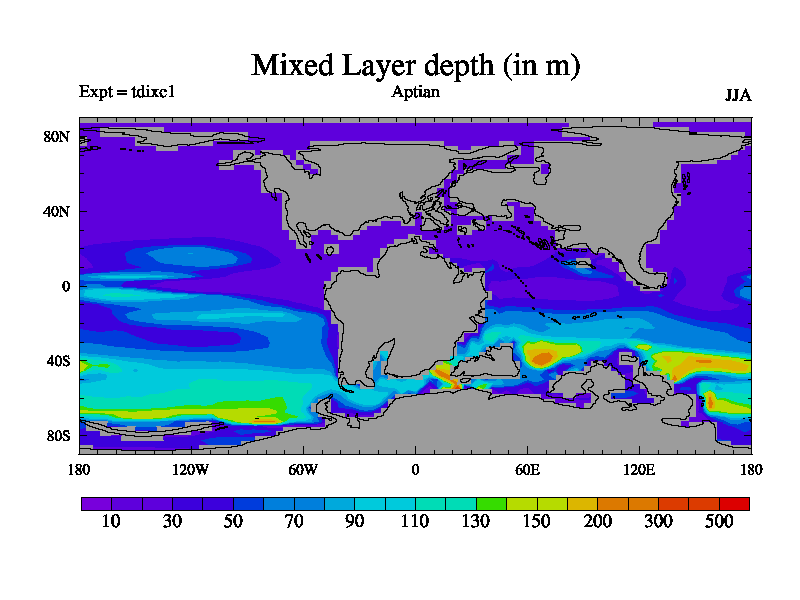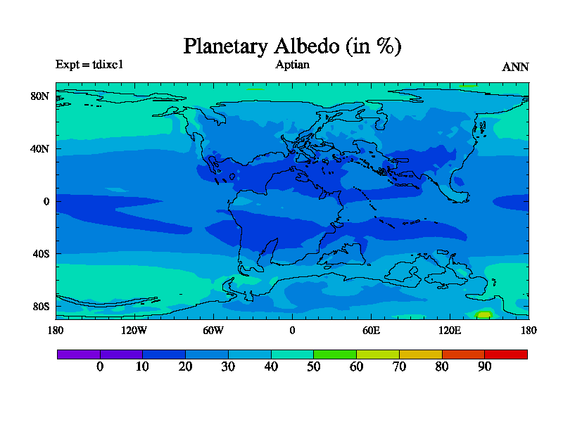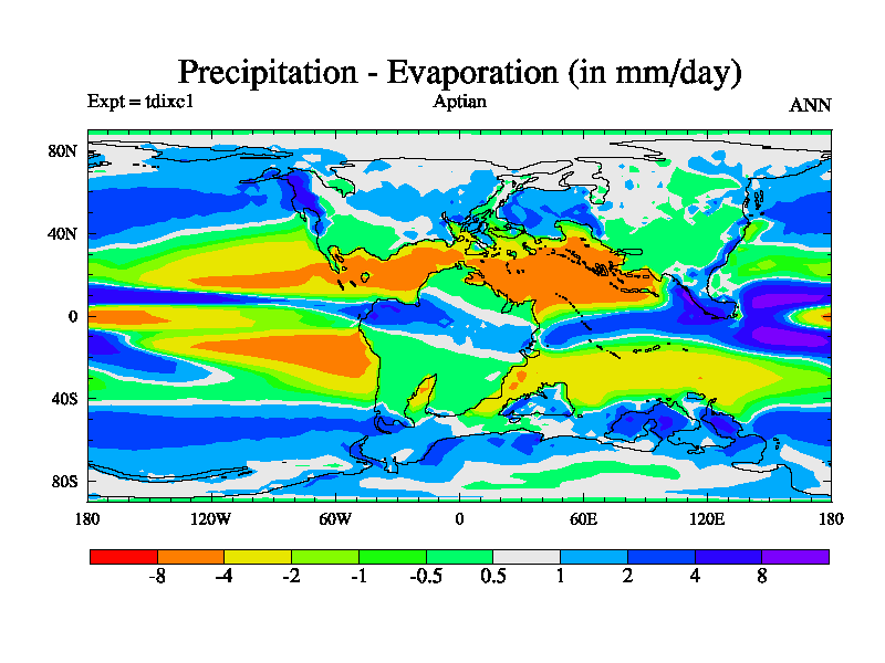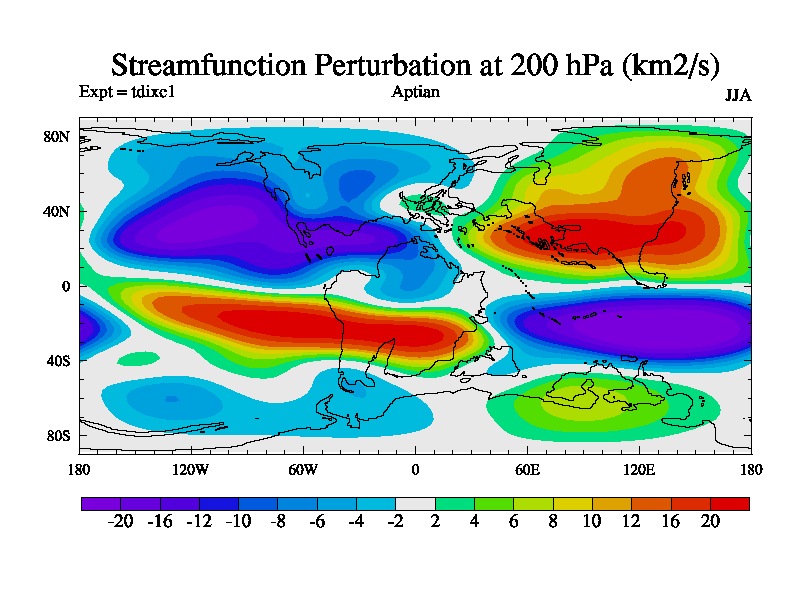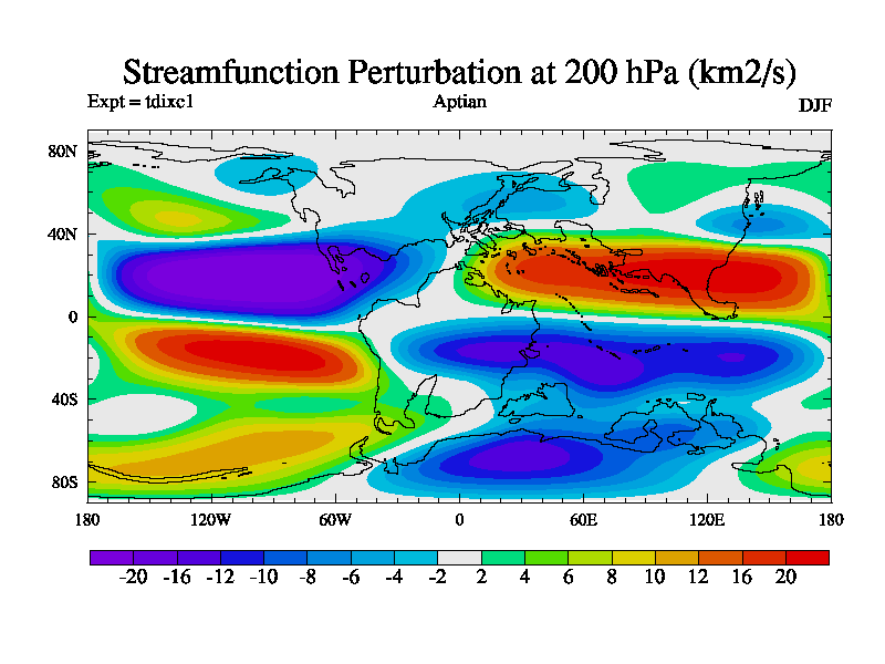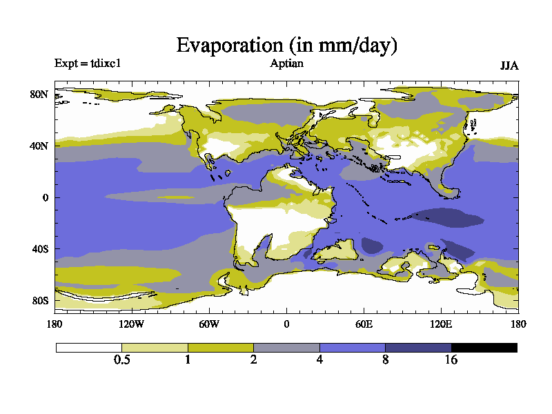 This is a Aptian simulation with new control palaeogeog, 4xCO2, and with appropriate reduction in solar constant. It is also using the newer ozone mod which better represents the effects of stratospheric ozone. It does include the ocean stream function.