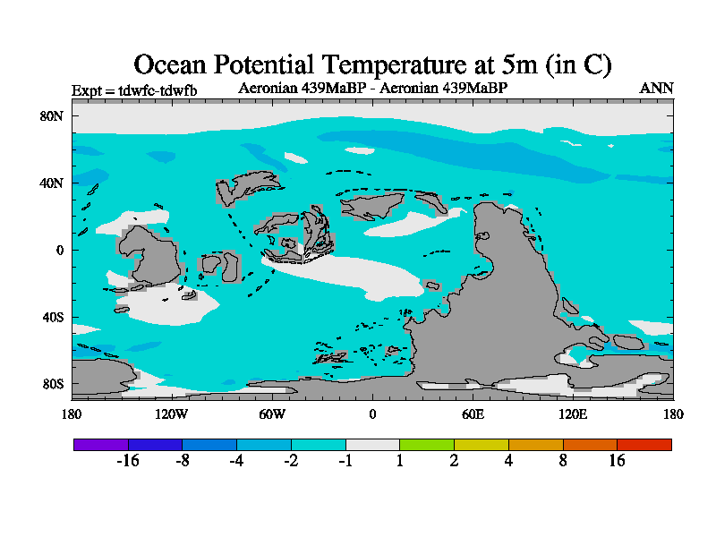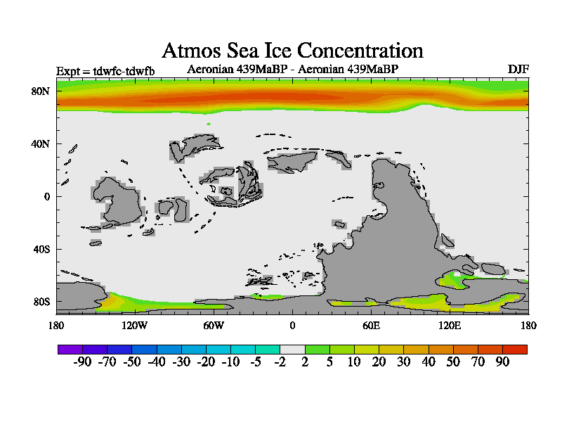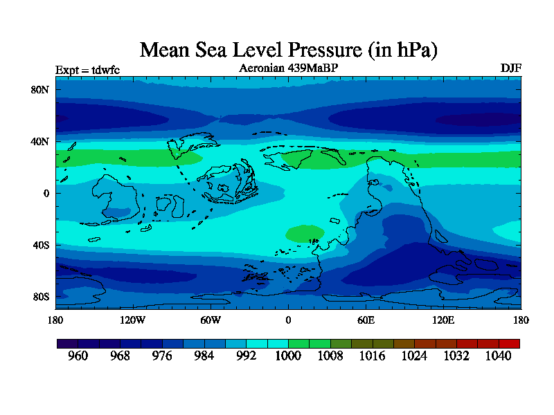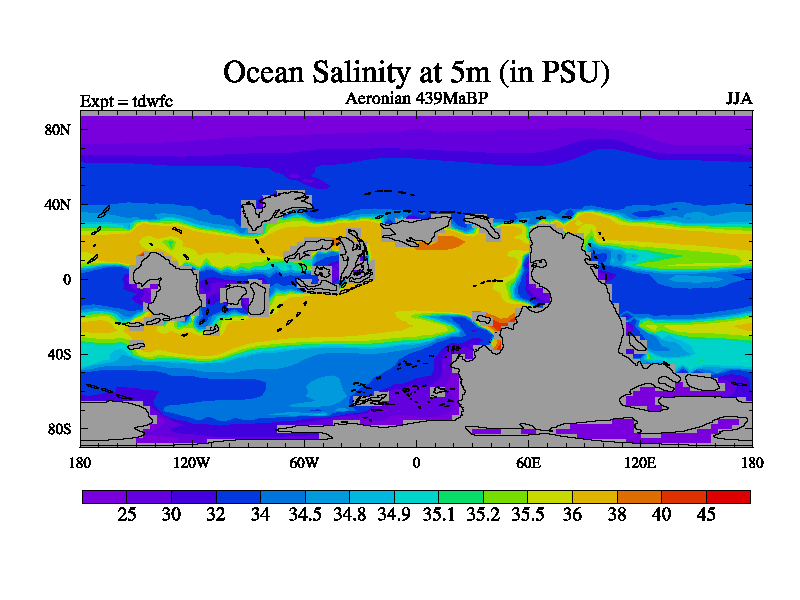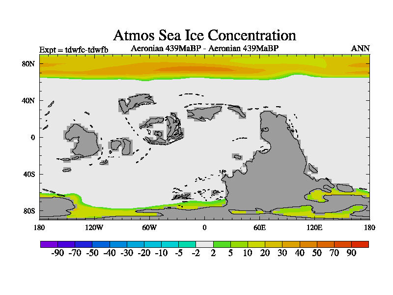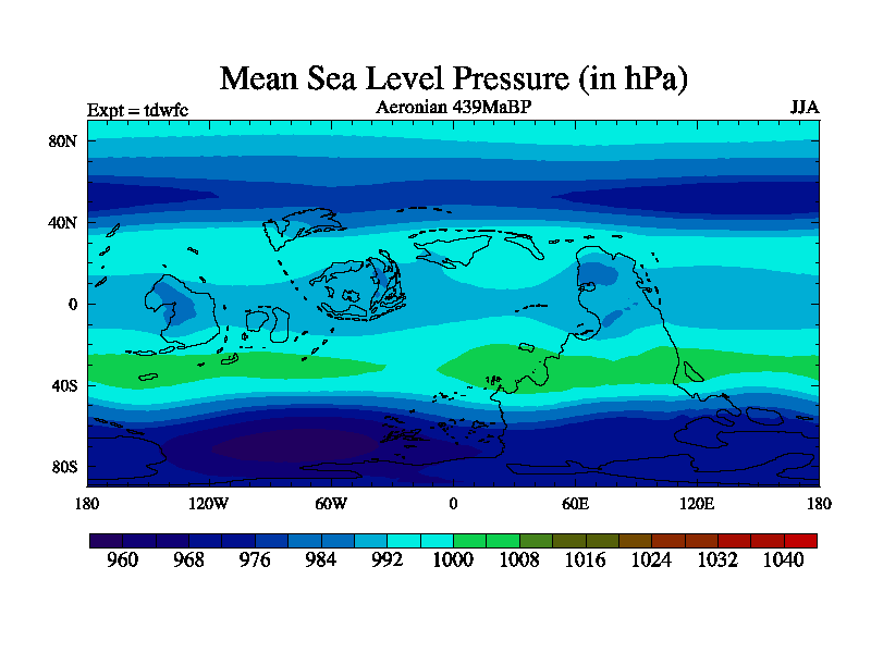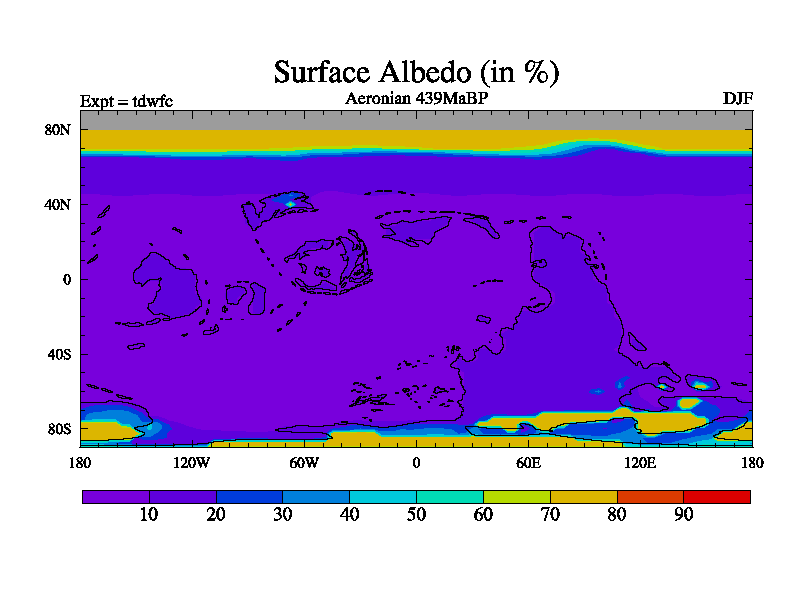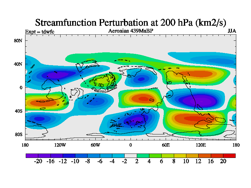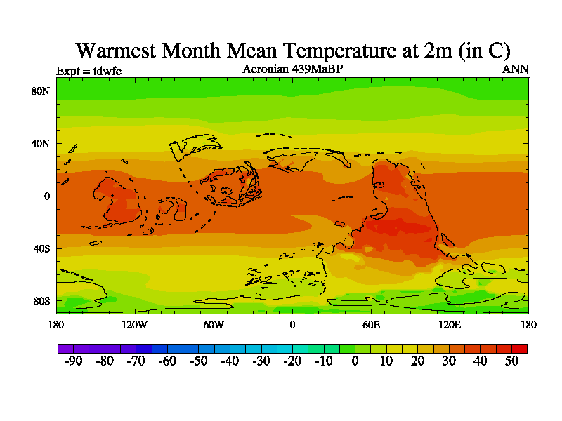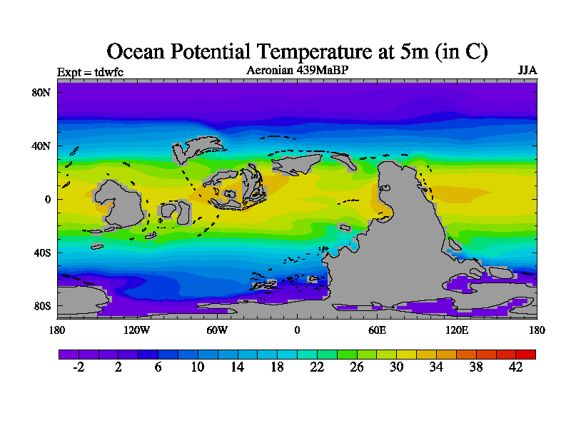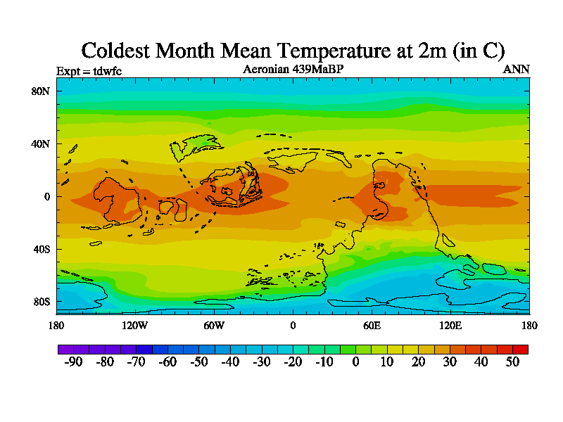 This is a Aeronian simulation with new control palaeogeog, 10xco2 and with appropriate reduction in solar constant. It is also using the newer ozone mod which better represents the effects of stratospheric ozone. It does include the ocean stream function.