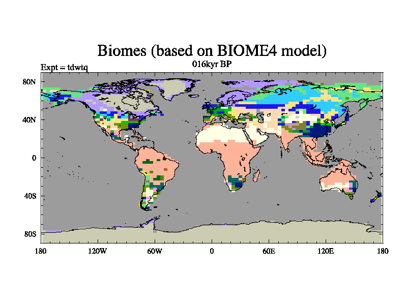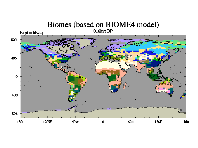 This is the 016kyr BP simulation for a new set of BBC runs using TRIFFID. Equilibrium mode, started from tdac set of simulations (old BBC dynamic TRIFFID runs). This version includes the dark_respiration update.