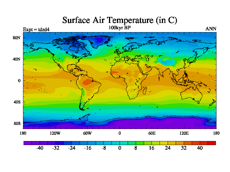 This is the 100kyr BP simulation for a new set of BBC runs using TRIFFID. Static mode, started from half way through tdxo set of simulations (new BBC static TRIFFID runs). This version includes the dark_respiration update. Vegetation is from the pre-industrial run tdwza, and CO2 is doubled over tdxo version.