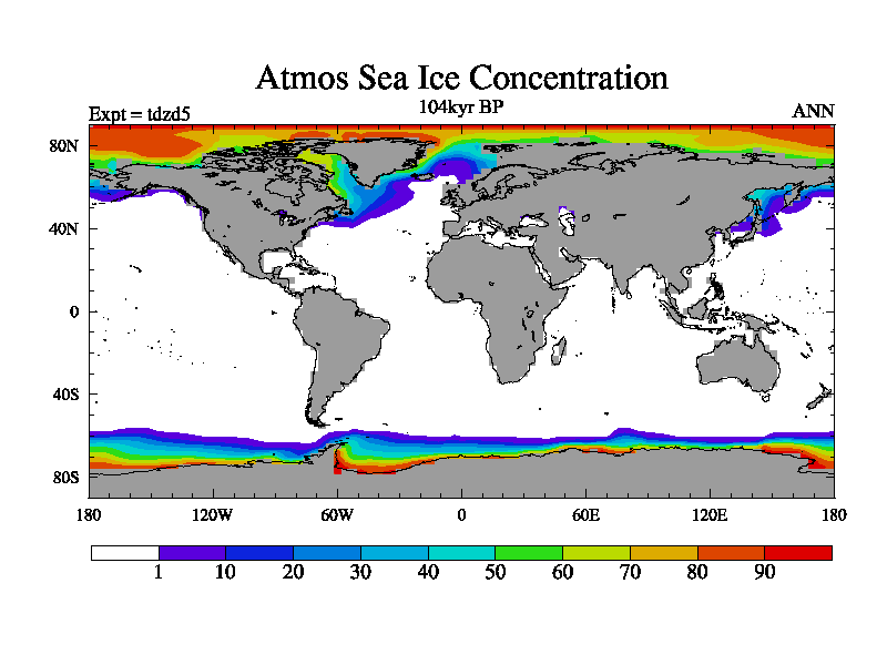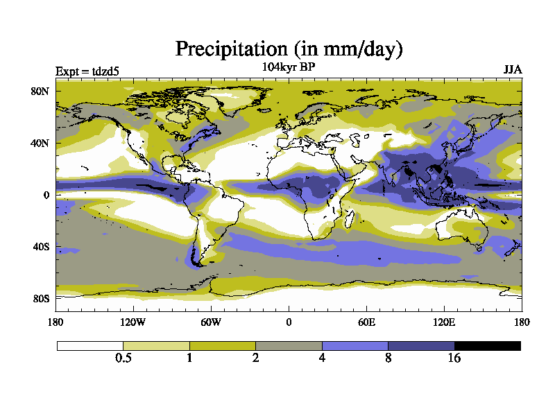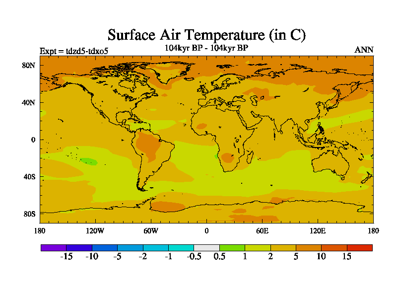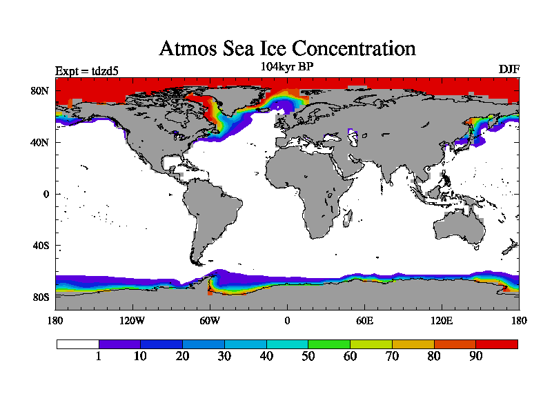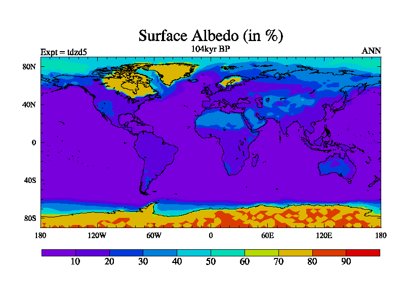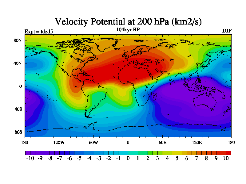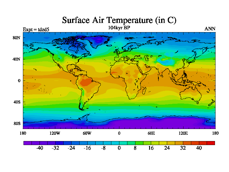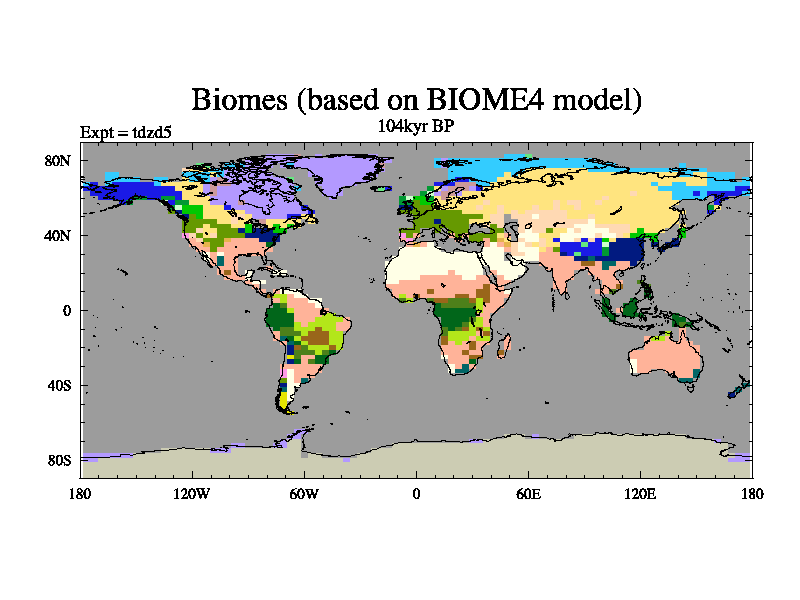 This is the 104kyr BP simulation for a new set of BBC runs using TRIFFID. Static mode, started from half way through tdxo set of simulations (new BBC static TRIFFID runs). This version includes the dark_respiration update. Vegetation is from the pre-industrial run tdwza, and CO2 is doubled over tdxo version.