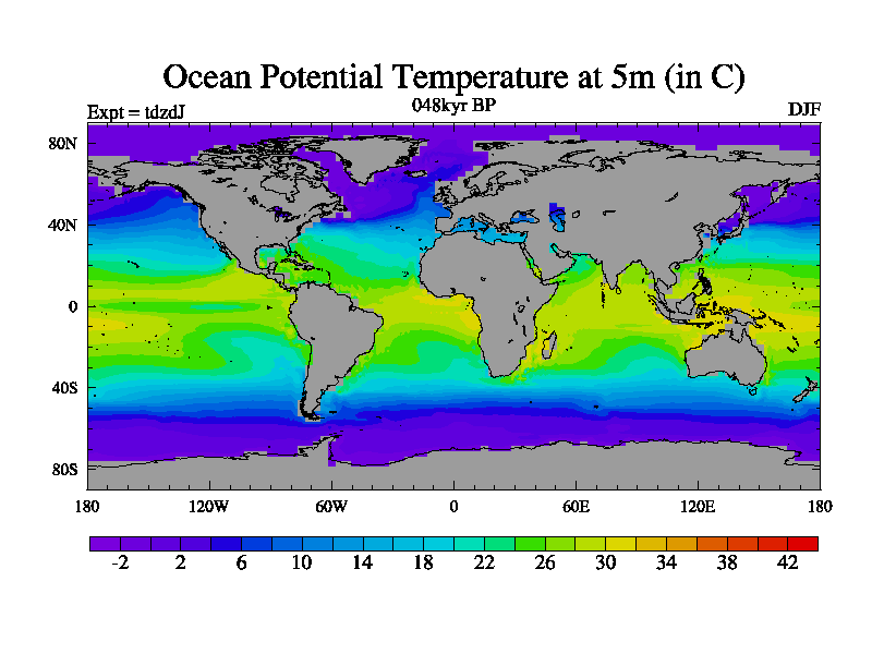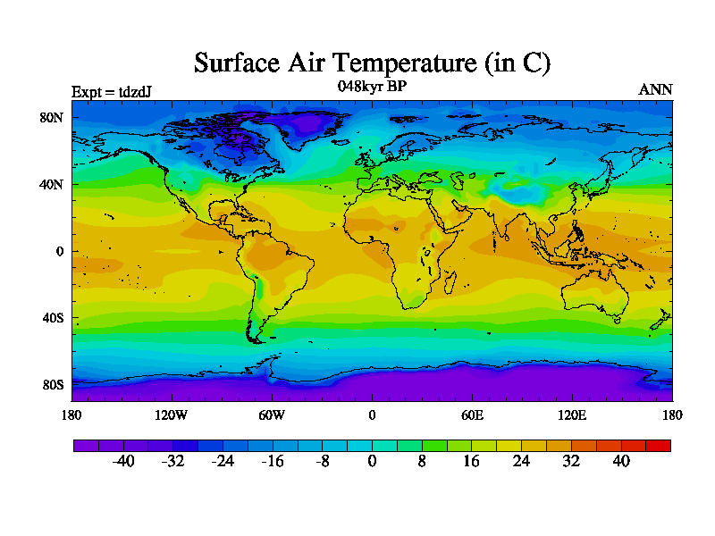 This is the 048kyr BP simulation for a new set of BBC runs using TRIFFID. Static mode, started from half way through tdxo set of simulations (new BBC static TRIFFID runs). This version includes the dark_respiration update. Vegetation is from the pre-industrial run tdwza, and CO2 is doubled over tdxo version.