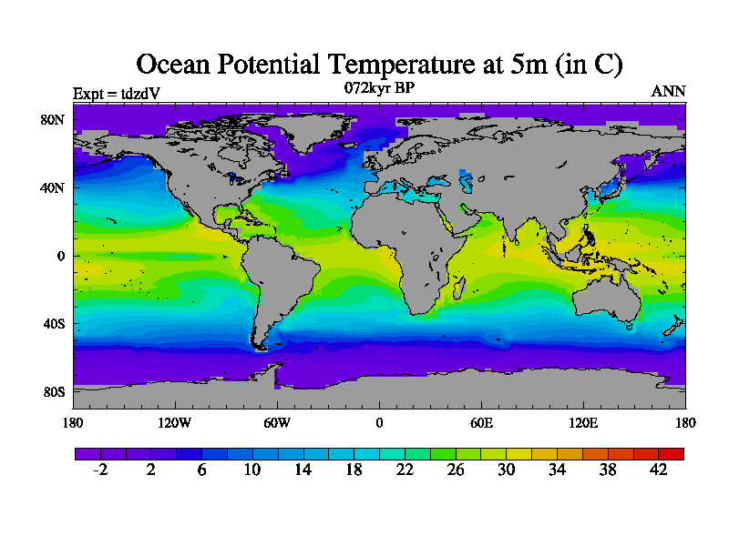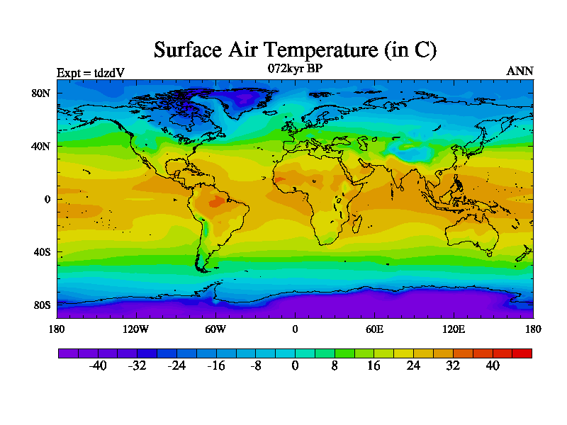 This is the 072kyr BP simulation for a new set of BBC runs using TRIFFID. Static mode, started from half way through tdxo set of simulations (new BBC static TRIFFID runs). This version includes the dark_respiration update. Vegetation is from the pre-industrial run tdwza, and CO2 is doubled over tdxo version.