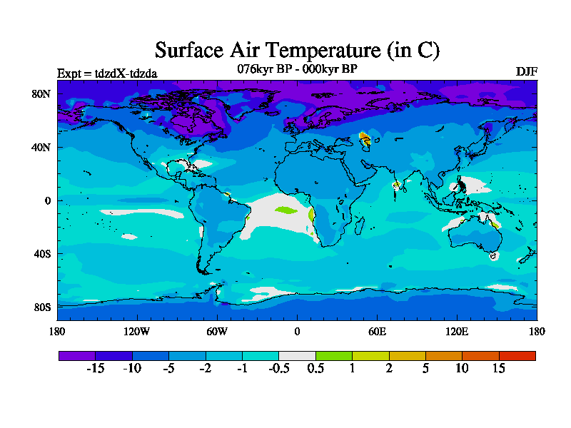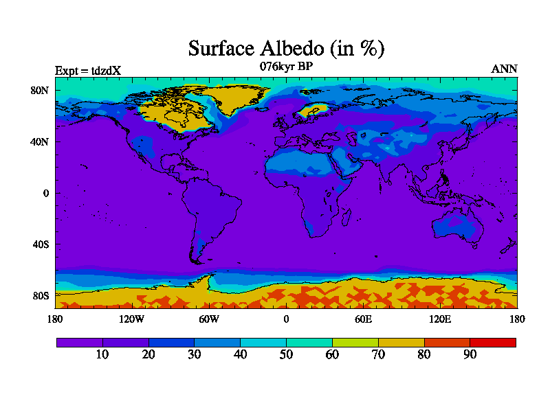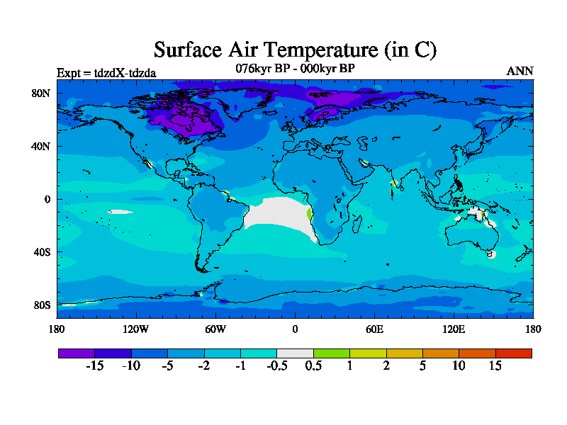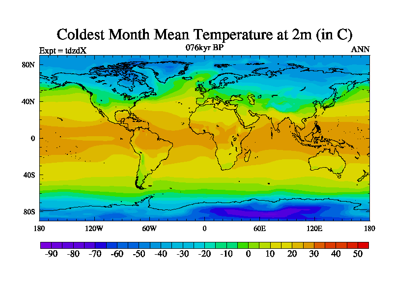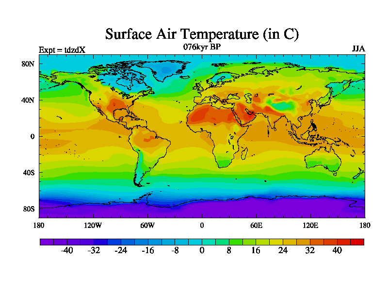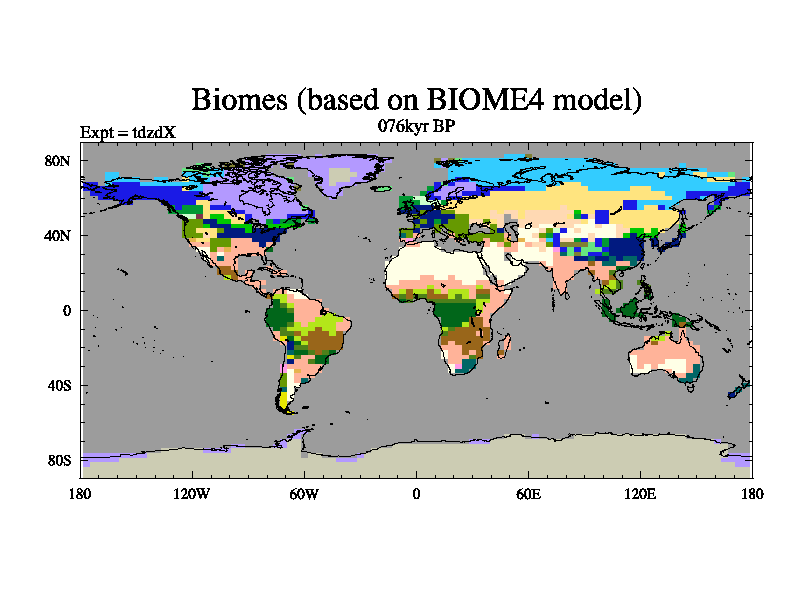 This is the 076kyr BP simulation for a new set of BBC runs using TRIFFID. Static mode, started from half way through tdxo set of simulations (new BBC static TRIFFID runs). This version includes the dark_respiration update. Vegetation is from the pre-industrial run tdwza, and CO2 is doubled over tdxo version.