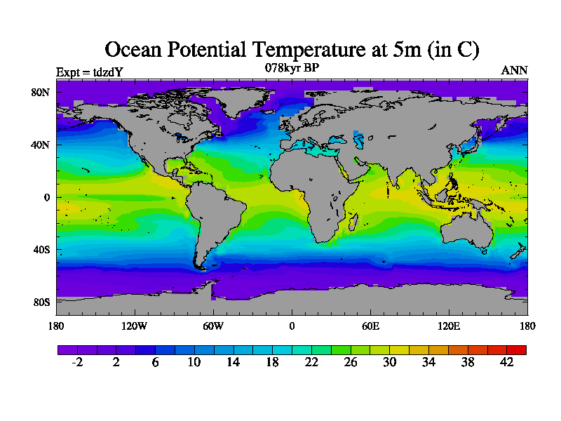 This is the 078kyr BP simulation for a new set of BBC runs using TRIFFID. Static mode, started from half way through tdxo set of simulations (new BBC static TRIFFID runs). This version includes the dark_respiration update. Vegetation is from the pre-industrial run tdwza, and CO2 is doubled over tdxo version.