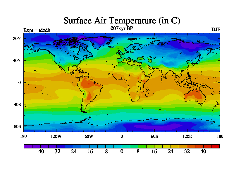 This is the 007kyr BP simulation for a new set of BBC runs using TRIFFID. Static mode, started from half way through tdxo set of simulations (new BBC static TRIFFID runs). This version includes the dark_respiration update. Vegetation is from the pre-industrial run tdwza, and CO2 is doubled over tdxo version.