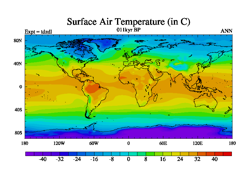 This is the 011kyr BP simulation for a new set of BBC runs using TRIFFID. Static mode, started from half way through tdxo set of simulations (new BBC static TRIFFID runs). This version includes the dark_respiration update. Vegetation is from the pre-industrial run tdwza, and CO2 is doubled over tdxo version.
