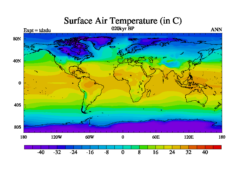 This is the 020kyr BP simulation for a new set of BBC runs using TRIFFID. Static mode, started from half way through tdxo set of simulations (new BBC static TRIFFID runs). This version includes the dark_respiration update. Vegetation is from the pre-industrial run tdwza, and CO2 is doubled over tdxo version.