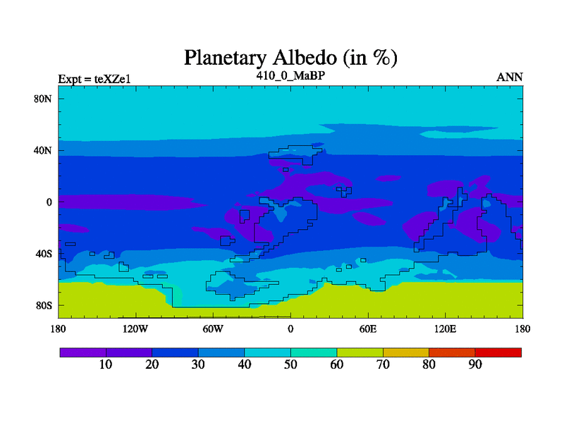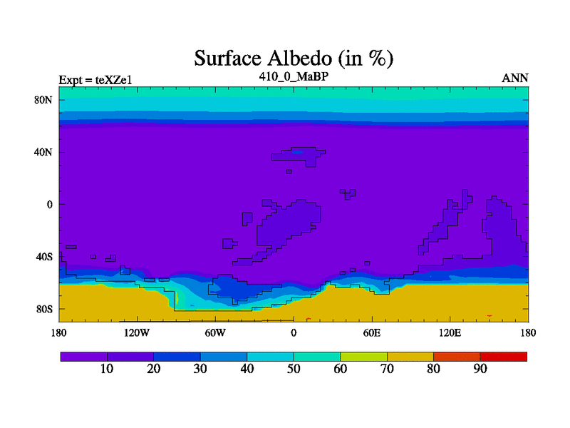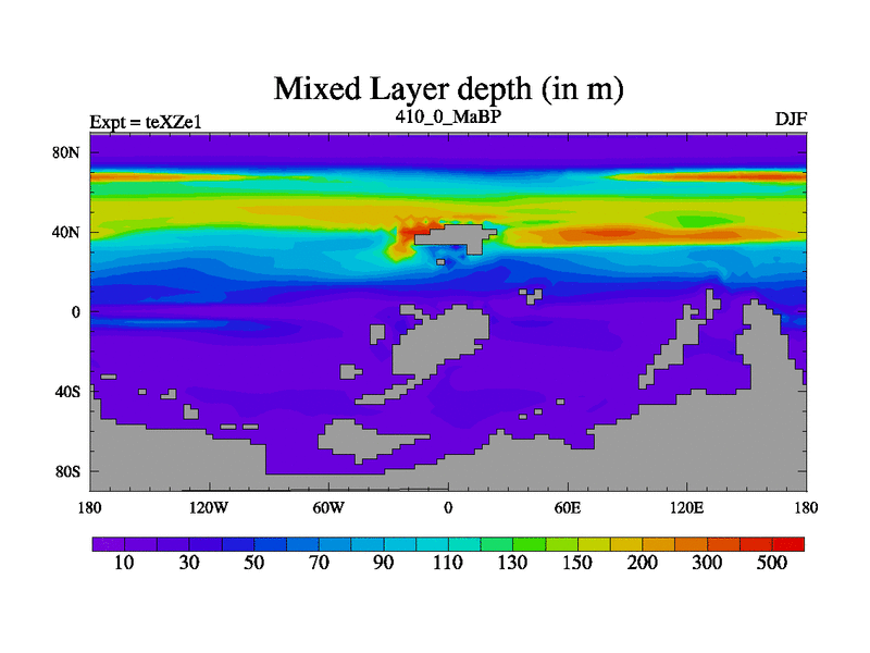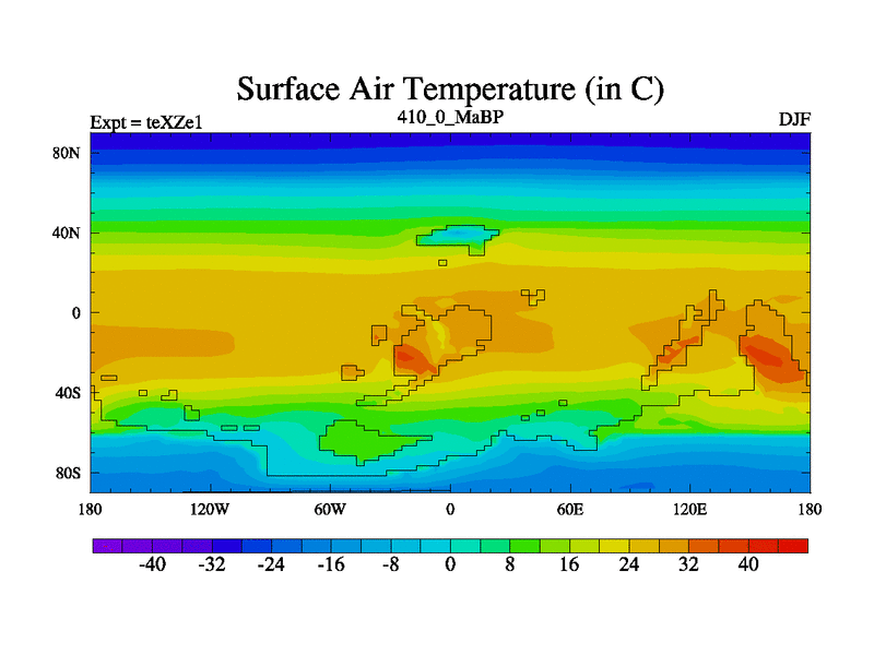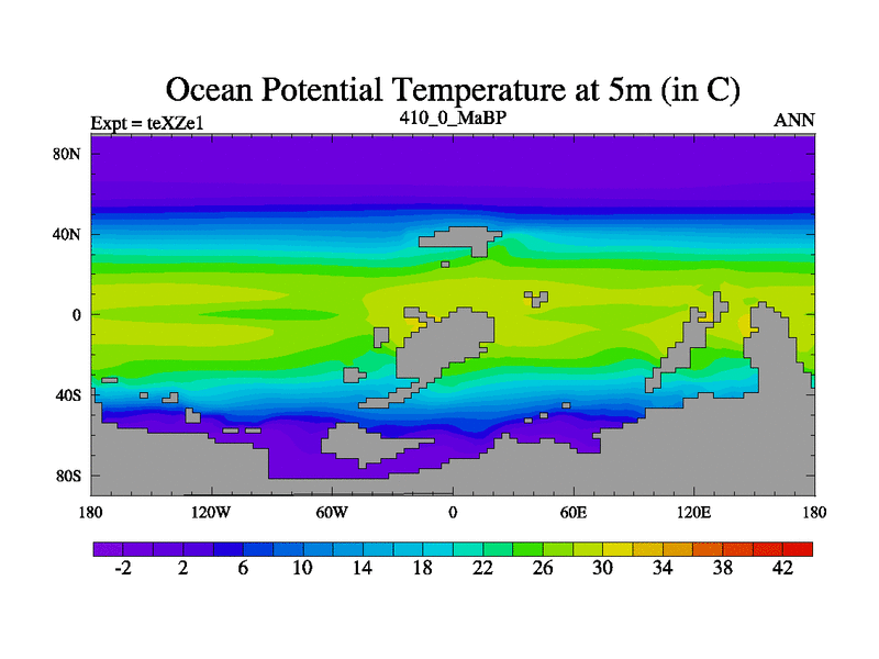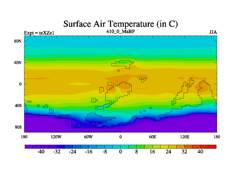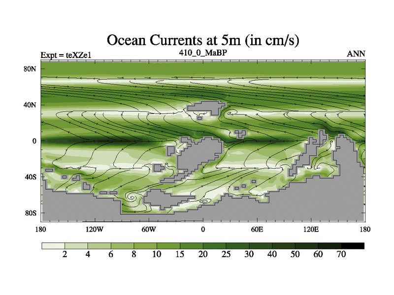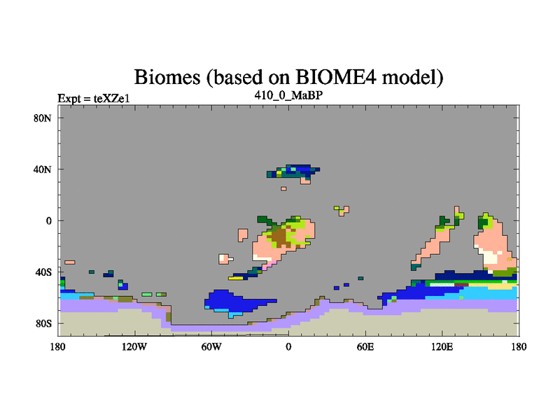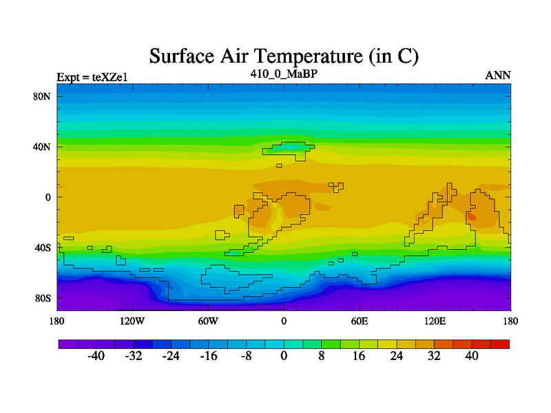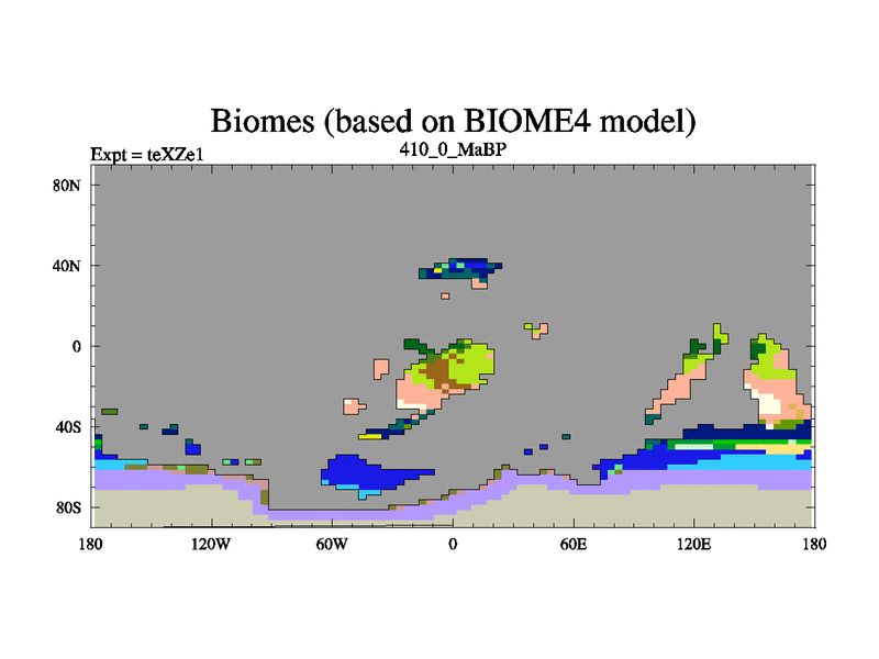 This is the 410.0 Ma simulation using the Scotese palaeogeographies. Extension of the tex[f..j] series.