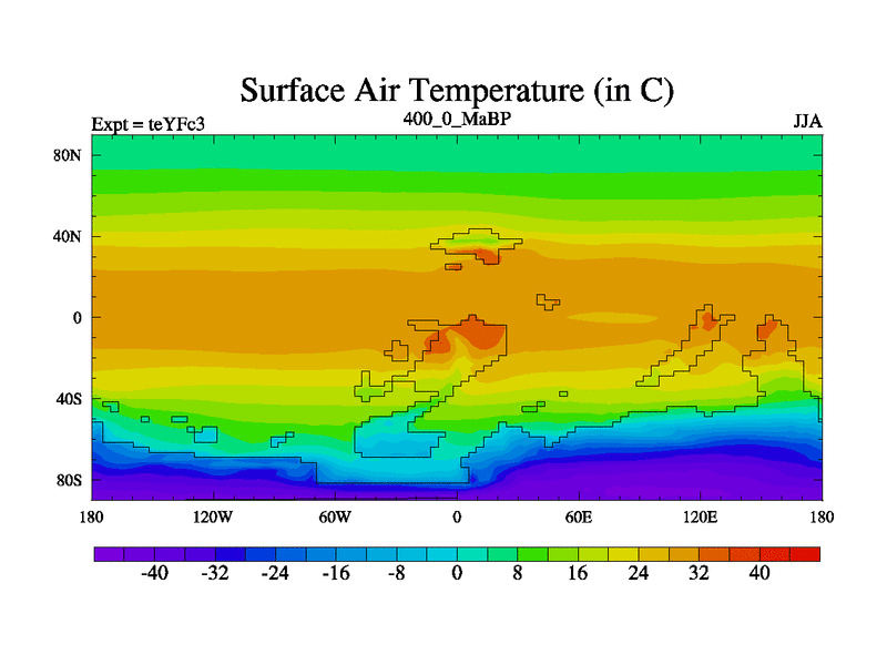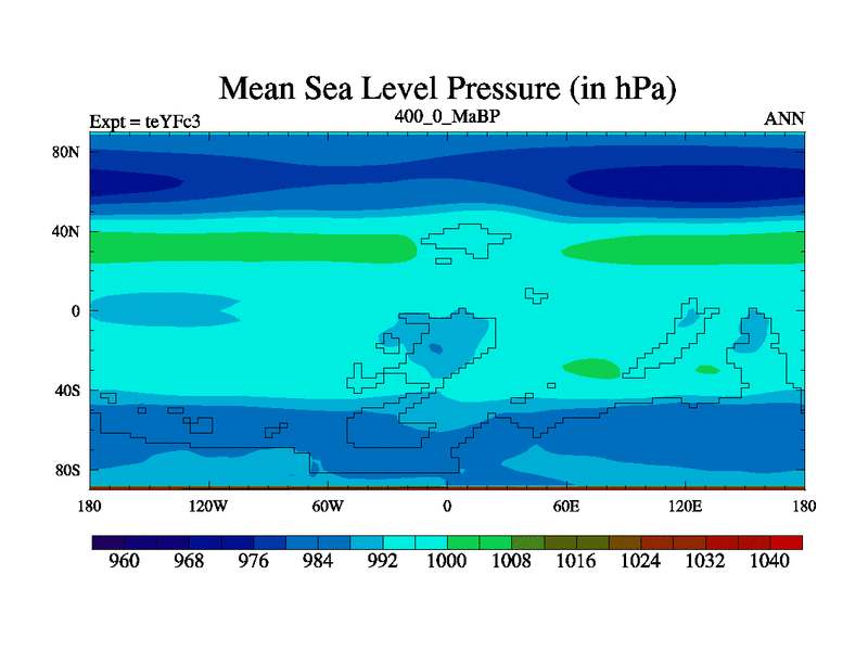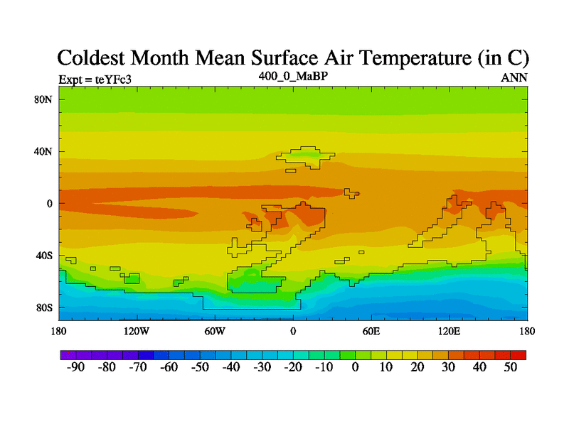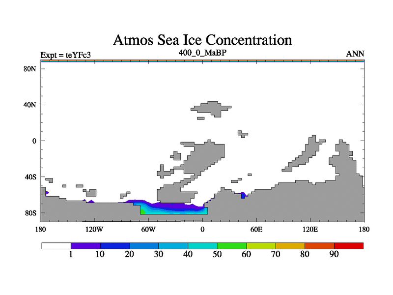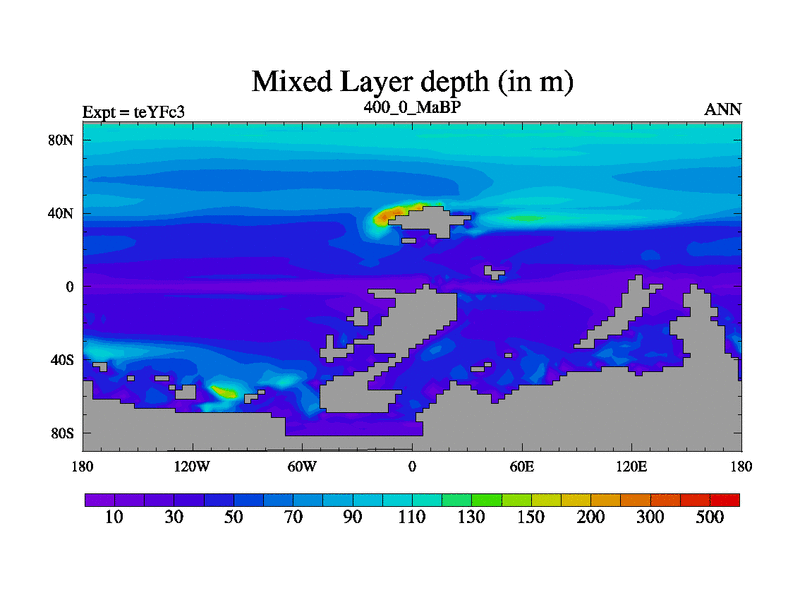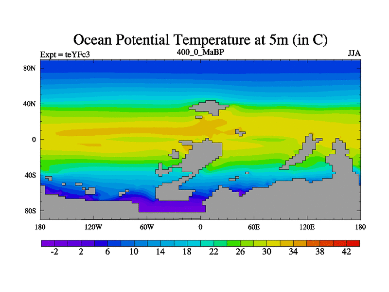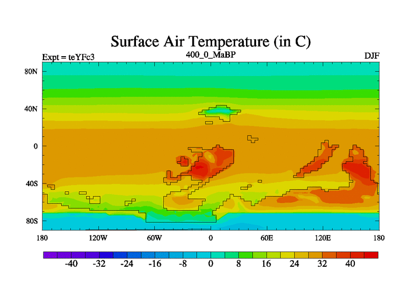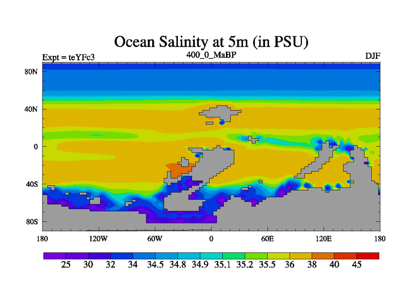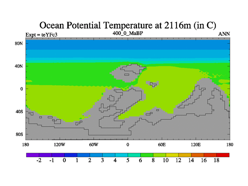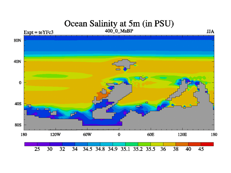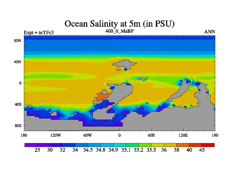 This is the 400.0 Ma simulation using the Scotese palaeogeographies and revised CCN etc. Updated HadCM3L ocean parameters and soil parameters. Also made sure orography gravity wave drag was consistent.