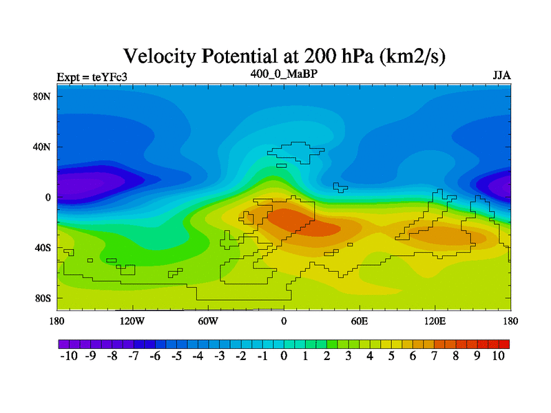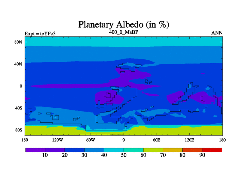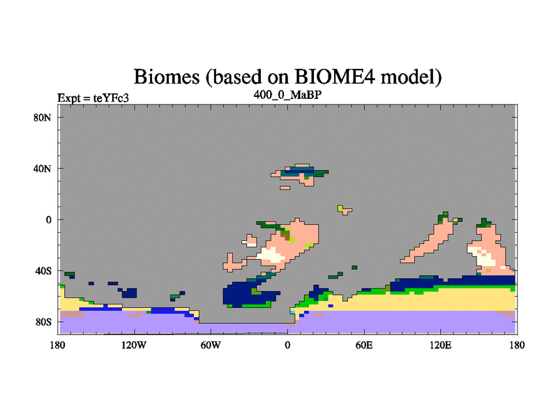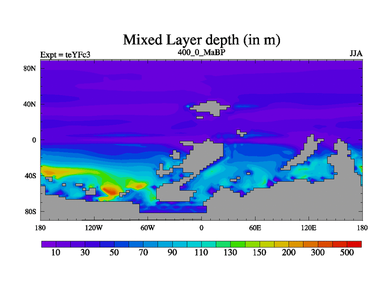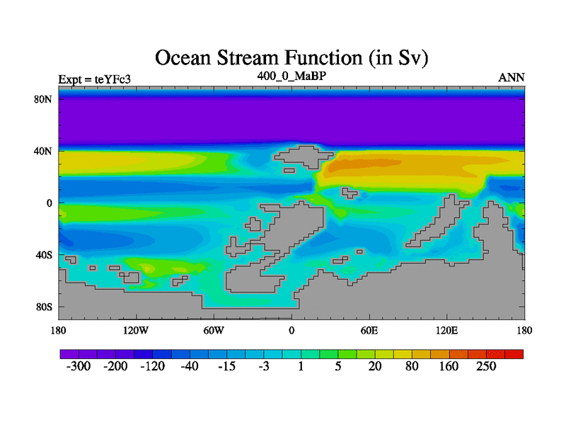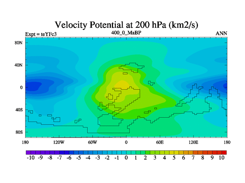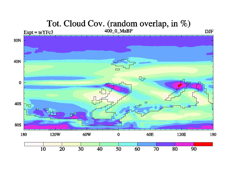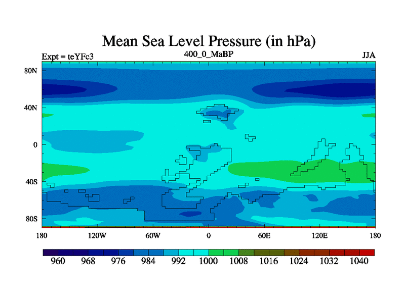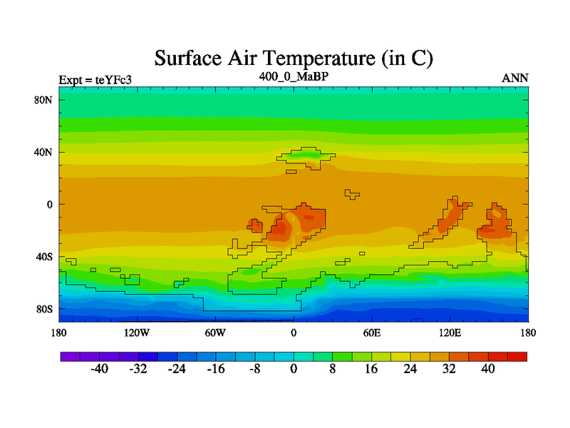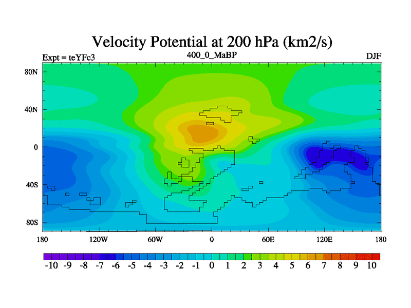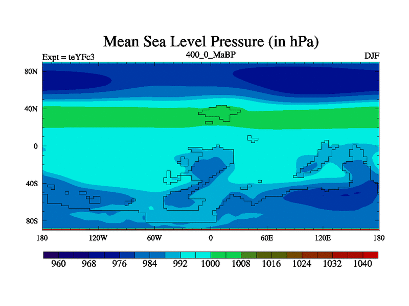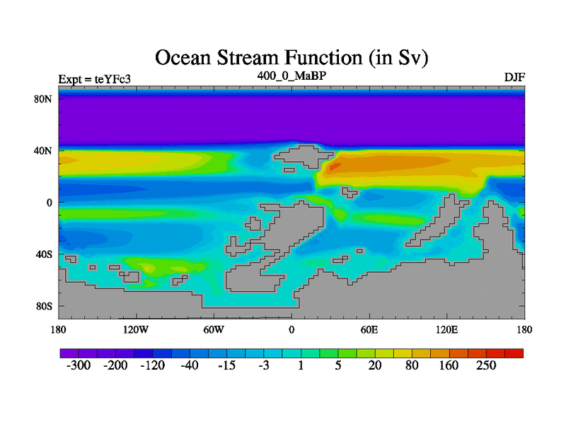 This is the 400.0 Ma simulation using the Scotese palaeogeographies and revised CCN etc. Updated HadCM3L ocean parameters and soil parameters. Also made sure orography gravity wave drag was consistent.