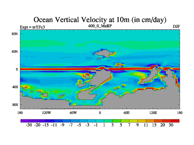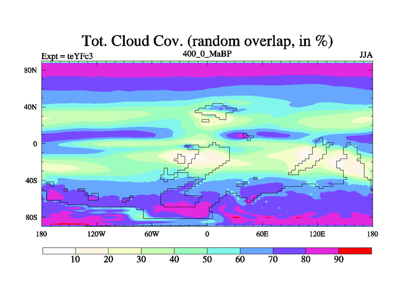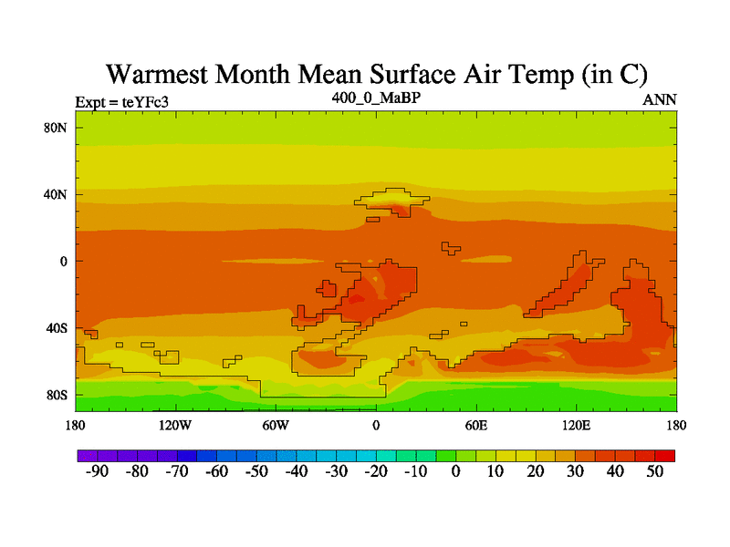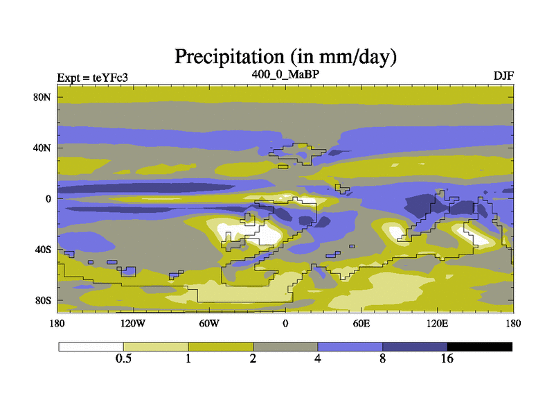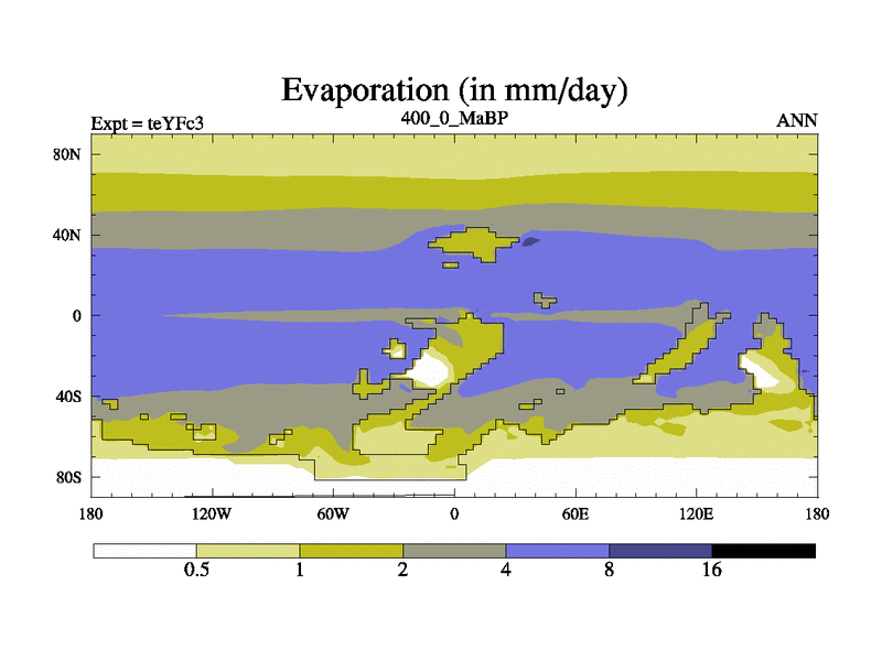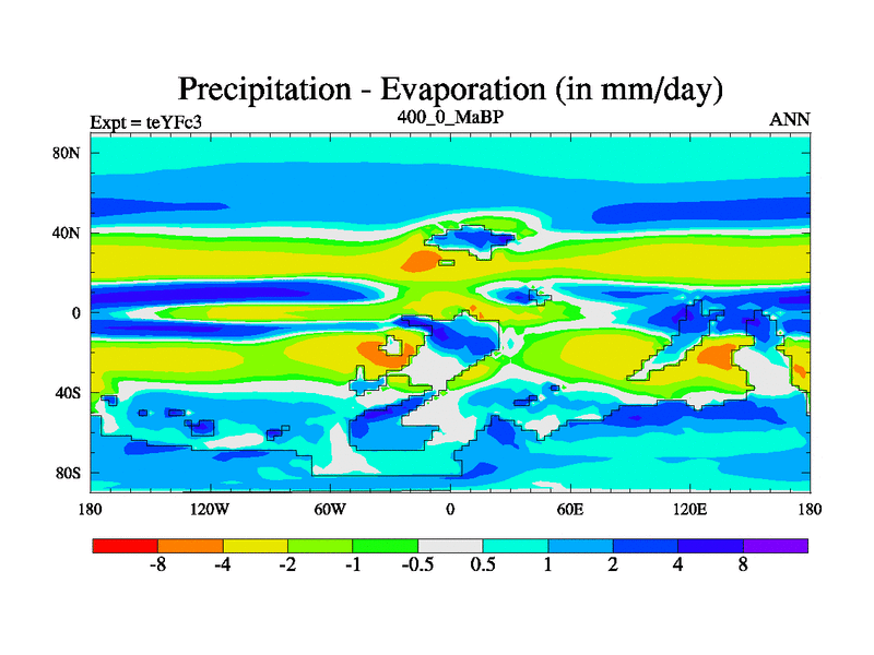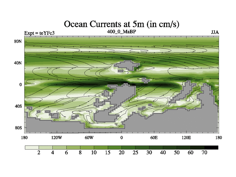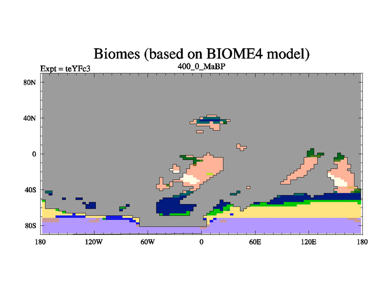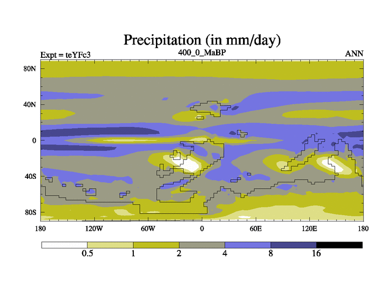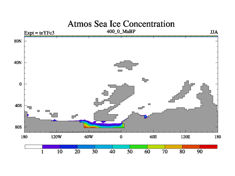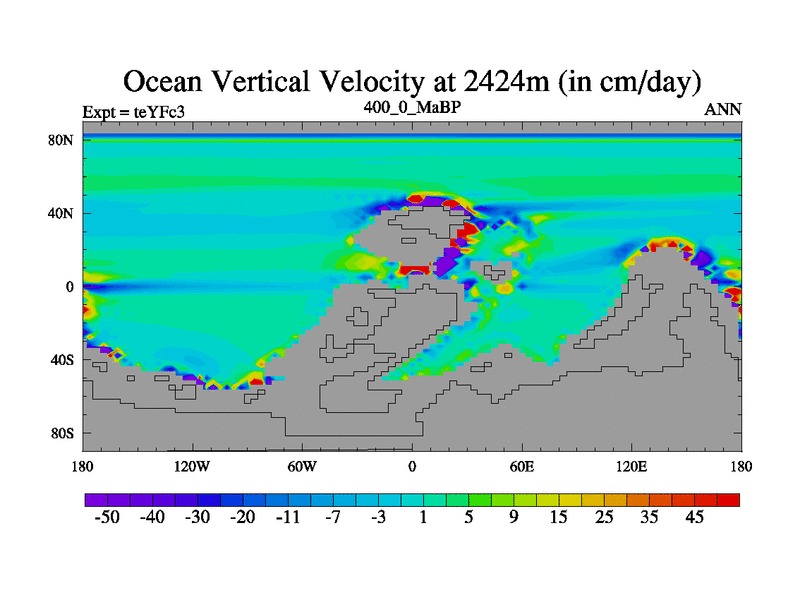 This is the 400.0 Ma simulation using the Scotese palaeogeographies and revised CCN etc. Updated HadCM3L ocean parameters and soil parameters. Also made sure orography gravity wave drag was consistent.