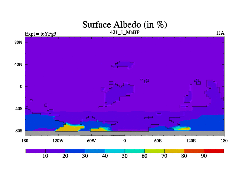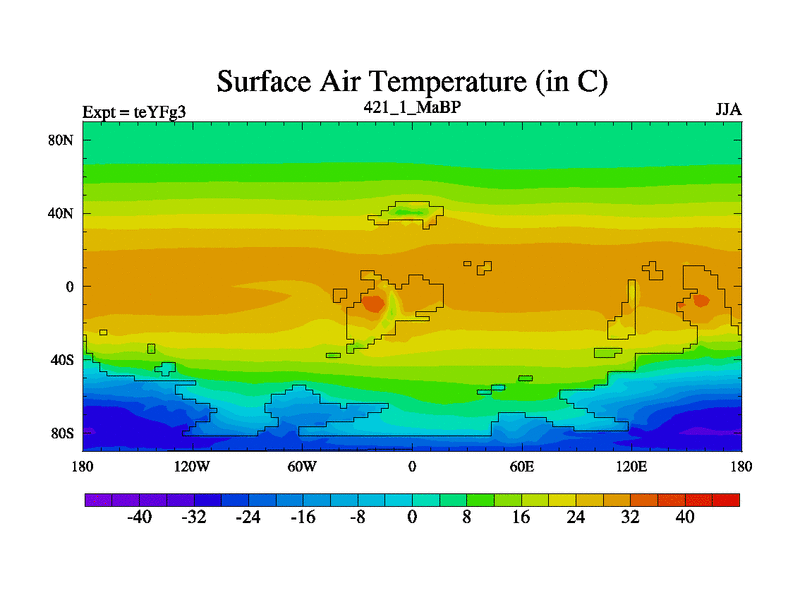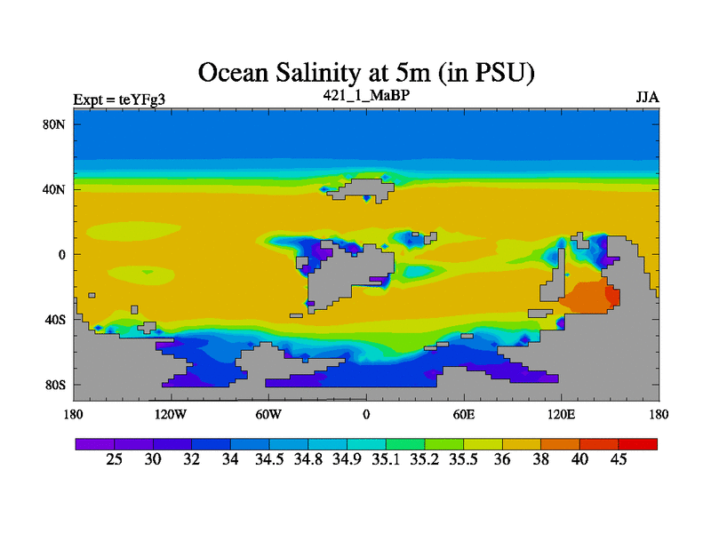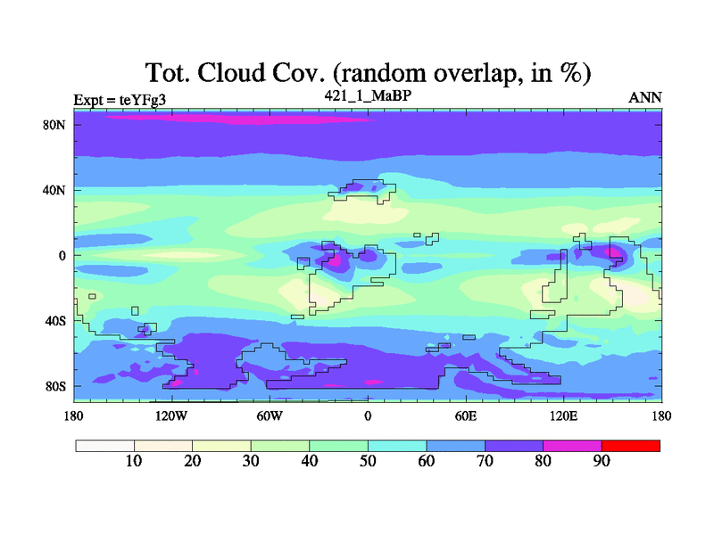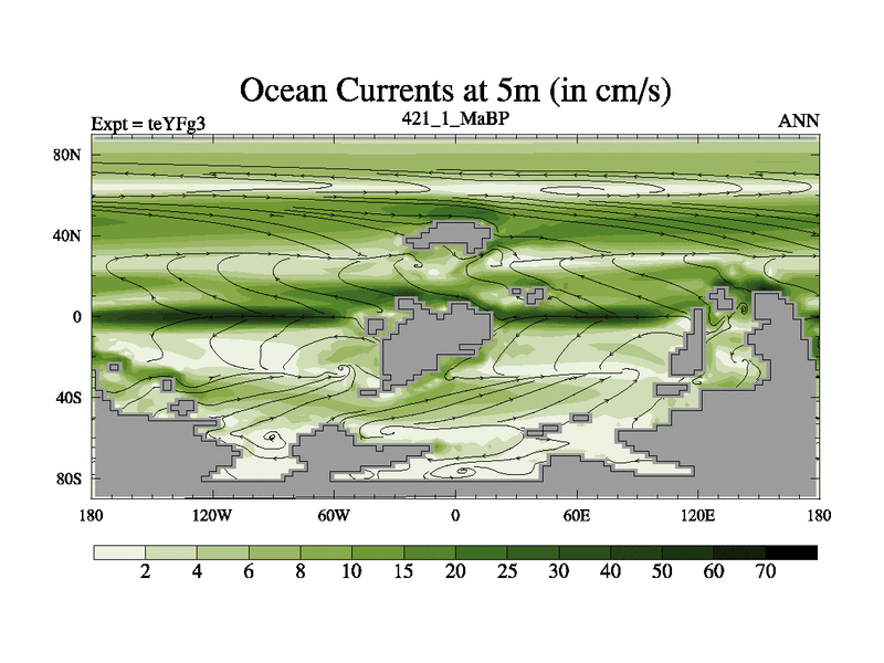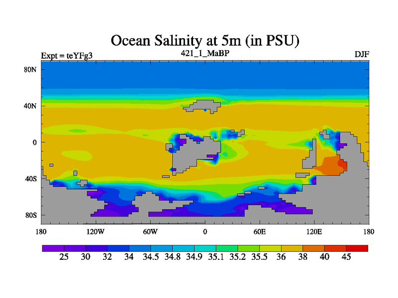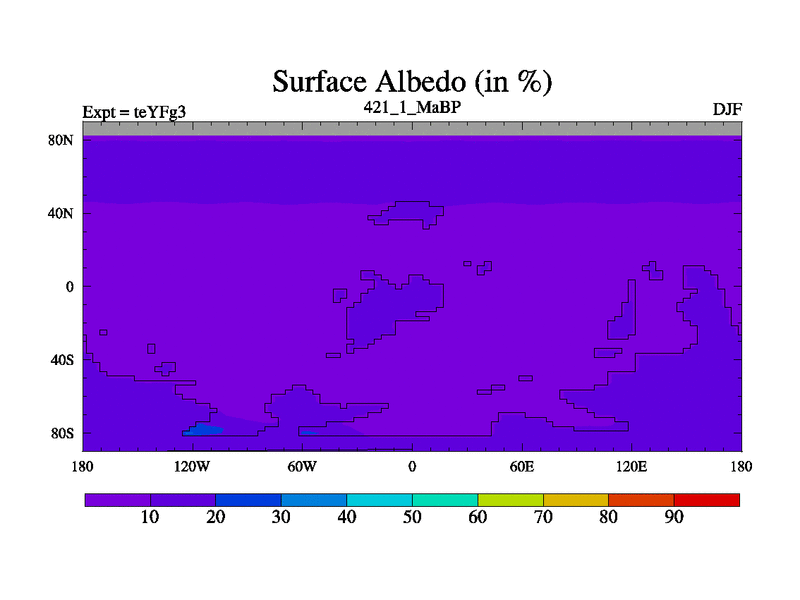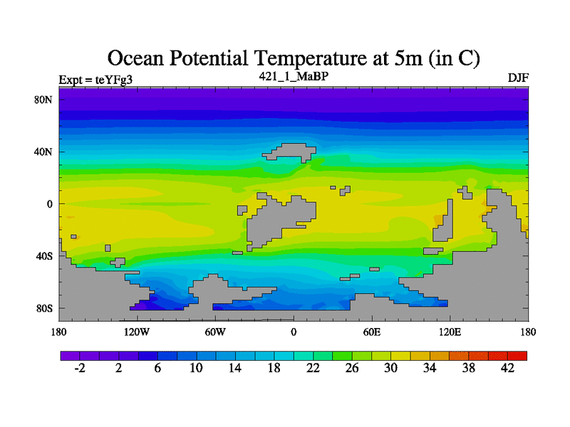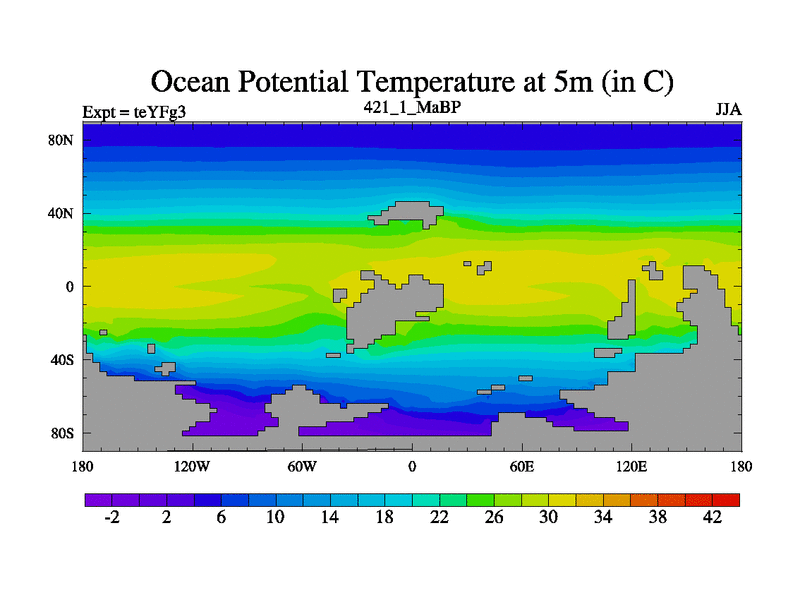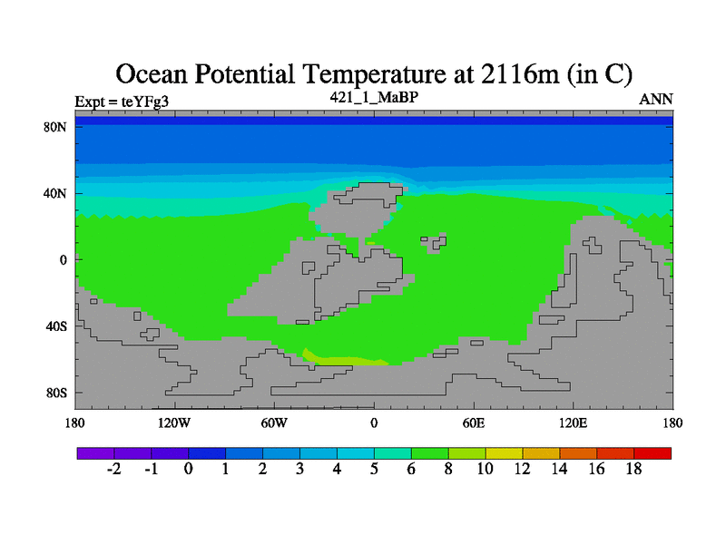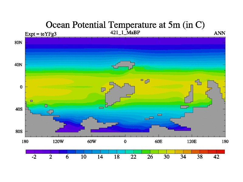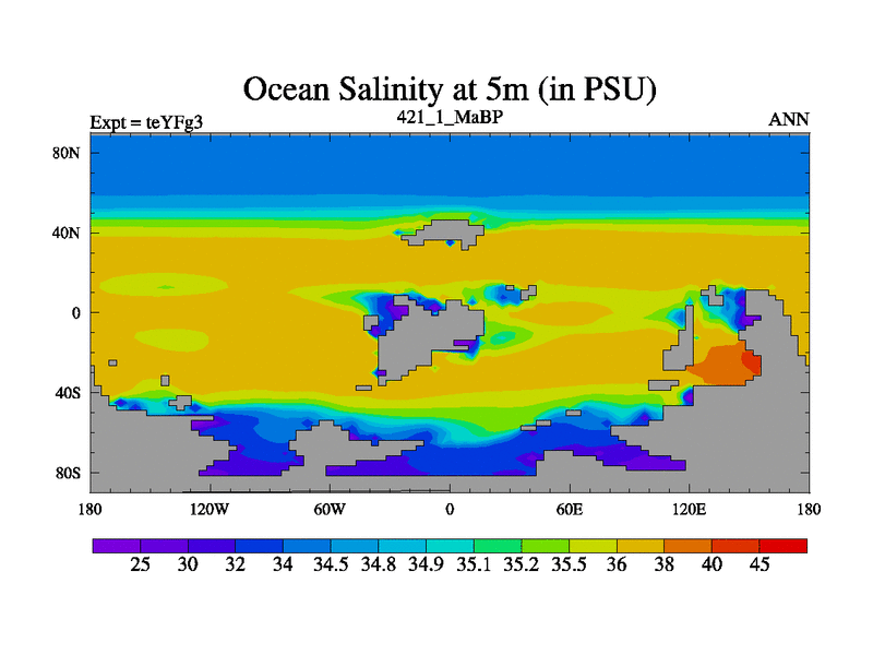 This is the 421.1 Ma simulation using the Scotese palaeogeographies and revised CCN etc. Updated HadCM3L ocean parameters and soil parameters. Also made sure orography gravity wave drag was consistent.