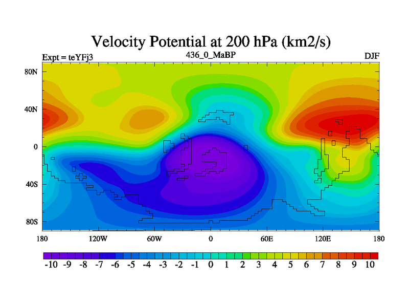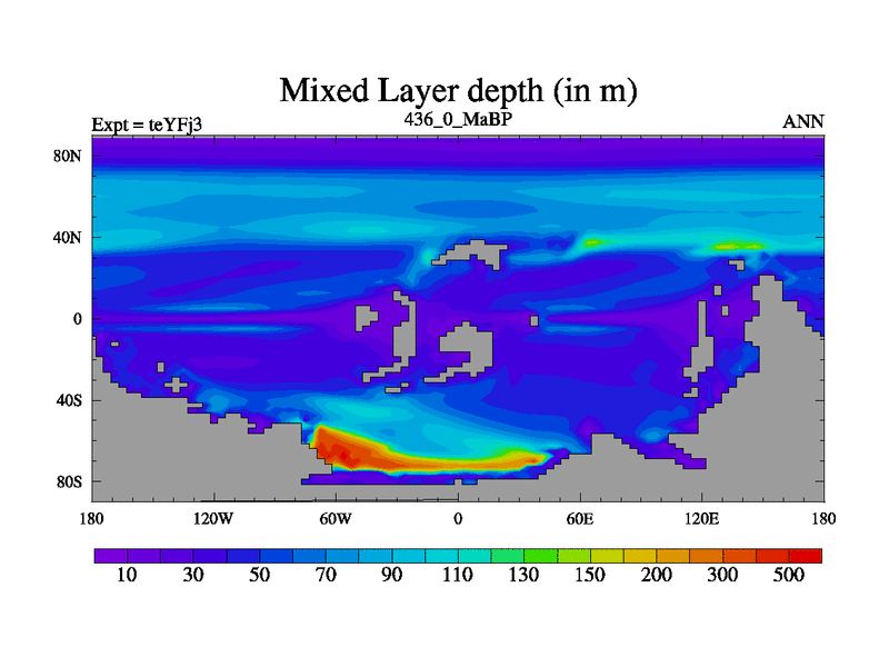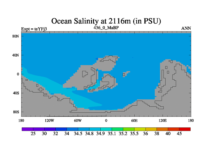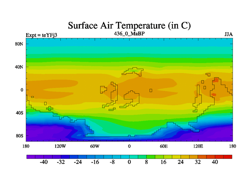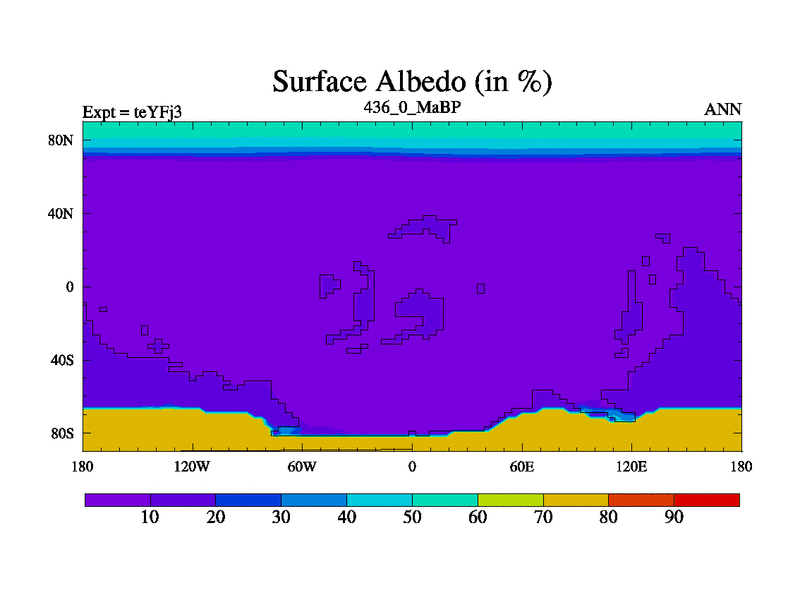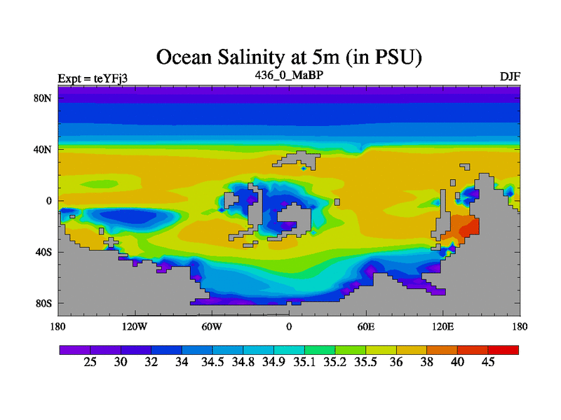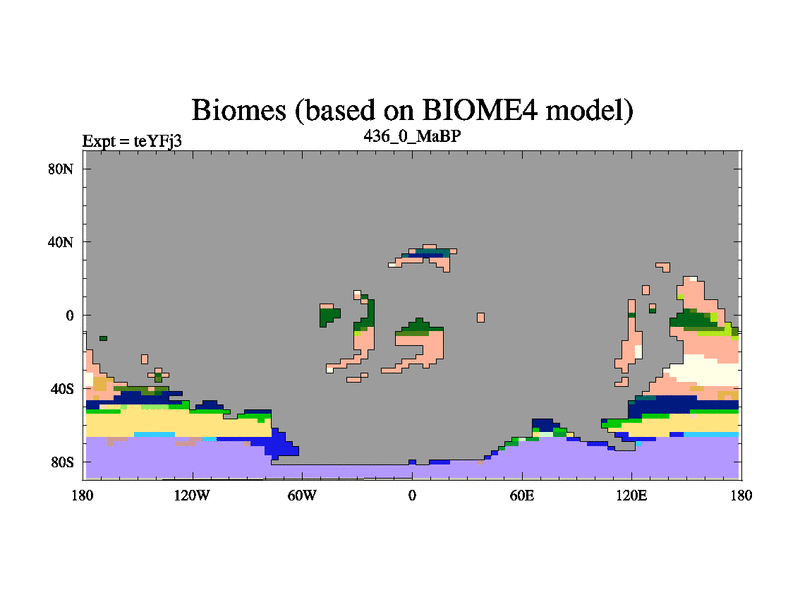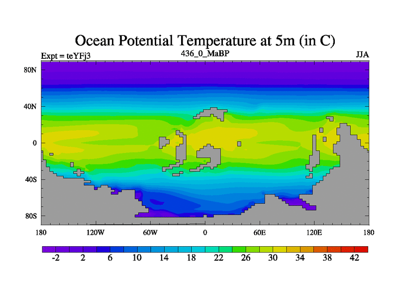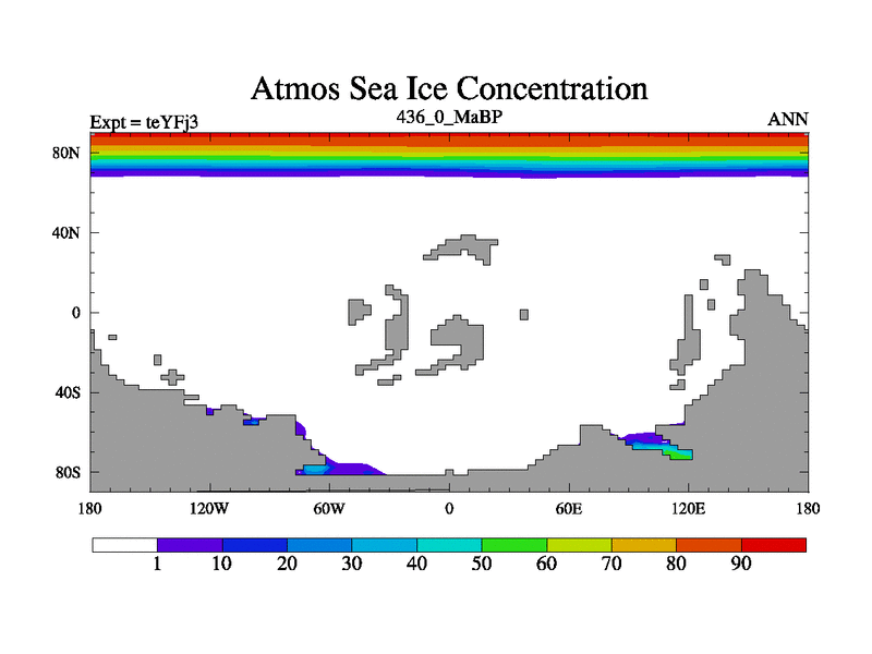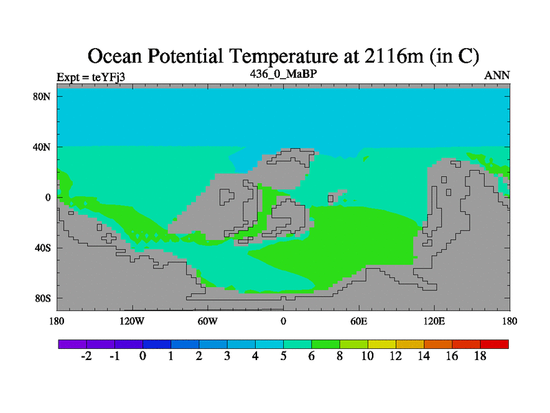 This is the 436.0 Ma simulation using the Scotese palaeogeographies and revised CCN etc. Updated HadCM3L ocean parameters and soil parameters. Also made sure orography gravity wave drag was consistent.