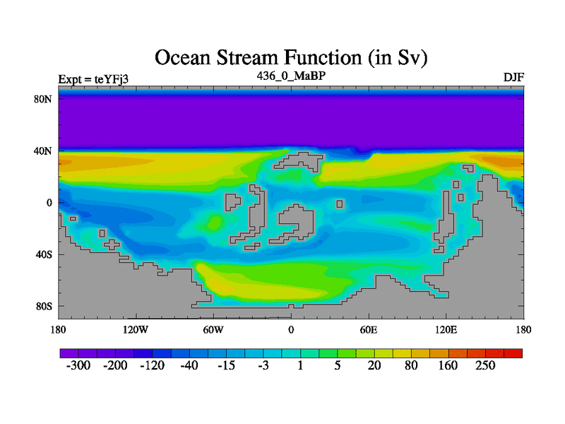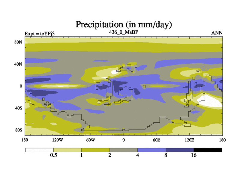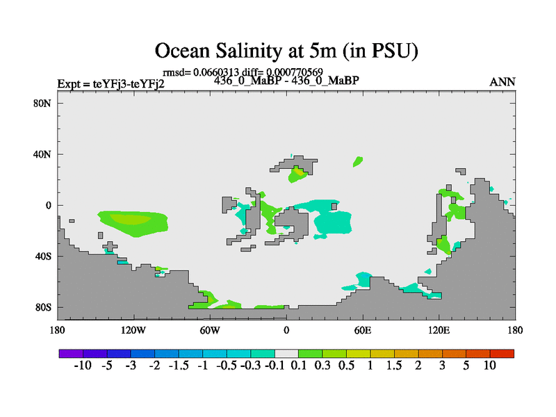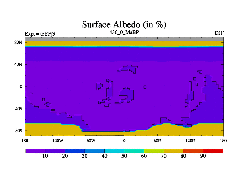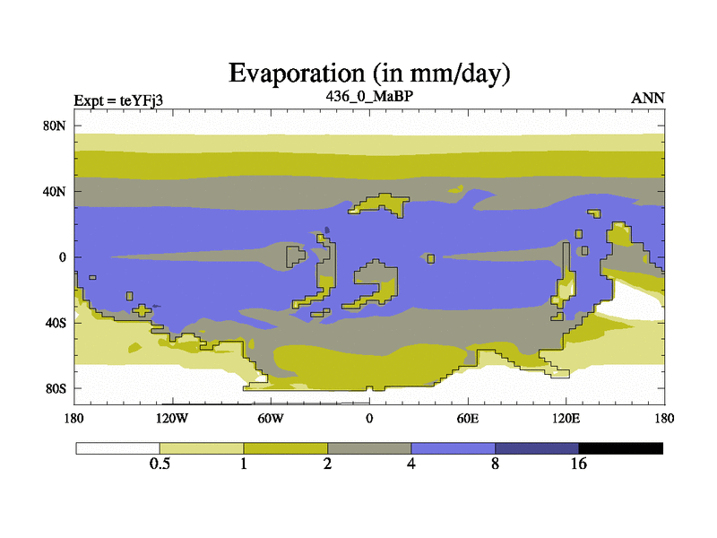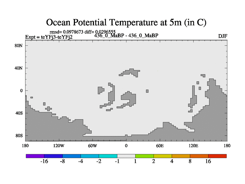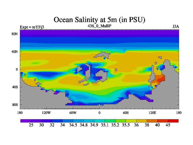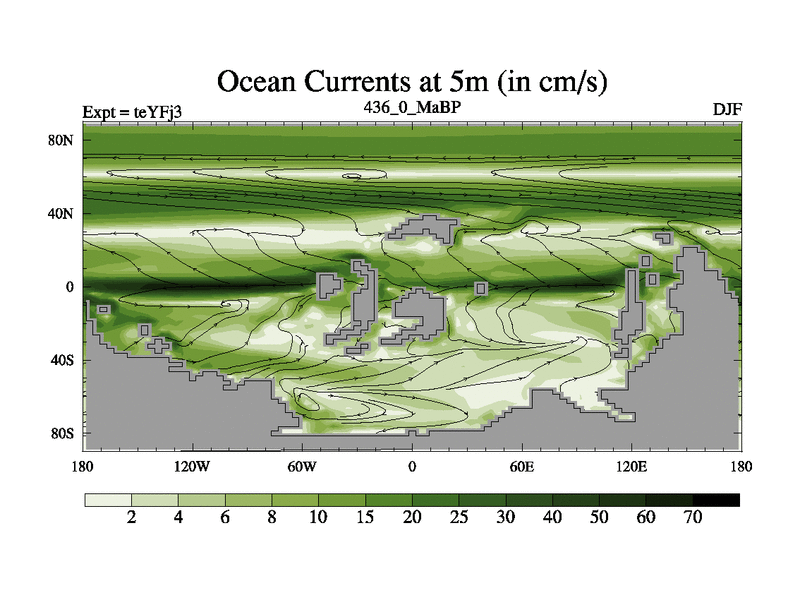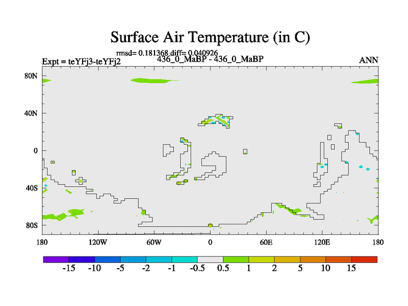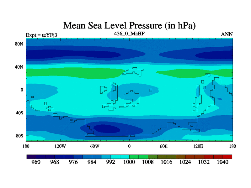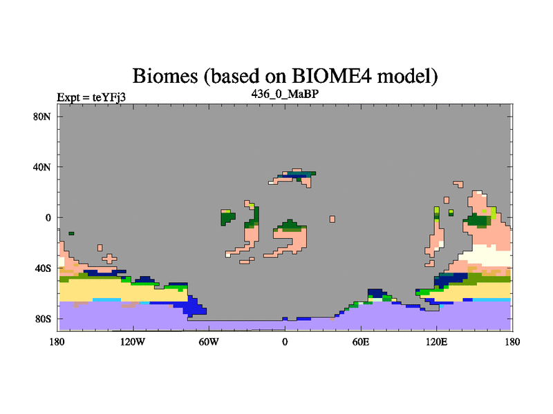 This is the 436.0 Ma simulation using the Scotese palaeogeographies and revised CCN etc. Updated HadCM3L ocean parameters and soil parameters. Also made sure orography gravity wave drag was consistent.