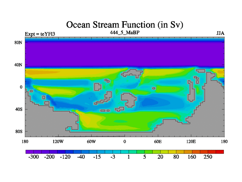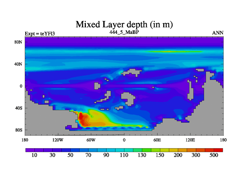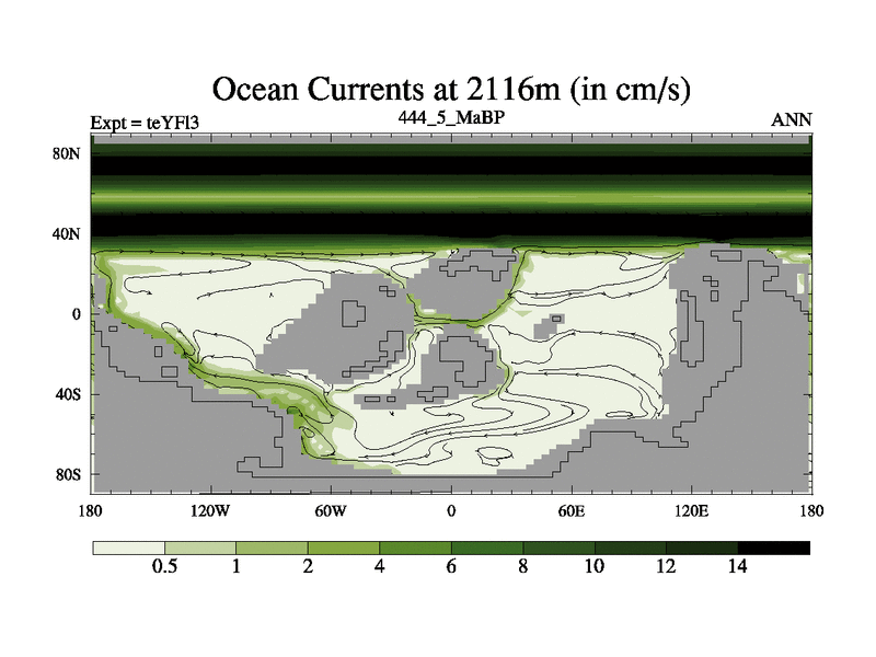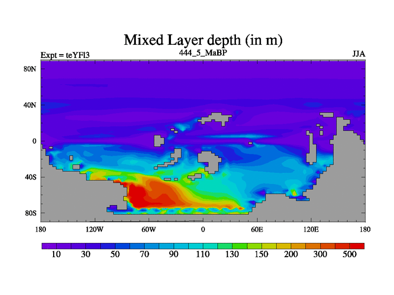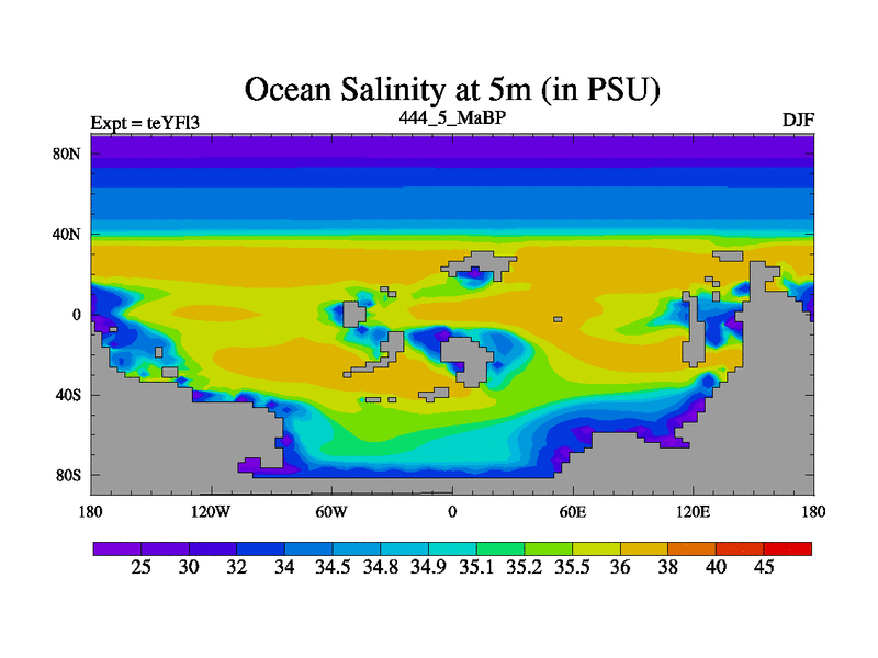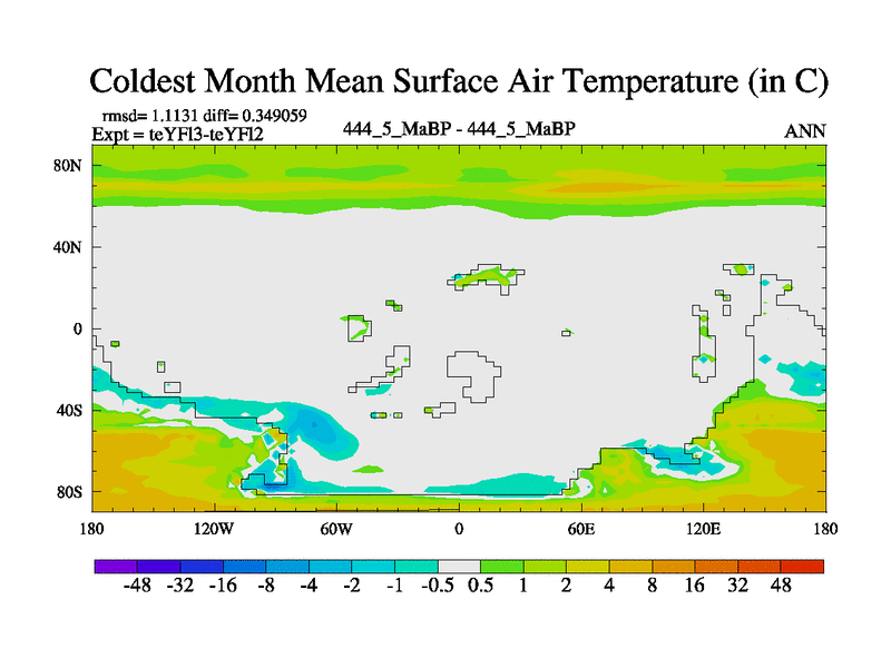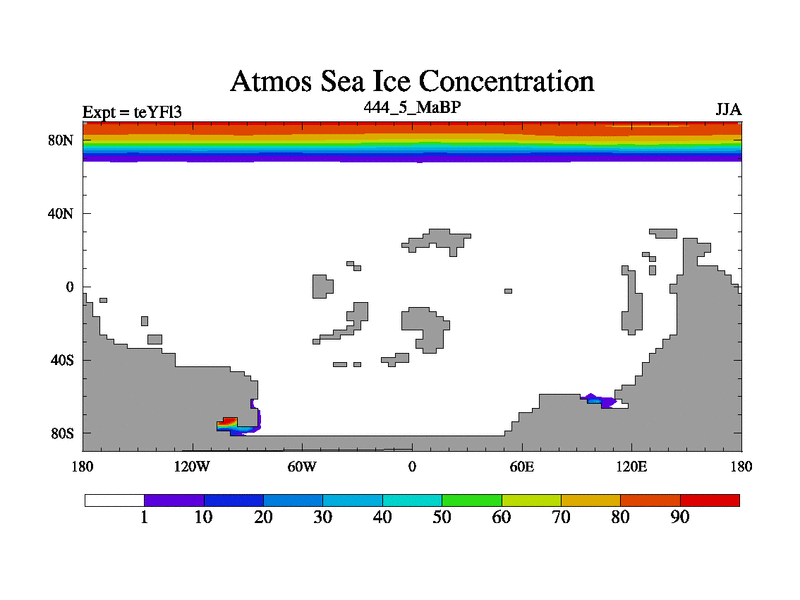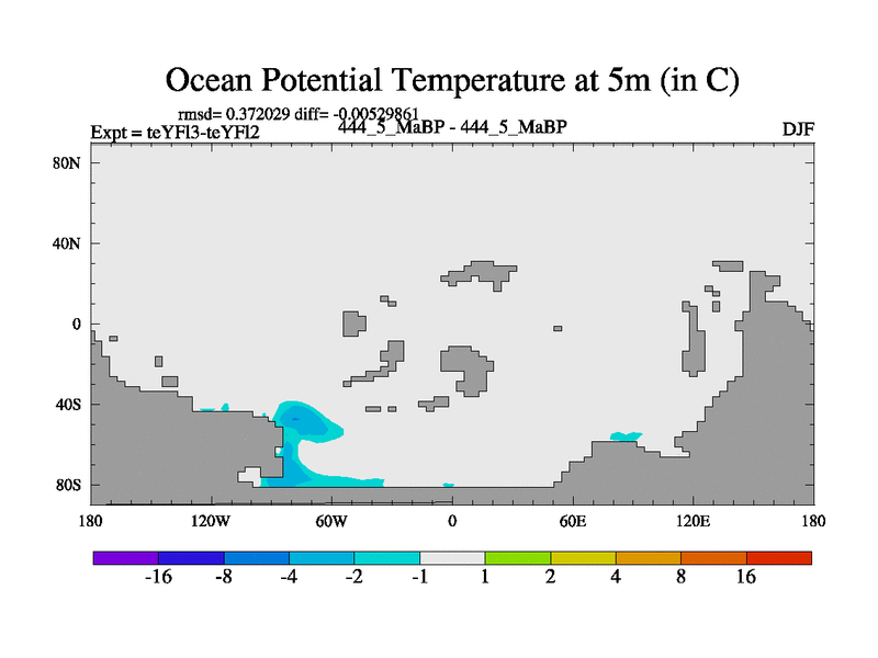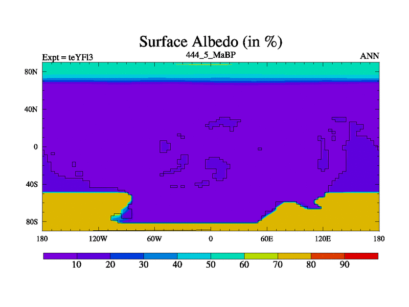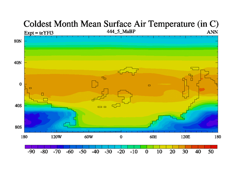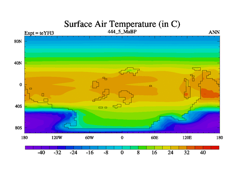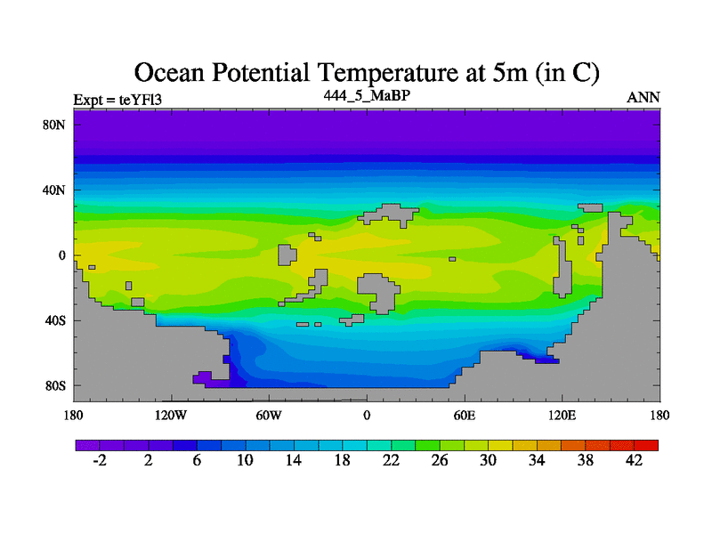 This is the 444.5 Ma simulation using the Scotese palaeogeographies and revised CCN etc. Updated HadCM3L ocean parameters and soil parameters. Also made sure orography gravity wave drag was consistent.