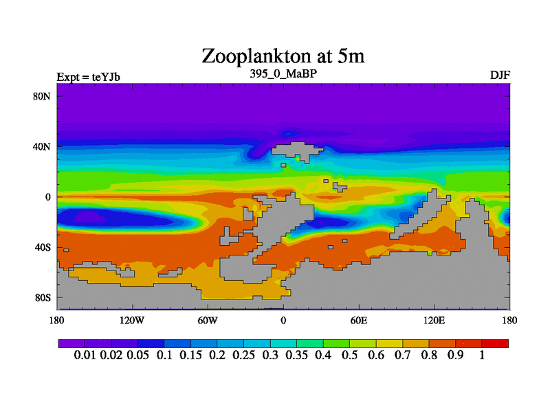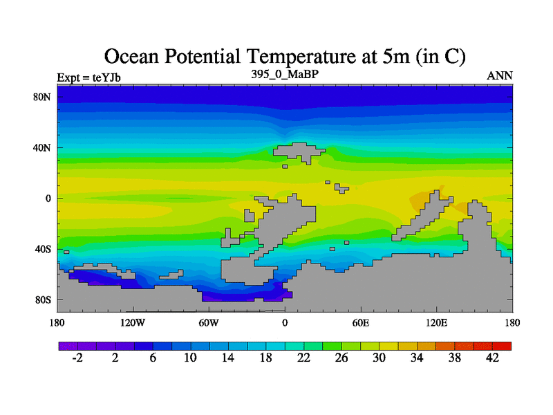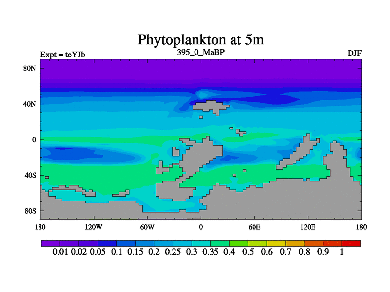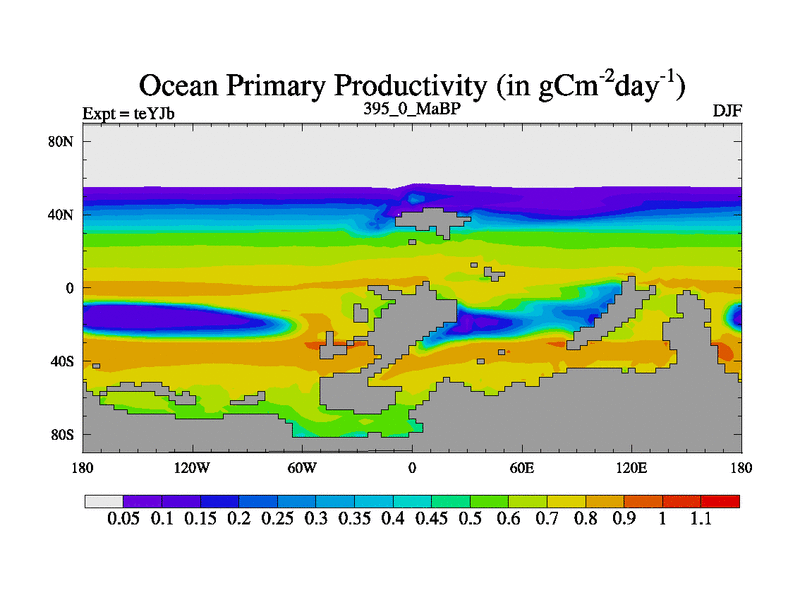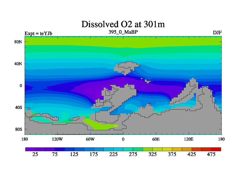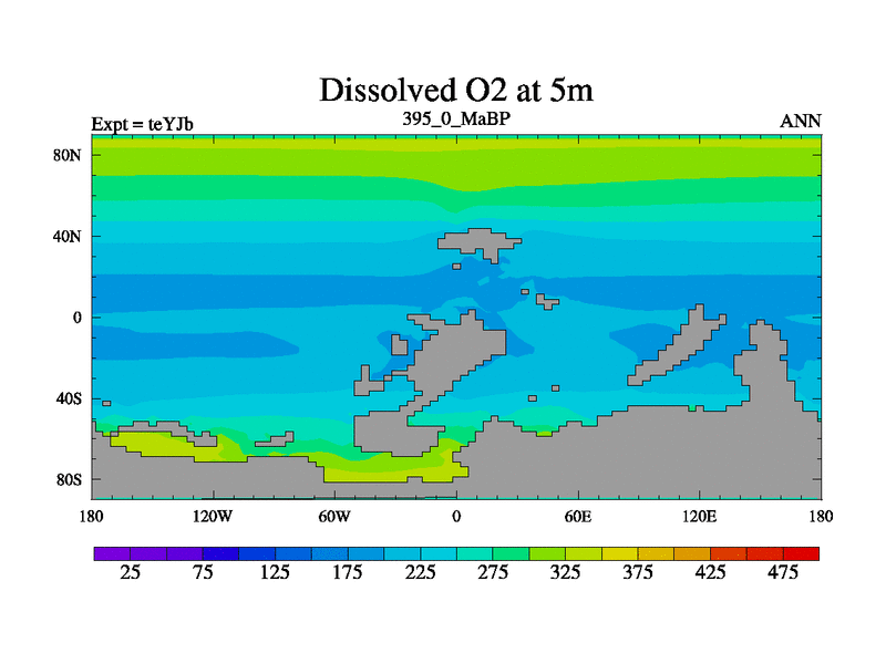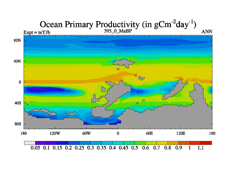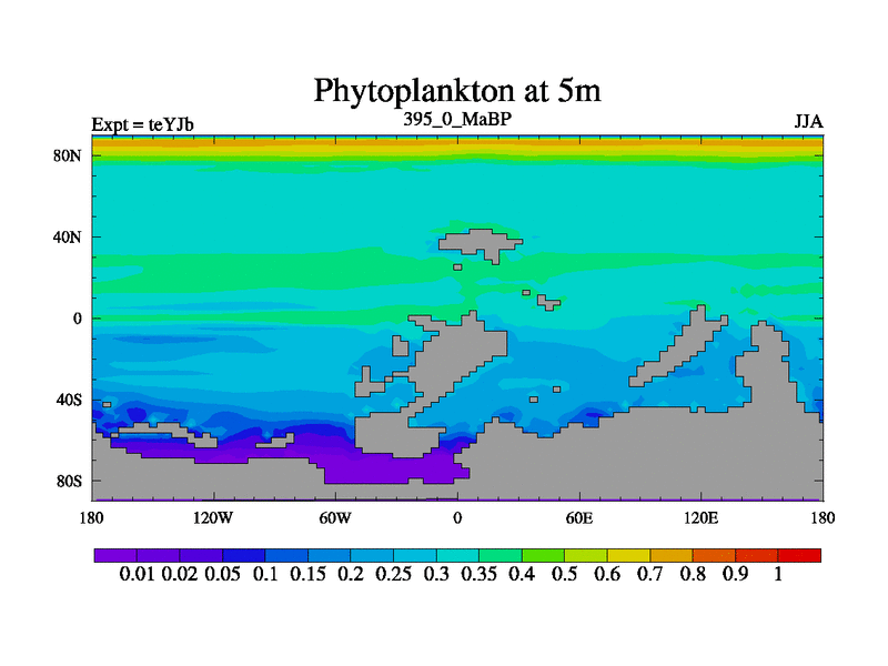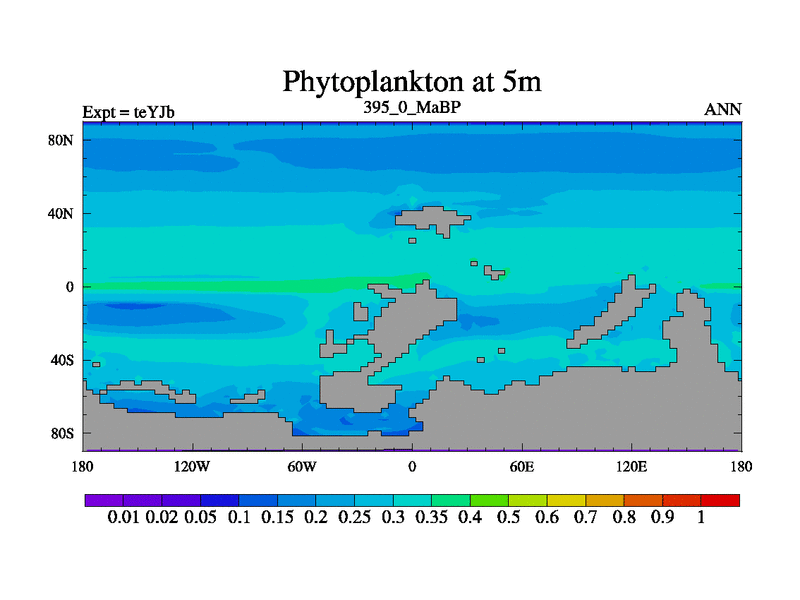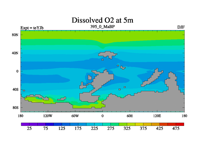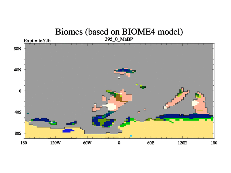 This is the 395.0 Ma simulation using the Scotese palaeogeographies and revised CCN etc. As teyfa3 but corrected orography problem over Antartartica. Now includes ocean biogeochemistry
