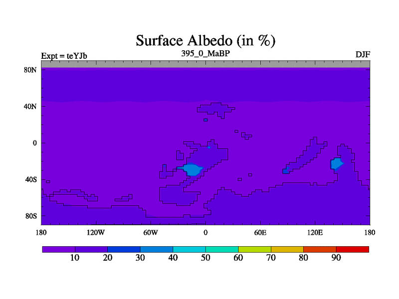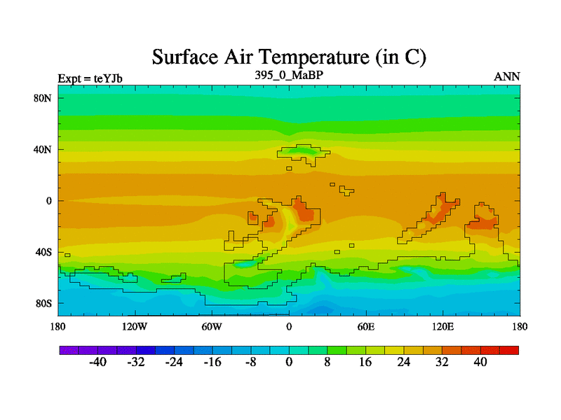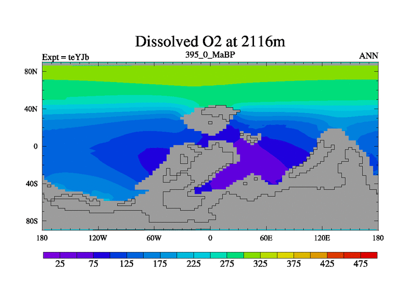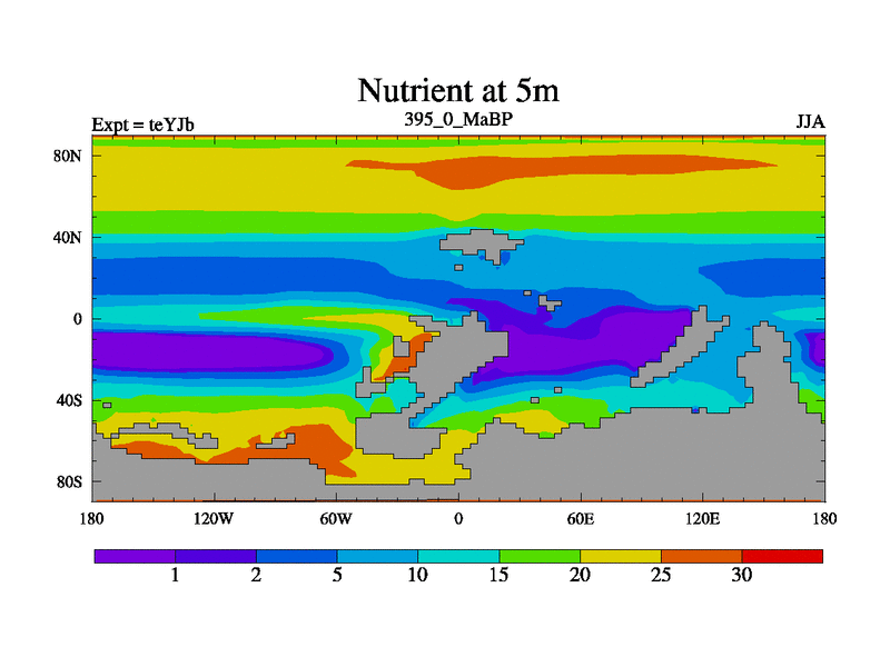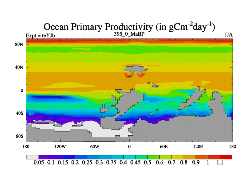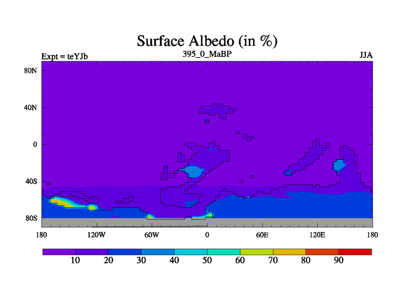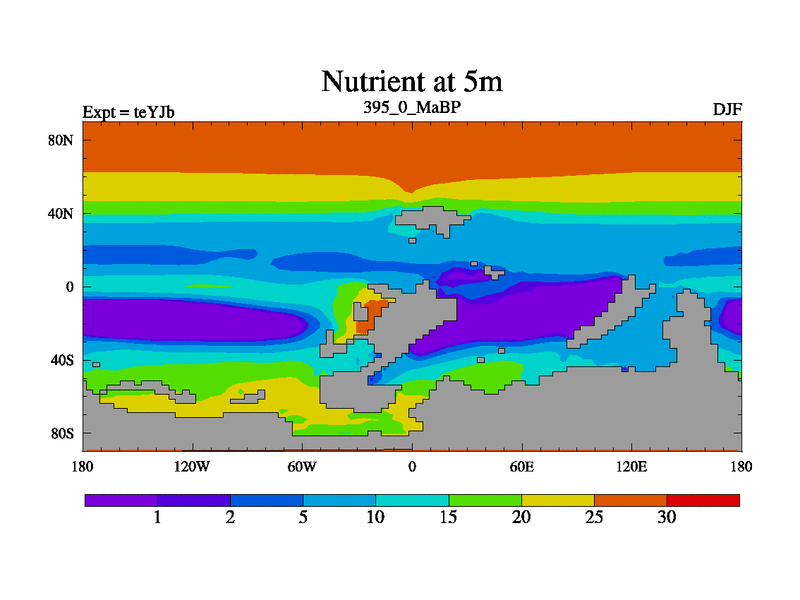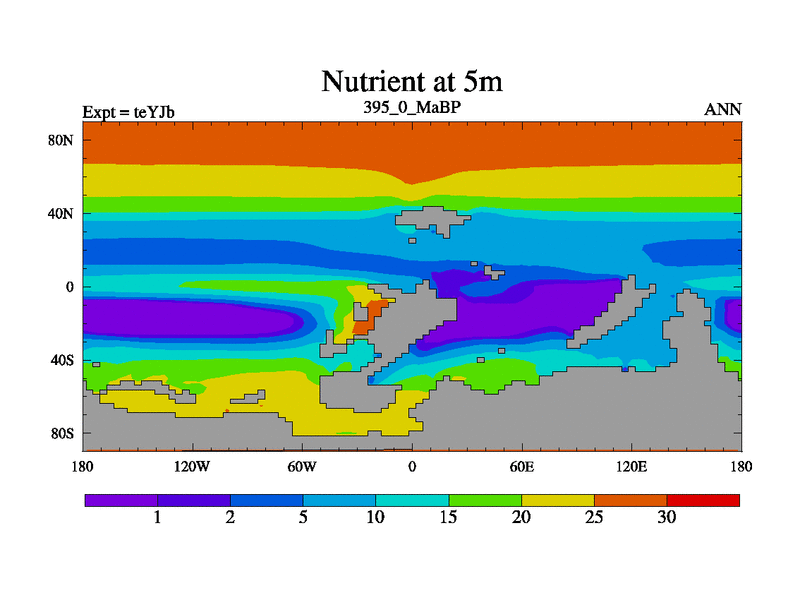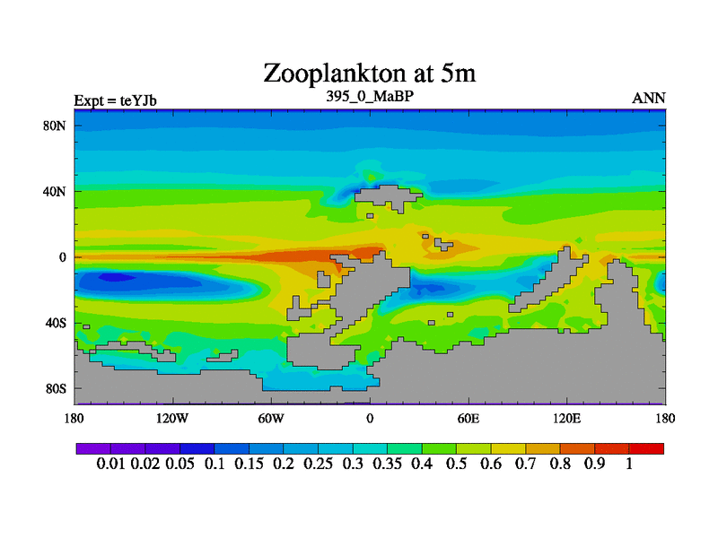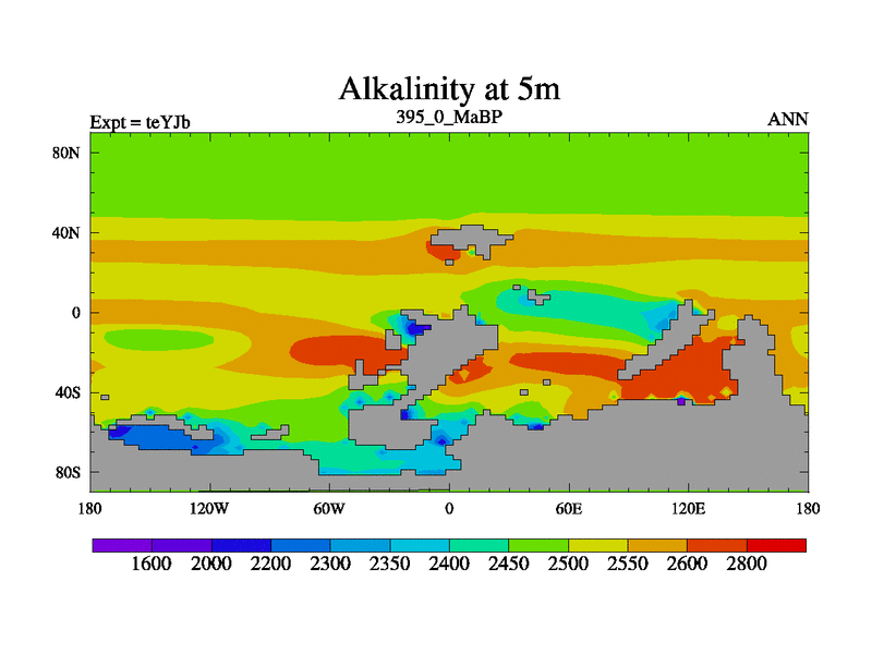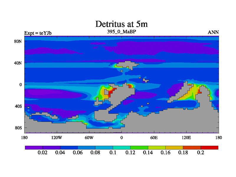 This is the 395.0 Ma simulation using the Scotese palaeogeographies and revised CCN etc. As teyfa3 but corrected orography problem over Antartartica. Now includes ocean biogeochemistry