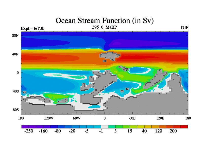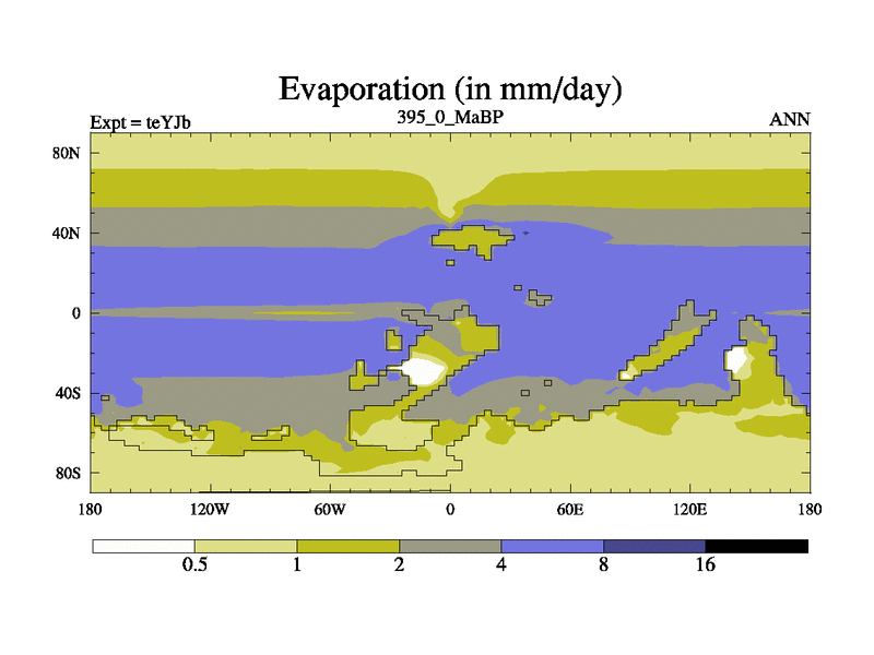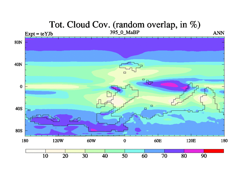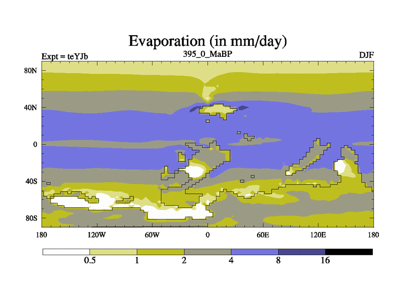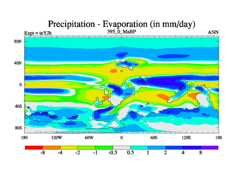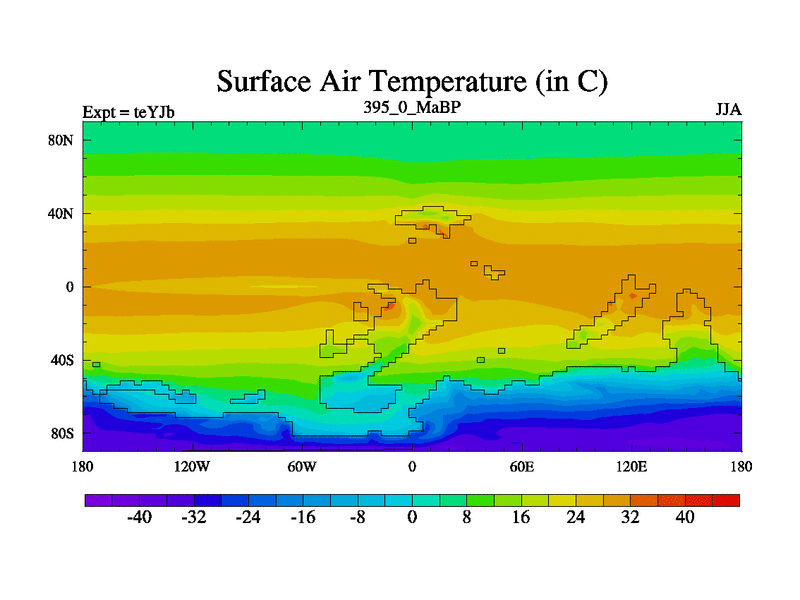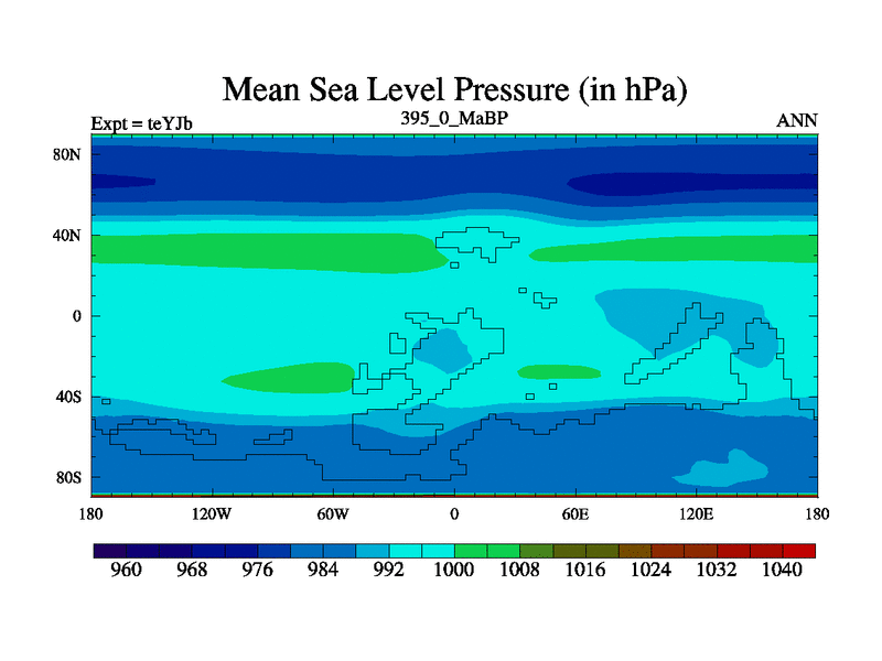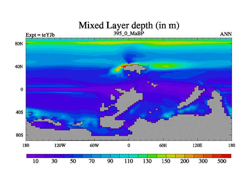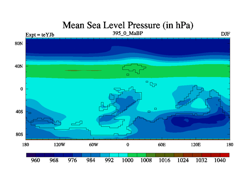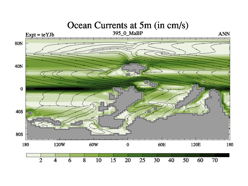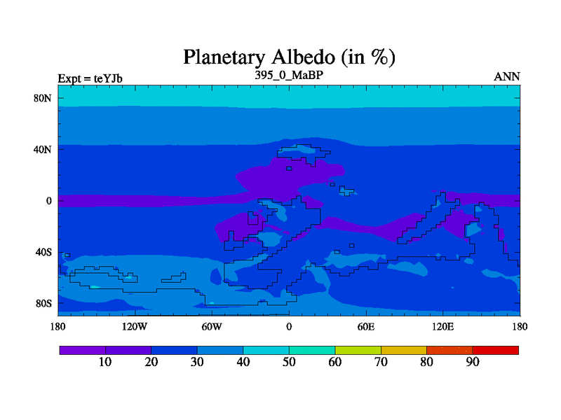 This is the 395.0 Ma simulation using the Scotese palaeogeographies and revised CCN etc. As teyfa3 but corrected orography problem over Antartartica. Now includes ocean biogeochemistry