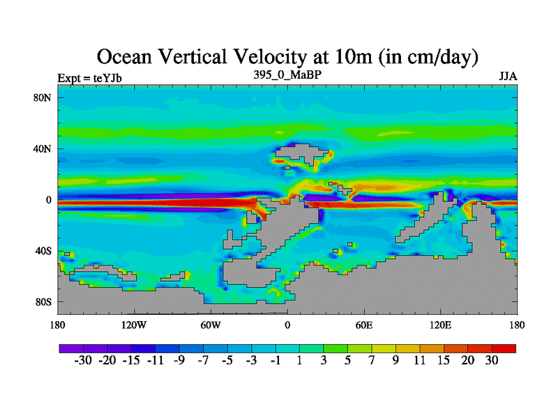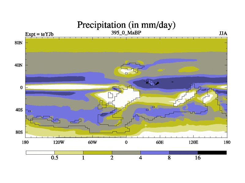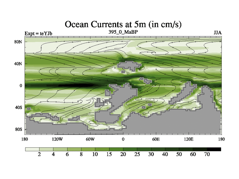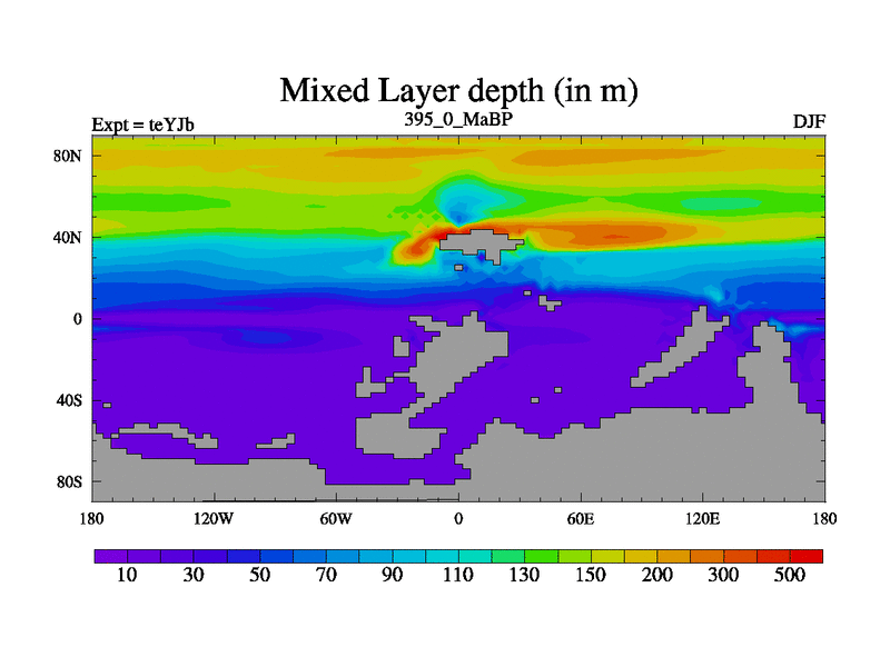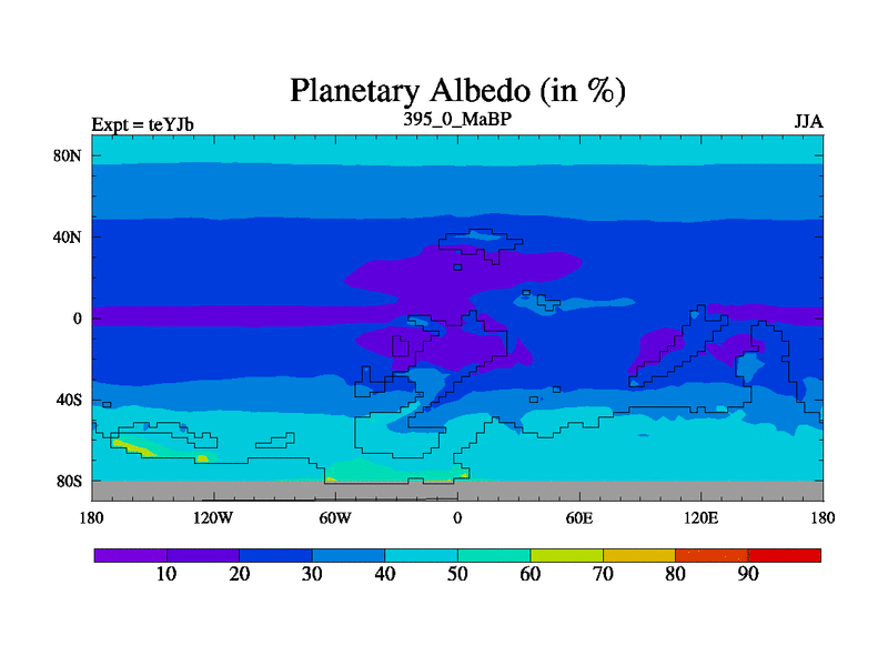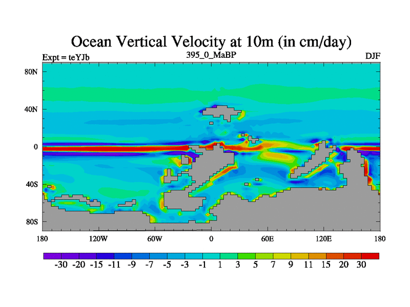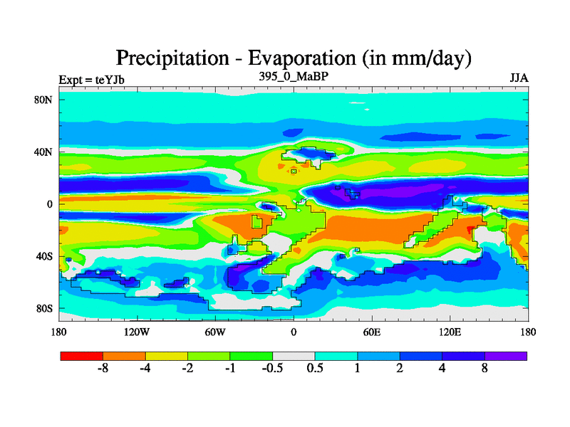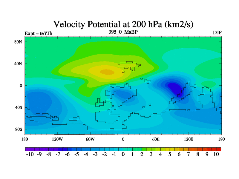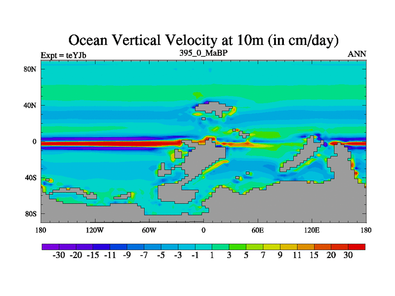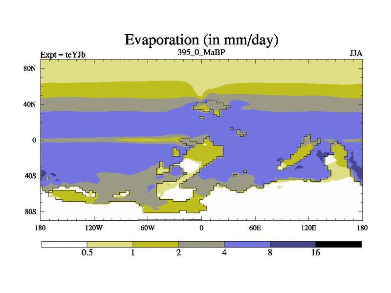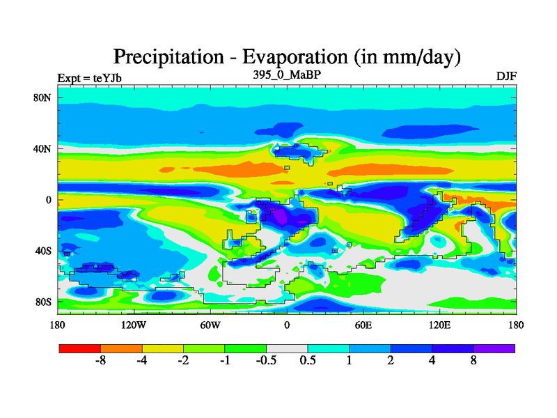 This is the 395.0 Ma simulation using the Scotese palaeogeographies and revised CCN etc. As teyfa3 but corrected orography problem over Antartartica. Now includes ocean biogeochemistry