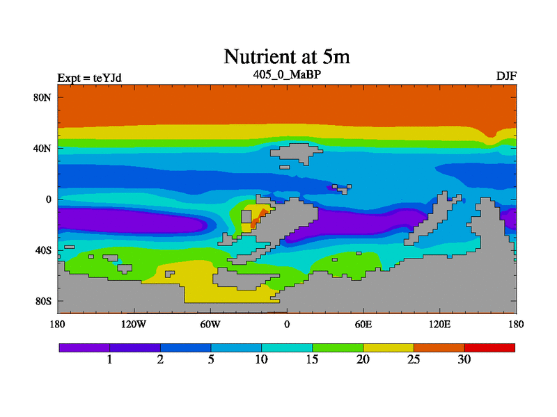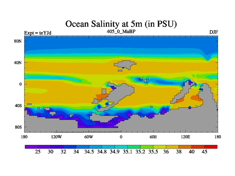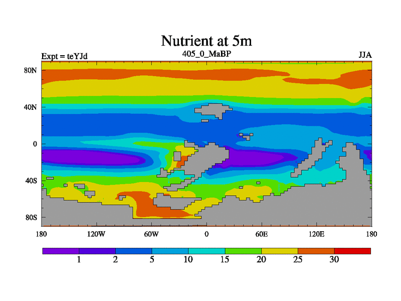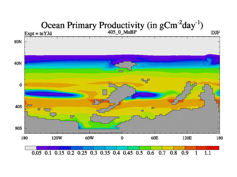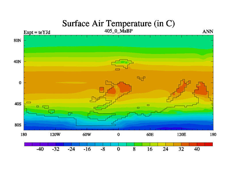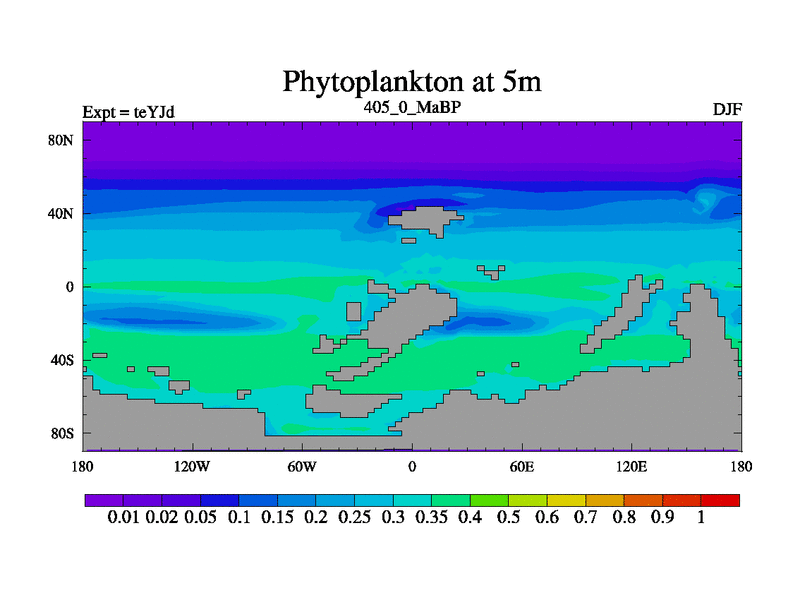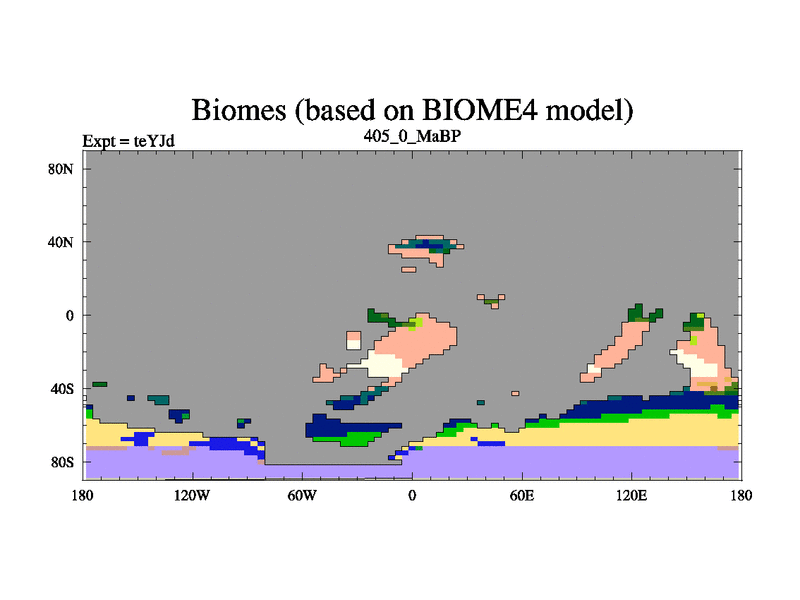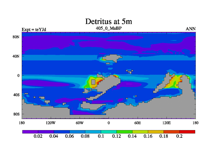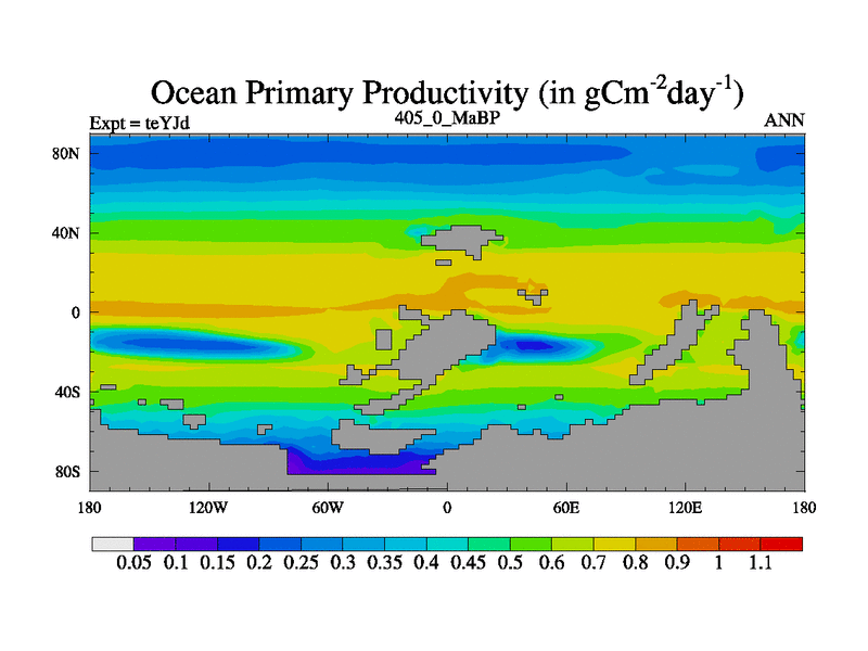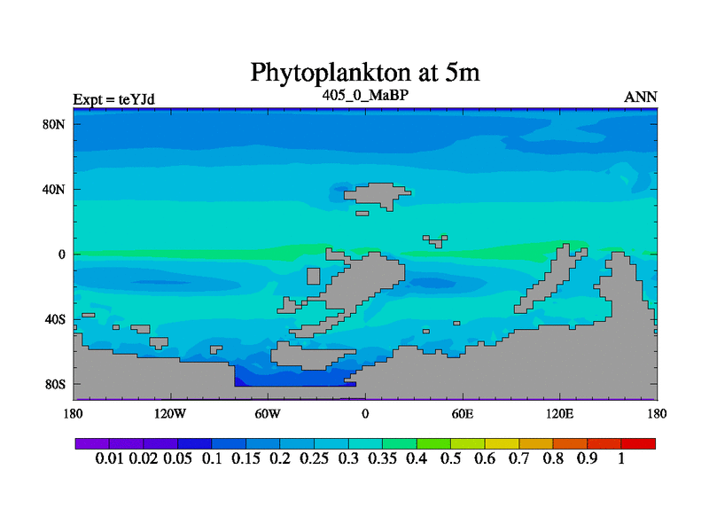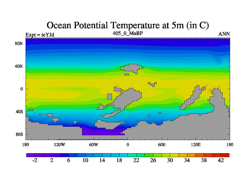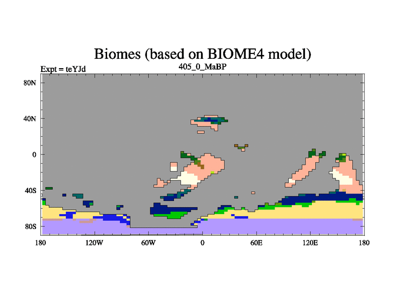This is the 405.0 Ma simulation using the Scotese palaeogeographies and revised CCN etc. As teyfa3 but corrected orography problem over Antartartica. Now includes ocean biogeochemistry