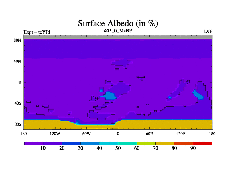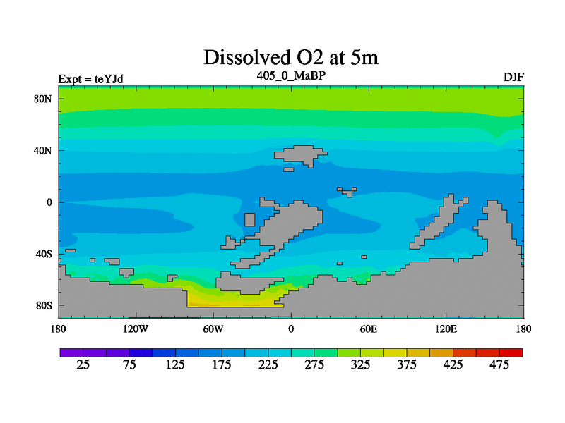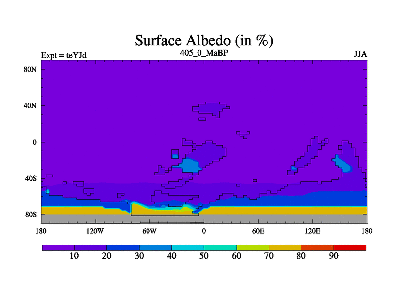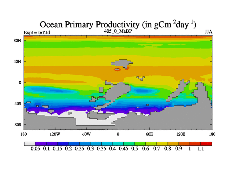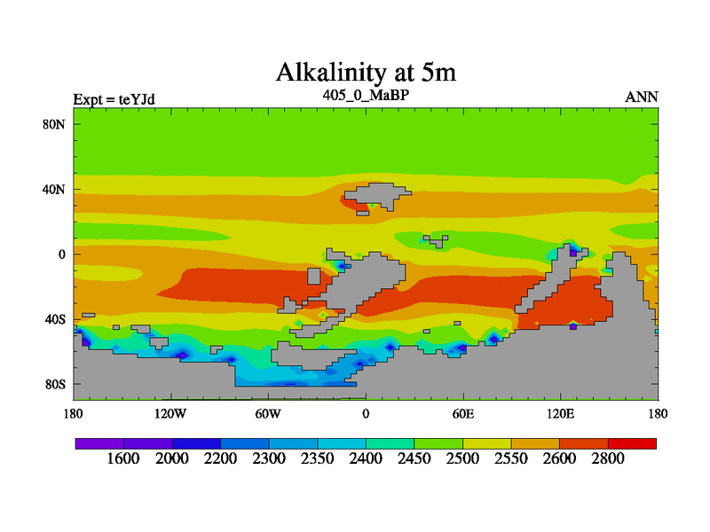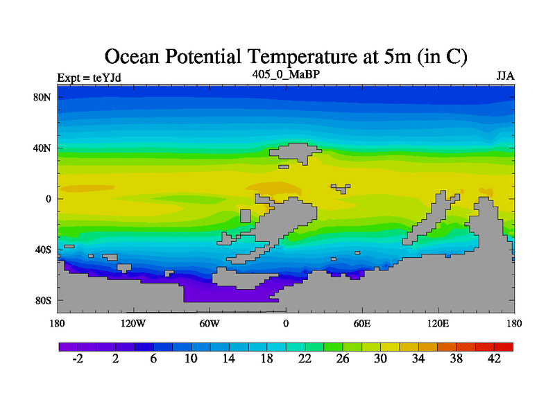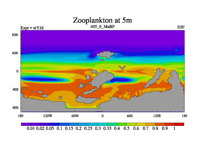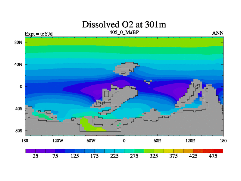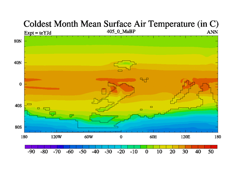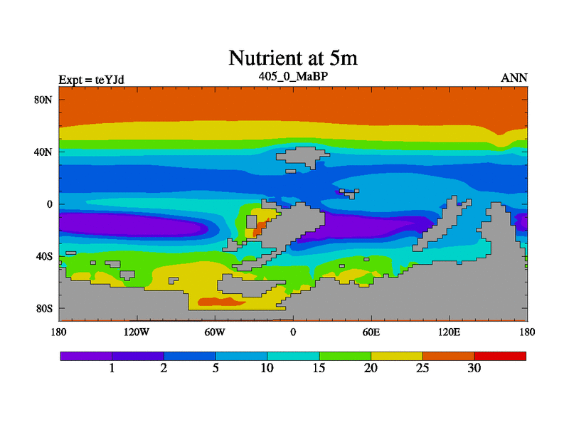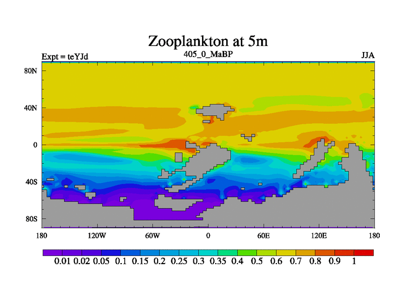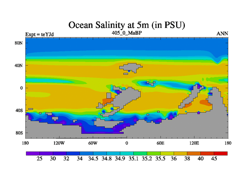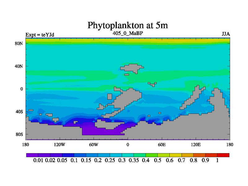 This is the 405.0 Ma simulation using the Scotese palaeogeographies and revised CCN etc. As teyfa3 but corrected orography problem over Antartartica. Now includes ocean biogeochemistry