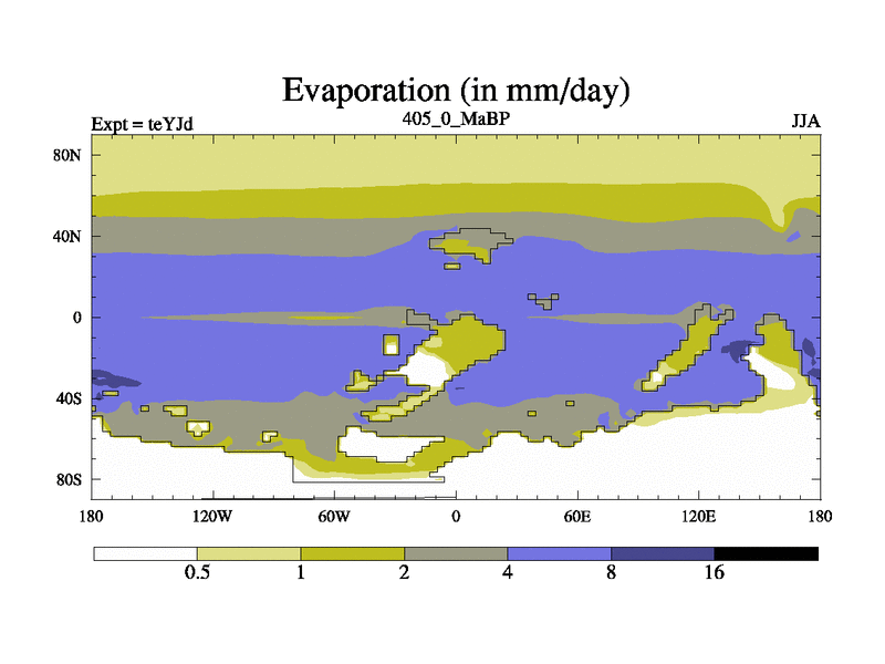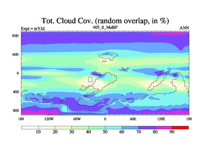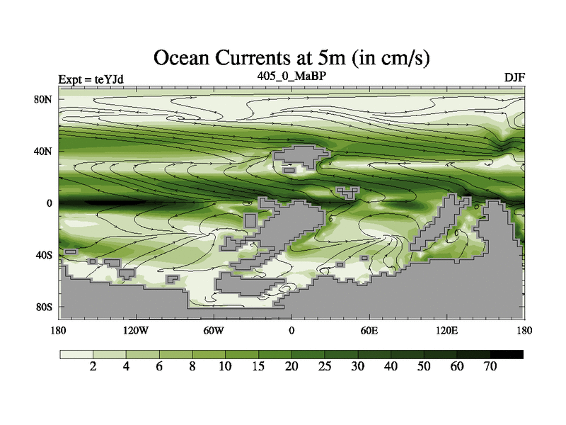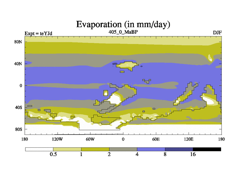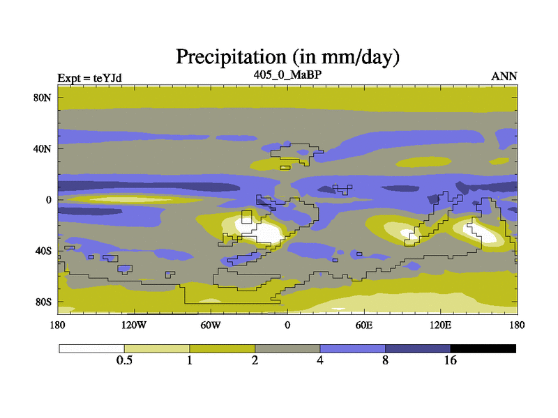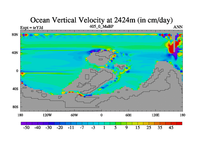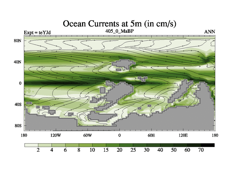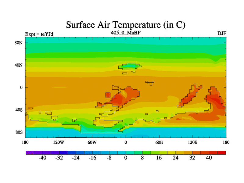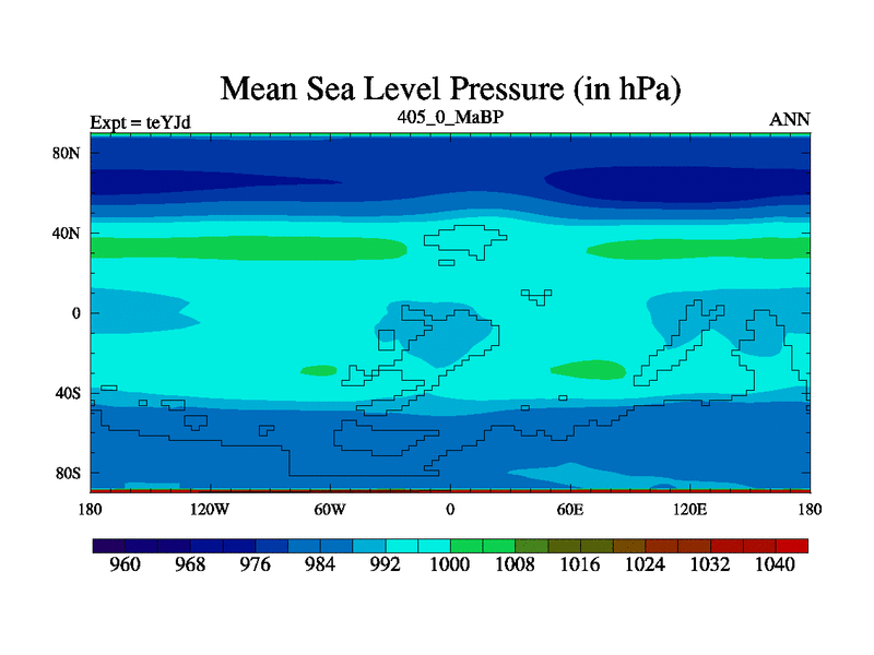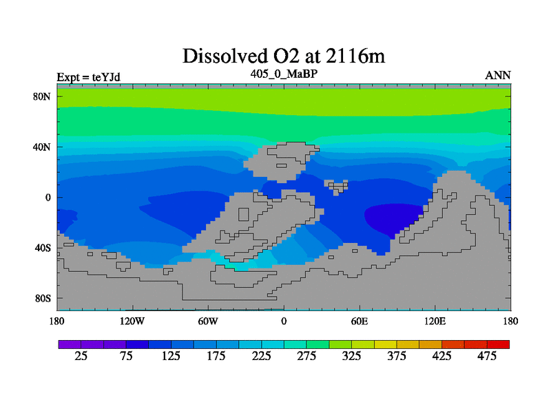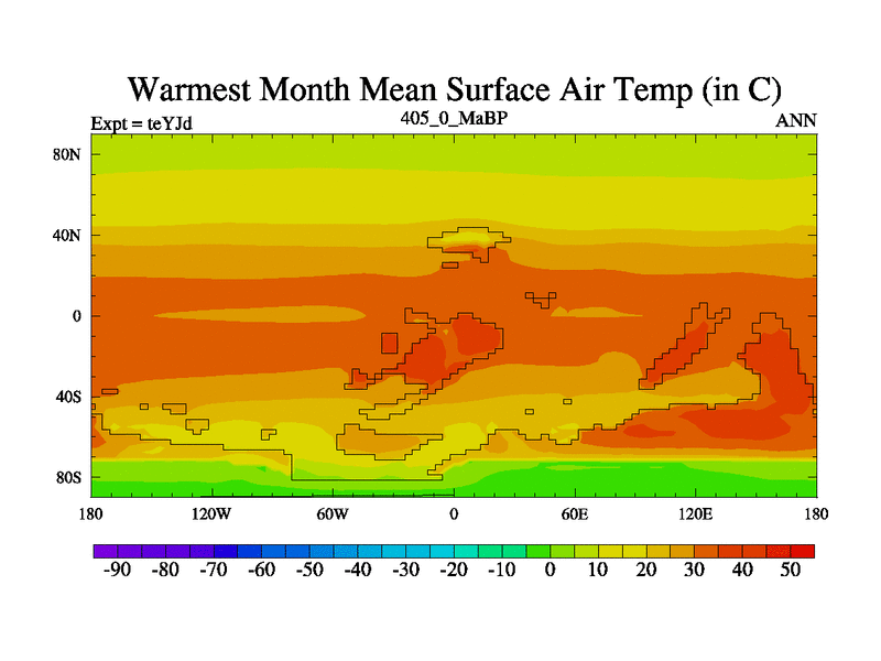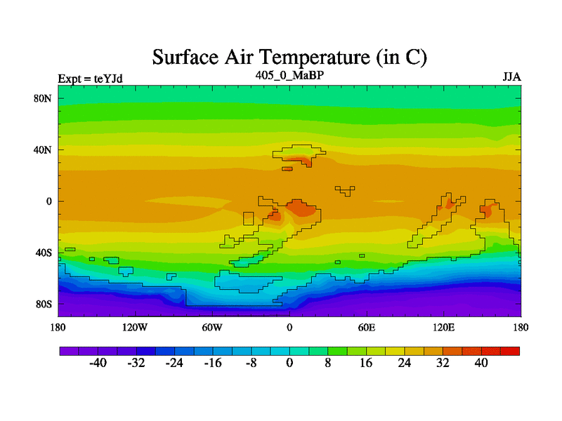 This is the 405.0 Ma simulation using the Scotese palaeogeographies and revised CCN etc. As teyfa3 but corrected orography problem over Antartartica. Now includes ocean biogeochemistry