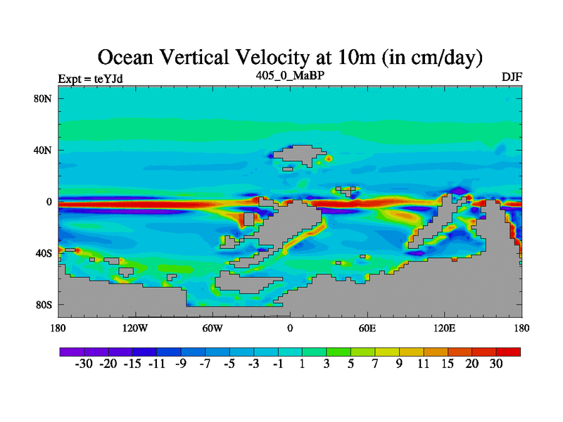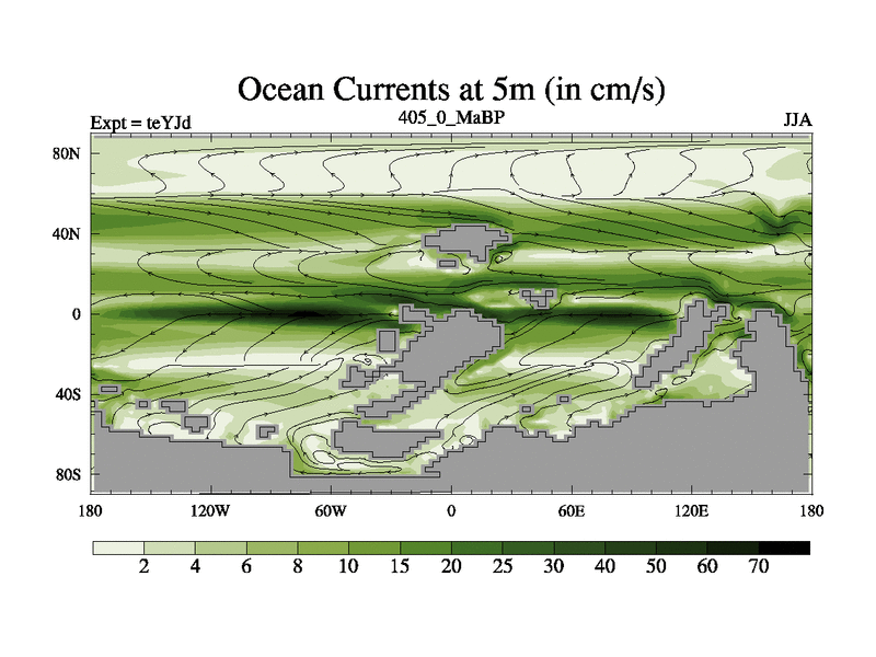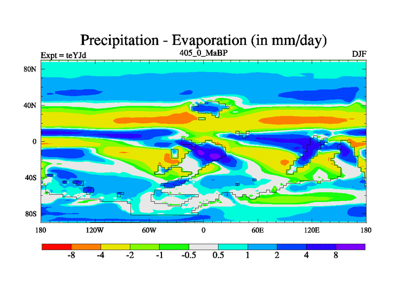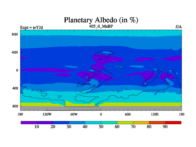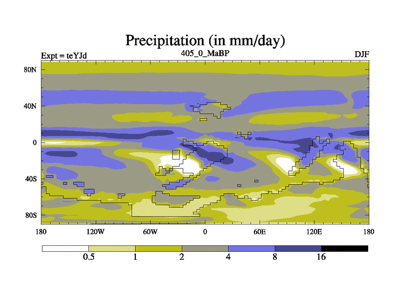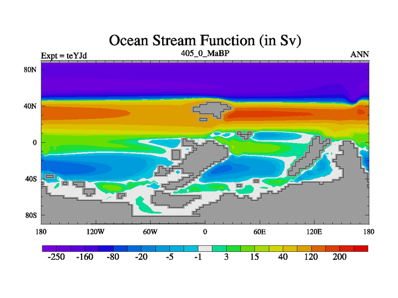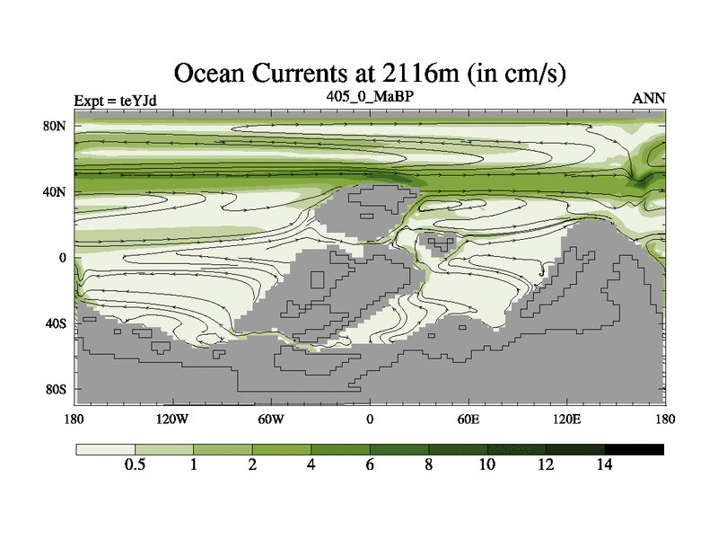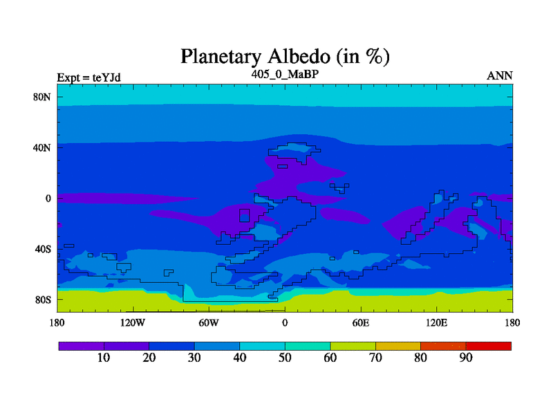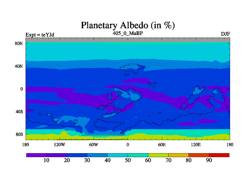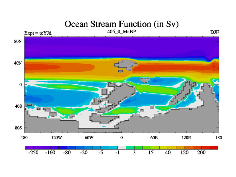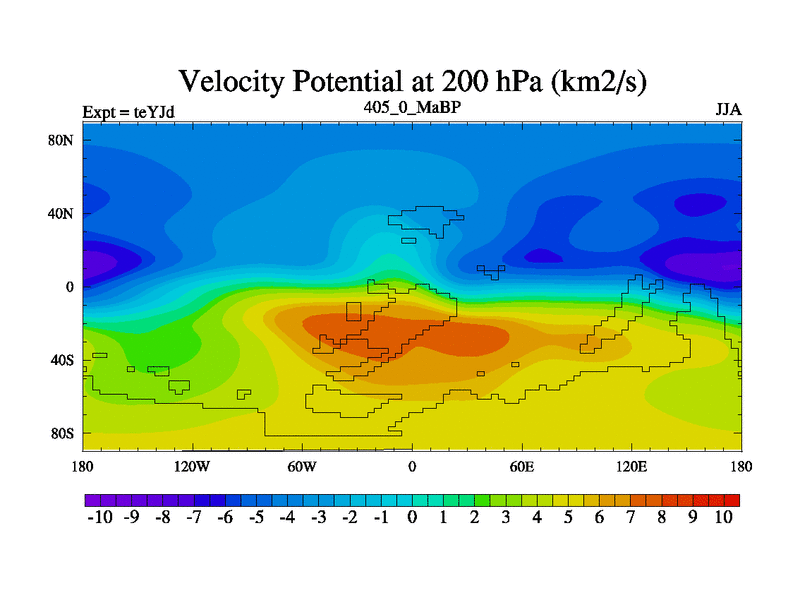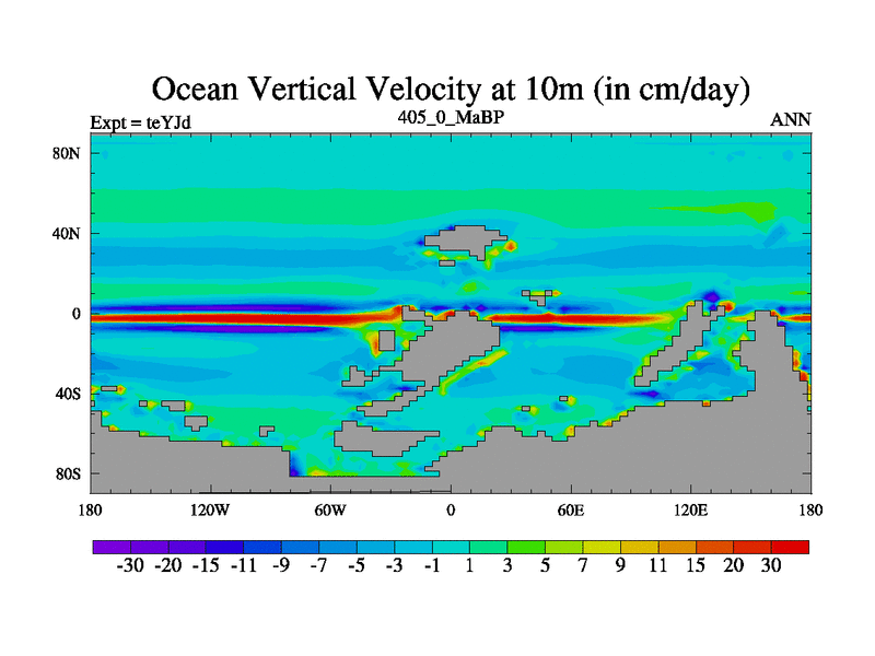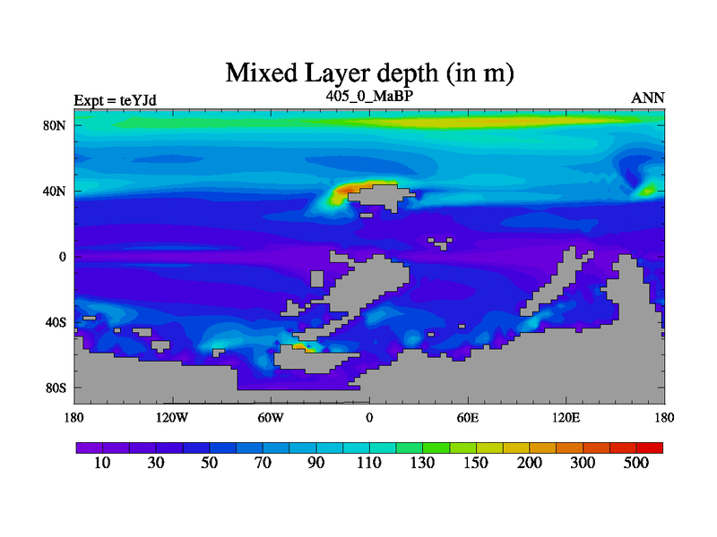 This is the 405.0 Ma simulation using the Scotese palaeogeographies and revised CCN etc. As teyfa3 but corrected orography problem over Antartartica. Now includes ocean biogeochemistry