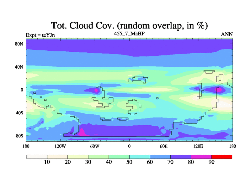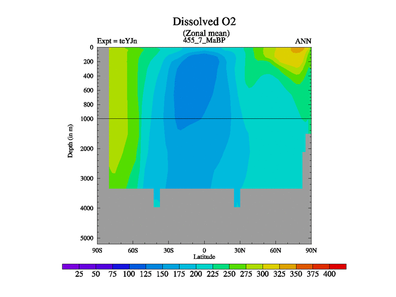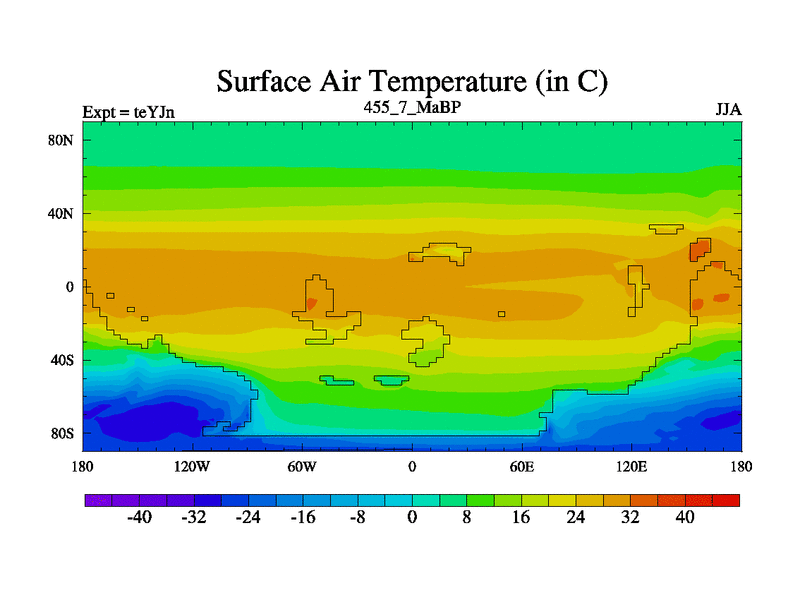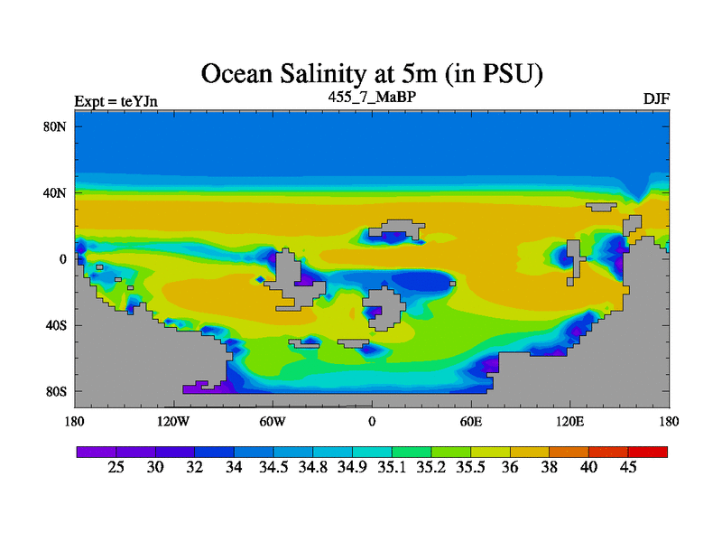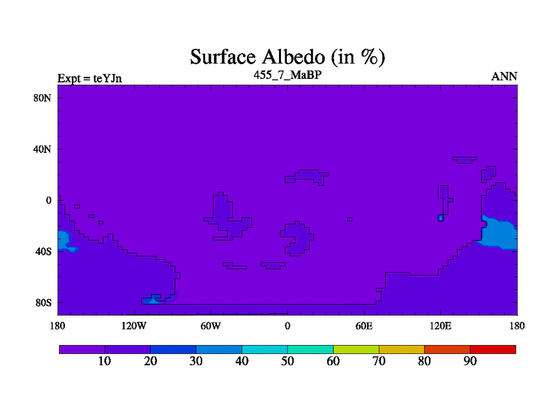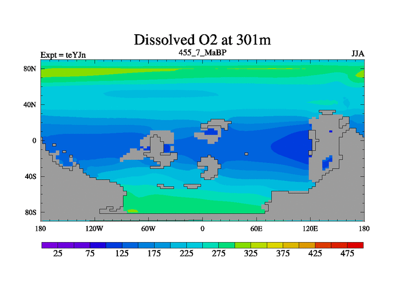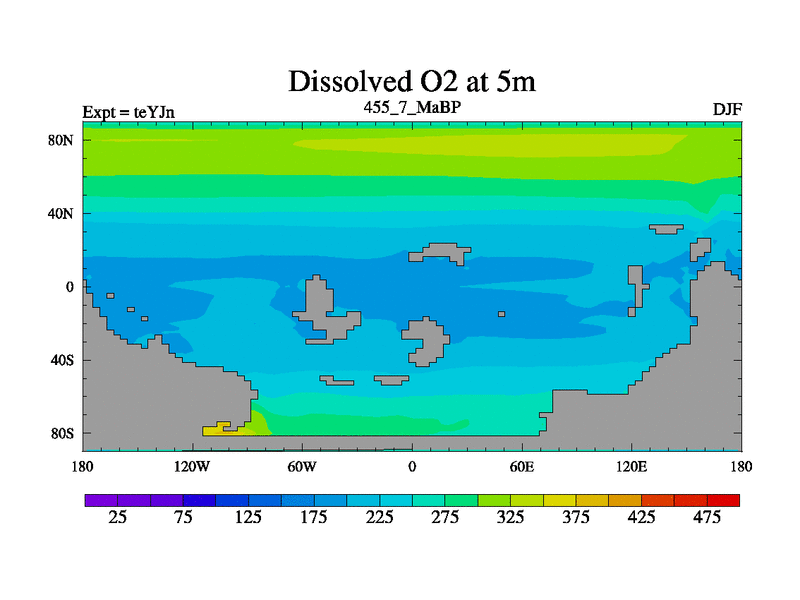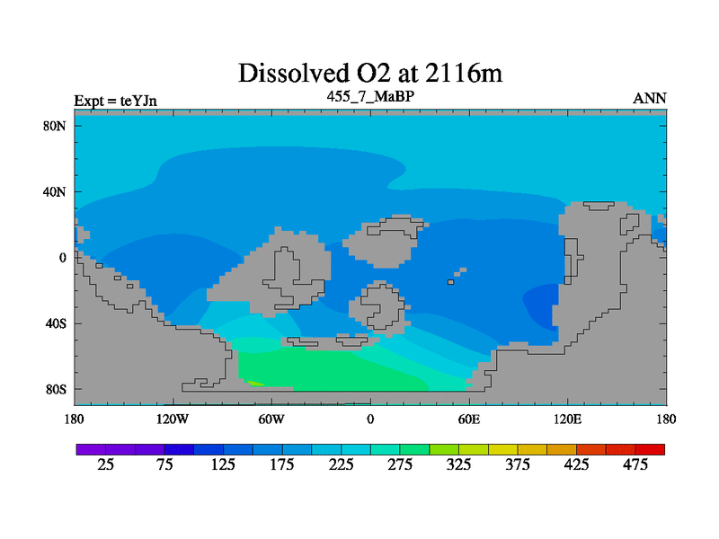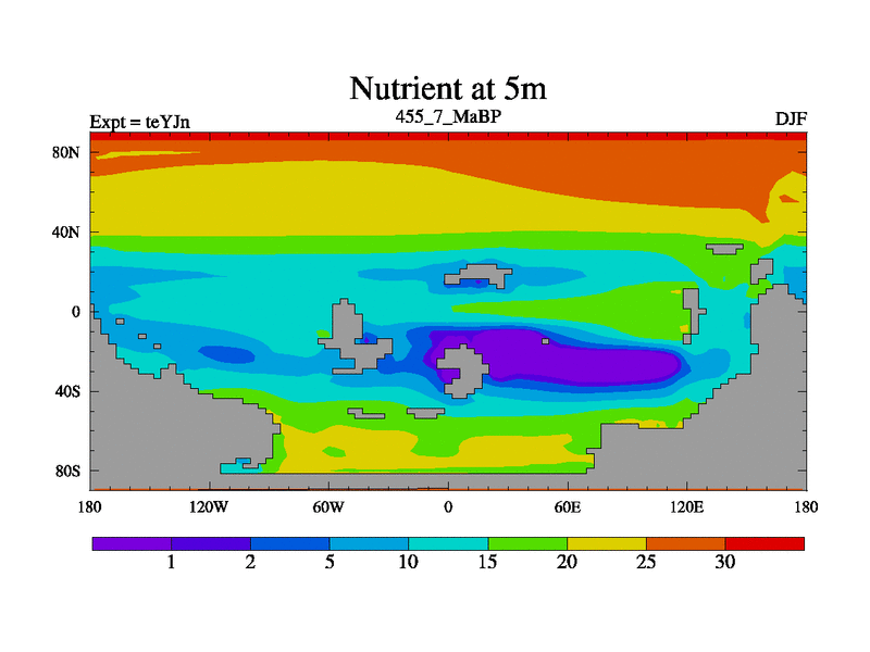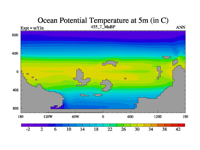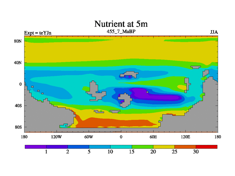 This is the 455.7 Ma simulation using the Scotese palaeogeographies and revised CCN etc. As teyfa3 but corrected orography problem over Antartartica. Now includes ocean biogeochemistry