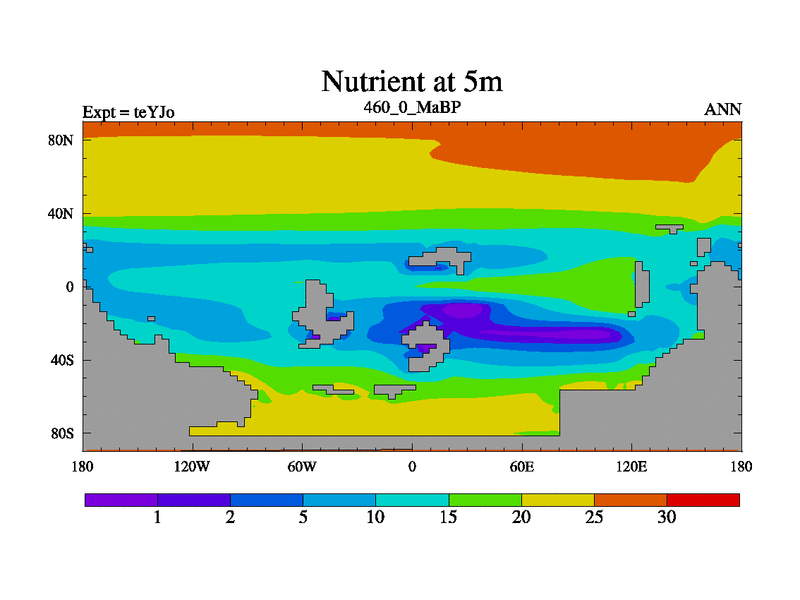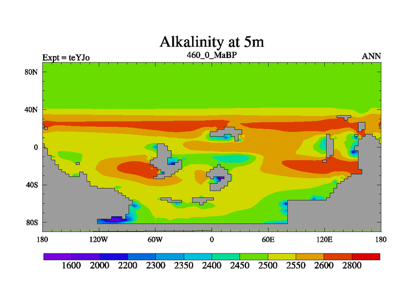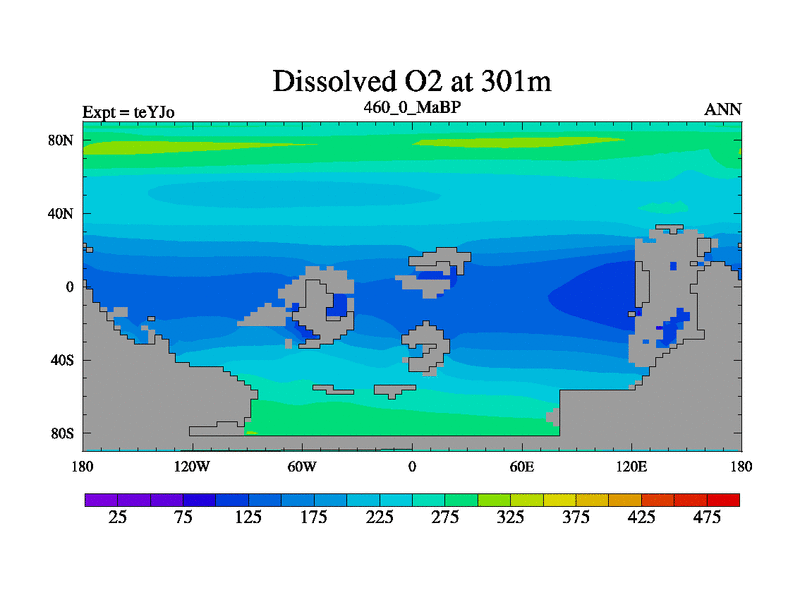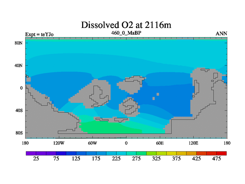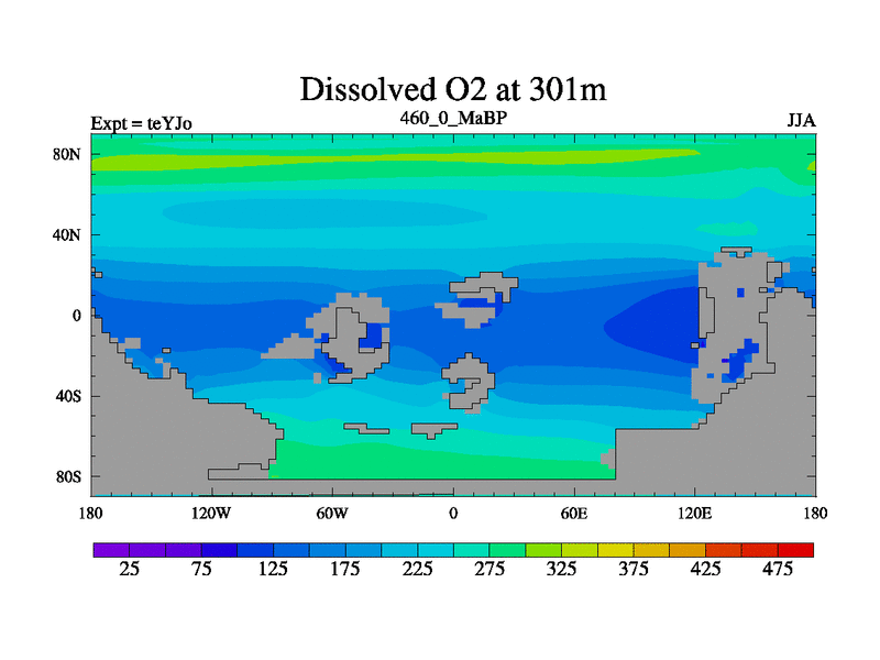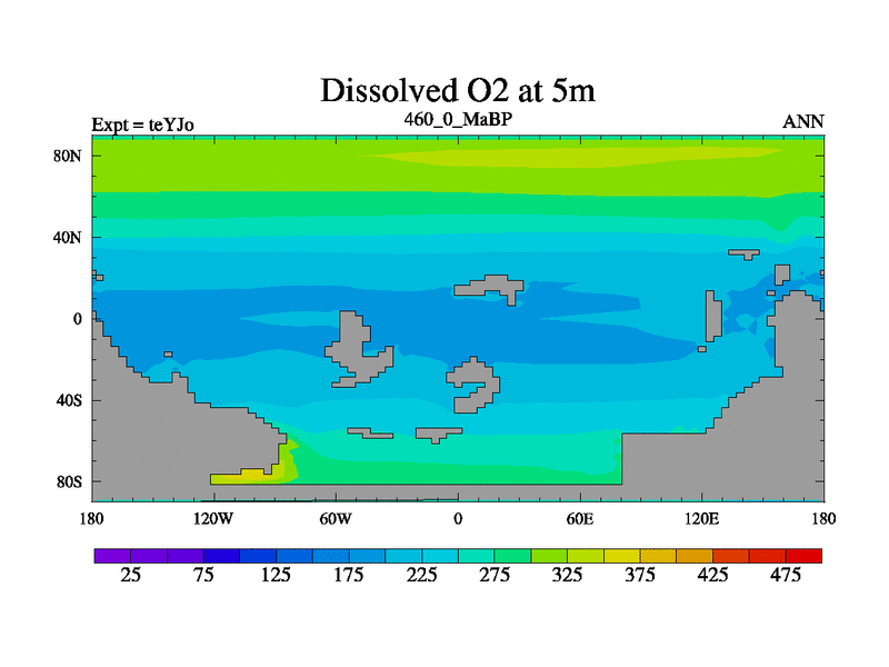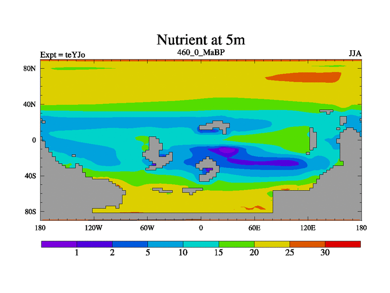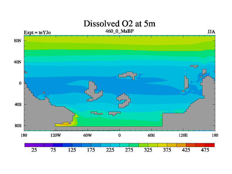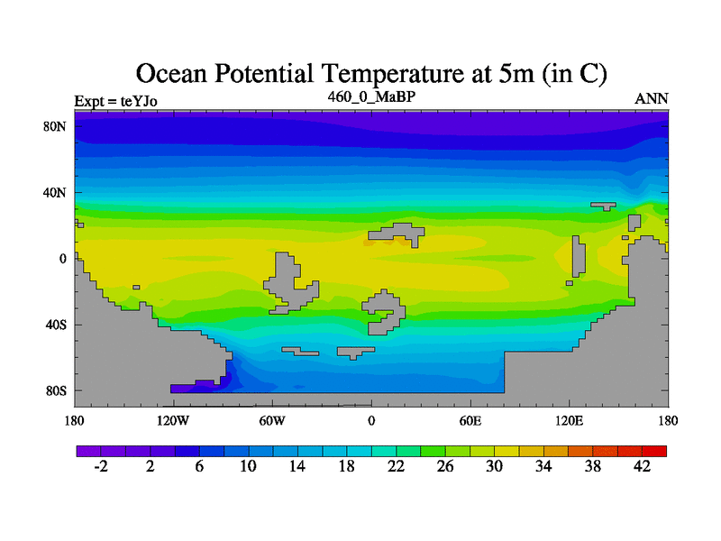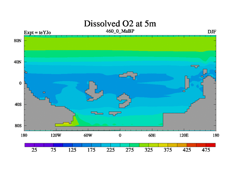 This is the 460.0 Ma simulation using the Scotese palaeogeographies and revised CCN etc. As teyfa3 but corrected orography problem over Antartartica. Now includes ocean biogeochemistry