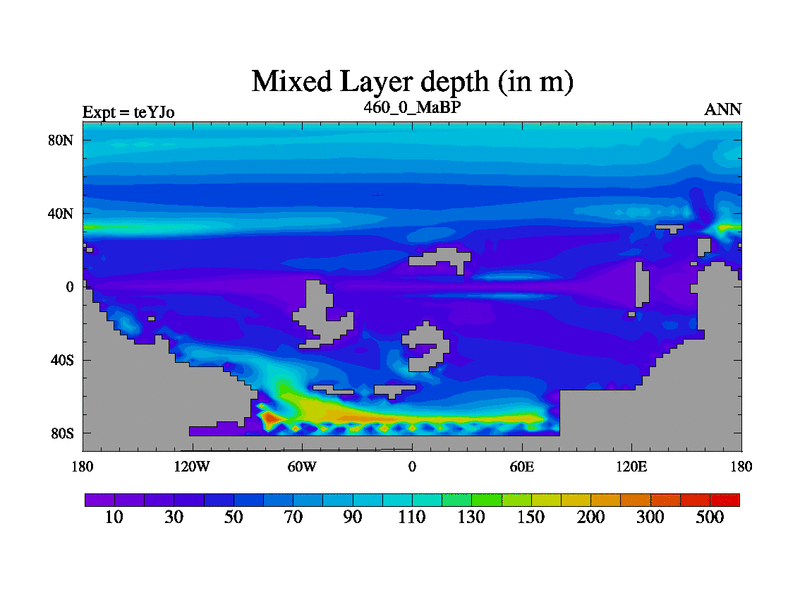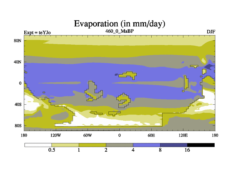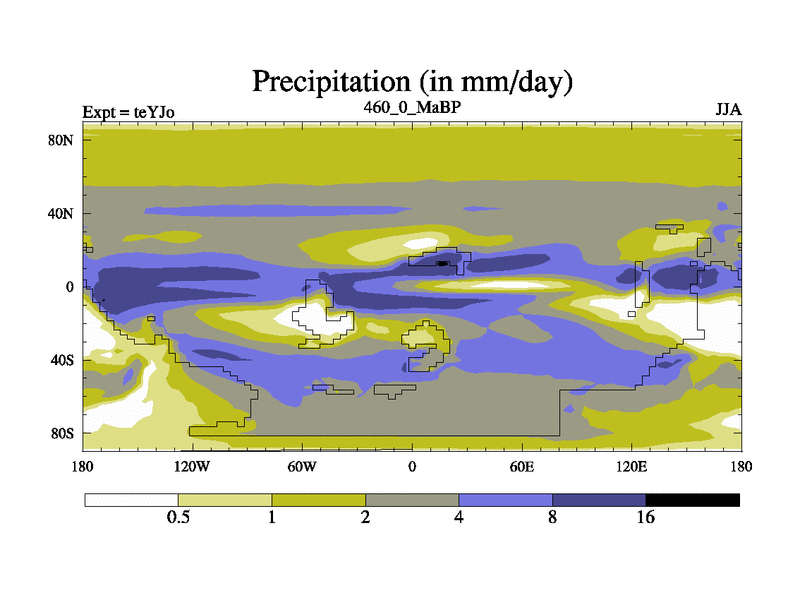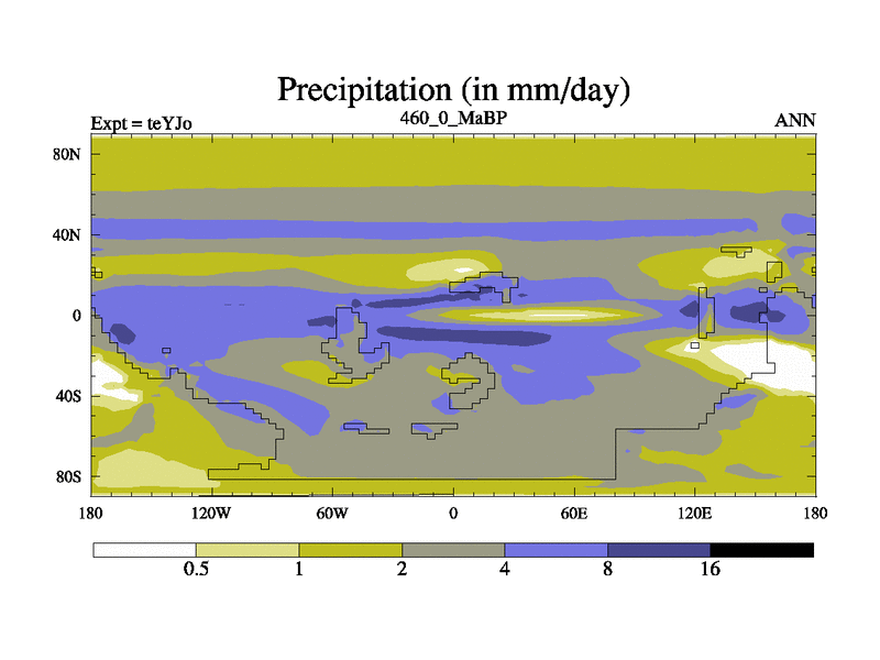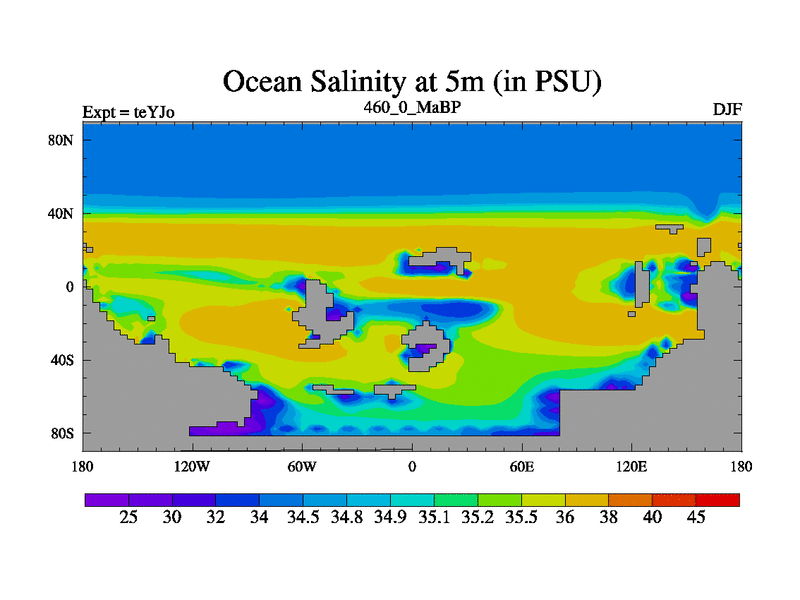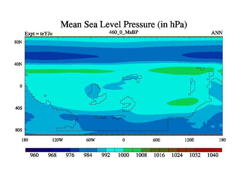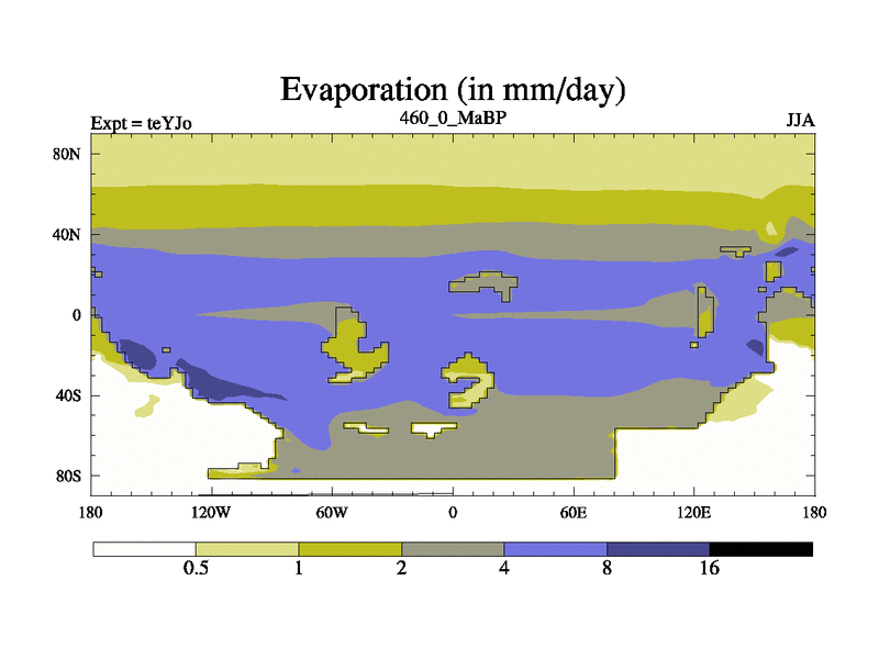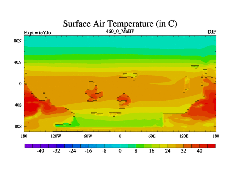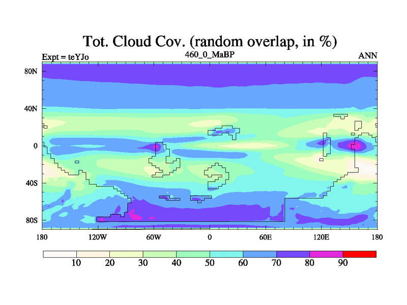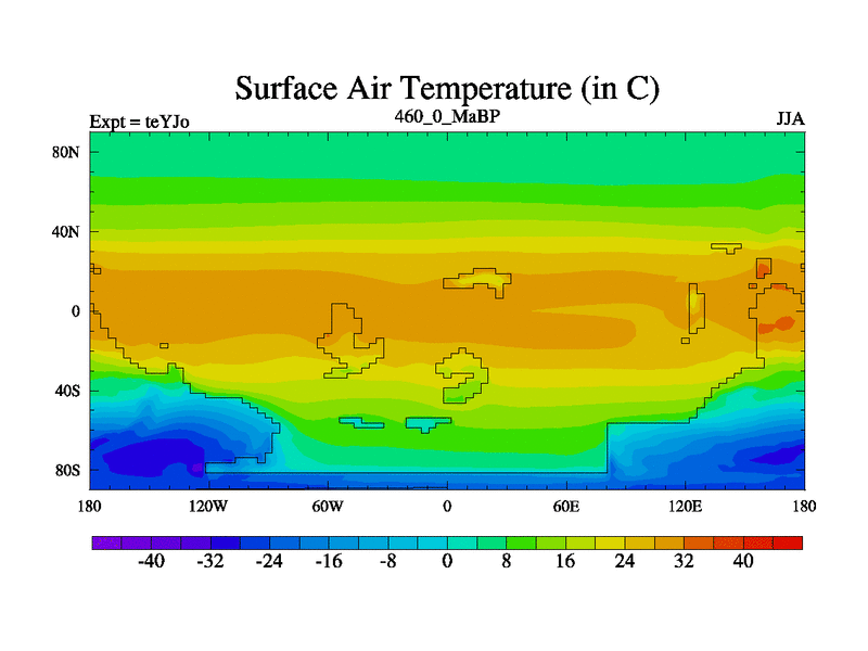 This is the 460.0 Ma simulation using the Scotese palaeogeographies and revised CCN etc. As teyfa3 but corrected orography problem over Antartartica. Now includes ocean biogeochemistry