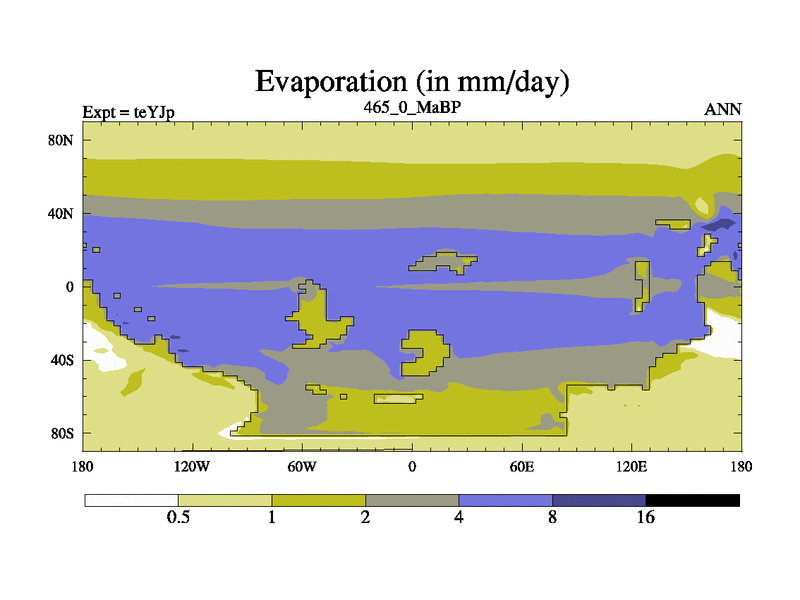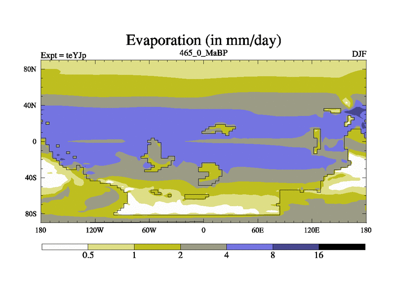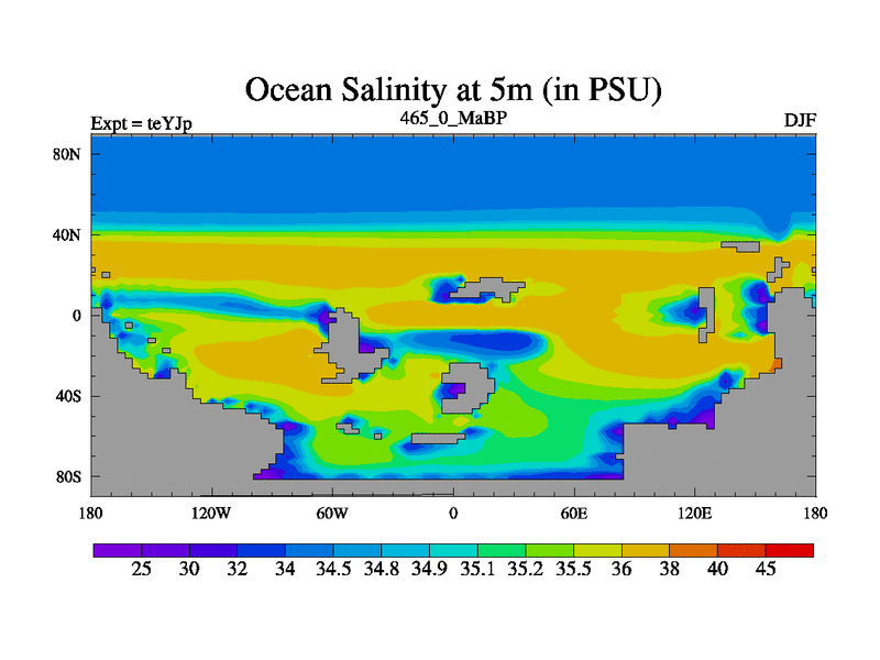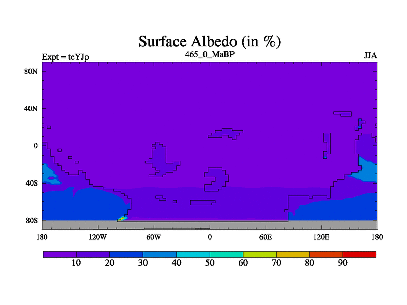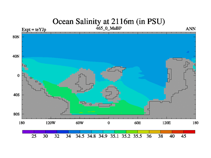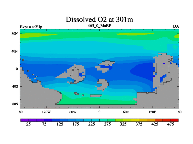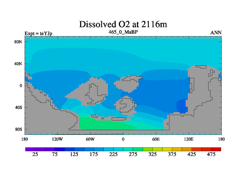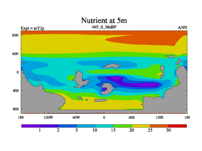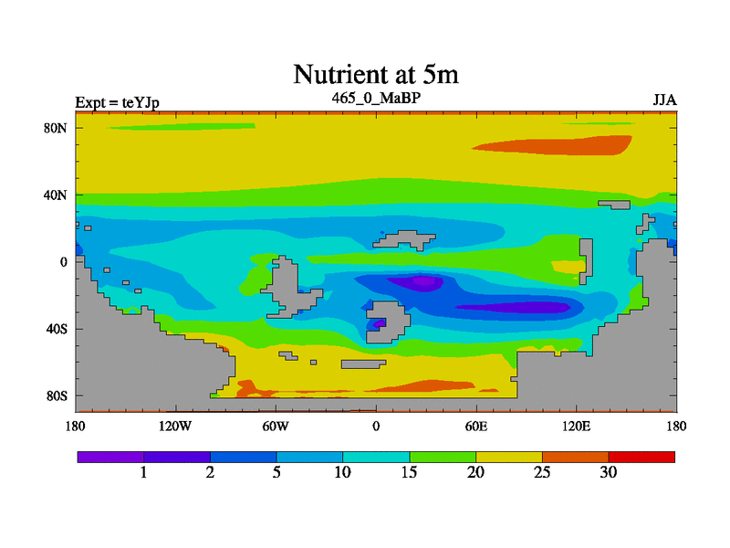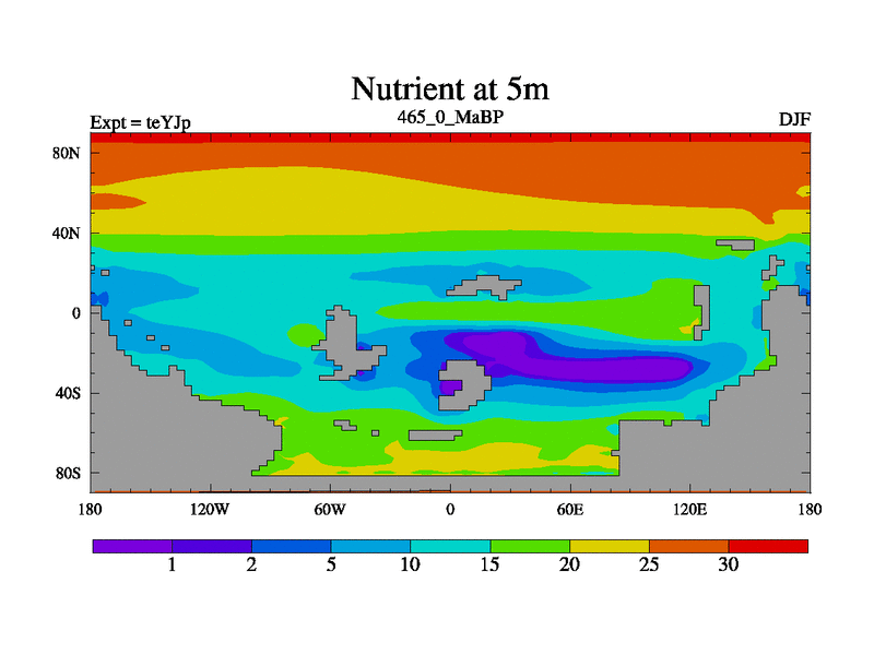 This is the 465.0 Ma simulation using the Scotese palaeogeographies and revised CCN etc. As teyfa3 but corrected orography problem over Antartartica. Now includes ocean biogeochemistry